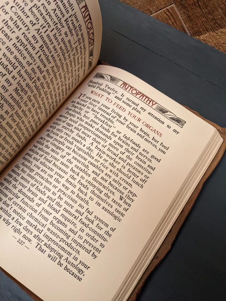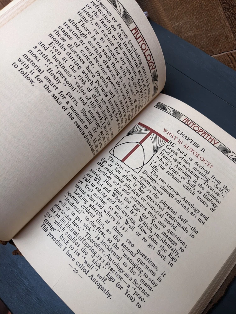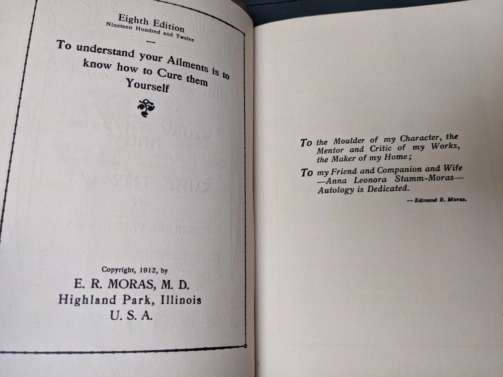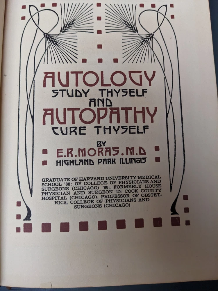 Rare Antique 1920 Leather Autology Study Thyself and Autopathy Cure Thyself by E.R. Moras, M.D. **Very good condition for age of book. See photos. No marks or highlighting. No torn pages seen. Amazing content, wealth of knowledge** Autology study thyself and autopathy cure thyself by ER Moras, highland park, Illinois. Graduate of Harvard University Medical School '88; of College of physicians and surgeons (chicago)'89; formerly House Physician and Surgeon in Cook County Hospital (Chicago) Professor of Obstetrics, College of Physicians and Surgeons ( Chicago) Describes how to cure yourself (1912) Covers germs, diseases, consumption, gorging , blood and other bodily functions.