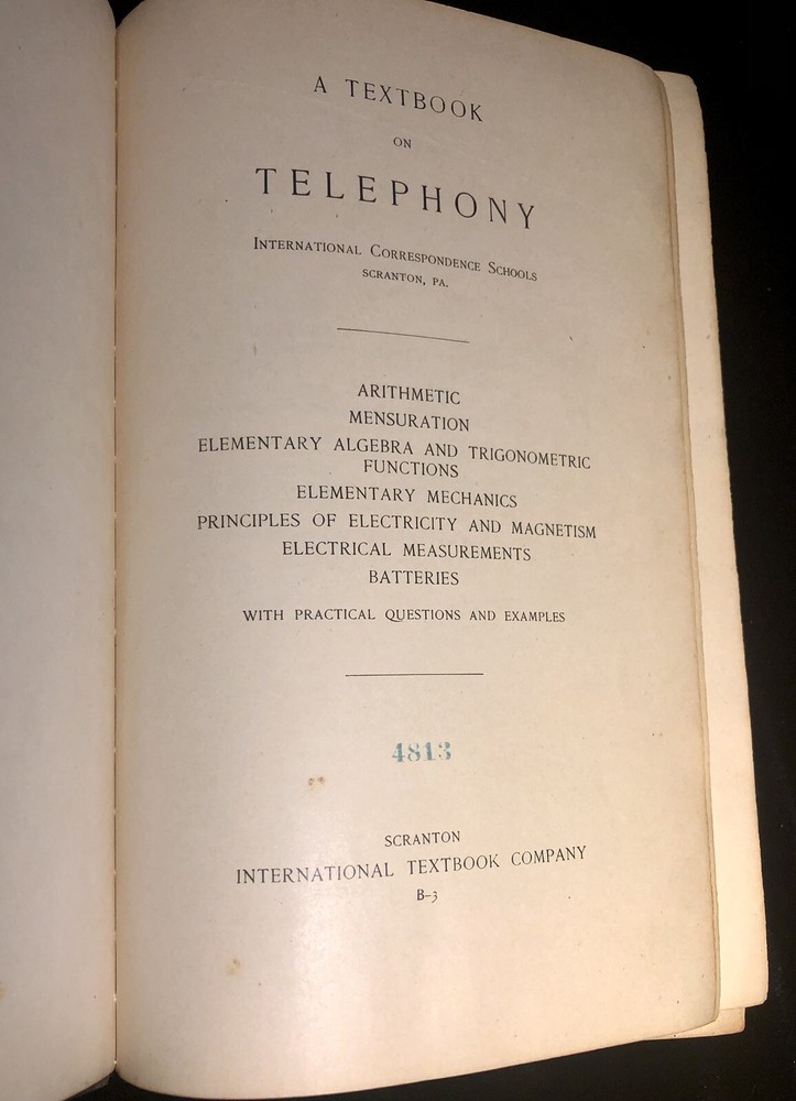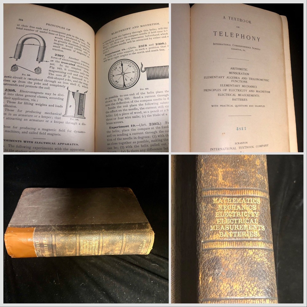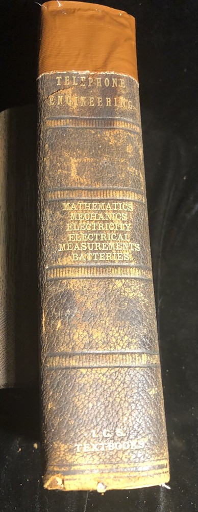 This rare book from 1899 is a must-have for anyone interested in telephone engineering. The leatherbound cover adds to this piece of Telephone history. The book was authored by I.T.C. and published by International Textbook Company. It is an original print and a valuable addition to any collection on the subject of early Telephone technology. The book is in good condition book tape used on top of spline (See photo). Pages tight covers attached Spline good except on top of spline where it has leather missing but repaired with Book tape.Don't miss out on the chance to own a piece of history. Book measures 9” tall by 6” wide. Shipped carefully and fast priority mail flat rate envelope insured