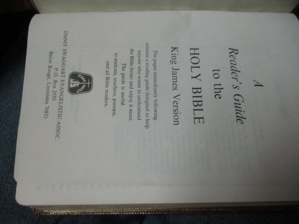 Readers Guide to Holy Bible, KJV, Large print, Jimmy Swaggart, leather bound with 1028 pages Old Testament & 313 pages New Testament, VG