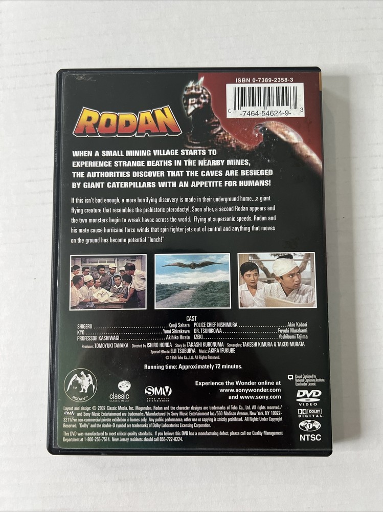 Experience the thrill of the classic Japanese movie "Rodan" on DVD. This sci-fi and fantasy film, directed by Ishiro Honda and Inoshiro Honda, stars Kenji Sawara as the titular character. The DVD is from the year 2002 and is part of the Toho studio franchise, which includes other popular movies like Godzilla. This DVD is a great addition to any movie collection and is perfect for fans of Japanese cinema. The NR rating makes it suitable for all audiences, and the DVD format ensures that you can enjoy the movie for years to come. Don't miss out on this opportunity to own a piece of movie history. BUY MORE AND SAVE! Buy 2 Get 1 FREE!!! DISCOUNTED SHIPPING - Flat rate domestic shipping of $5 on Buy 2 Get 1 Free items when all items are purchased together. Location DVD 6
