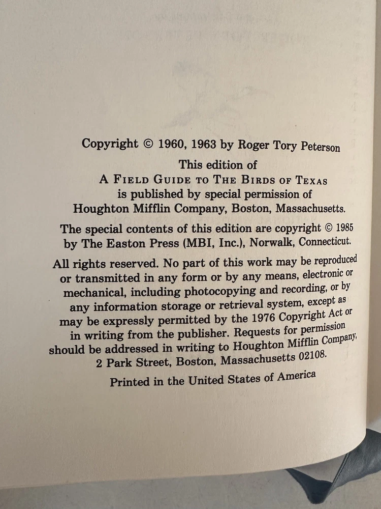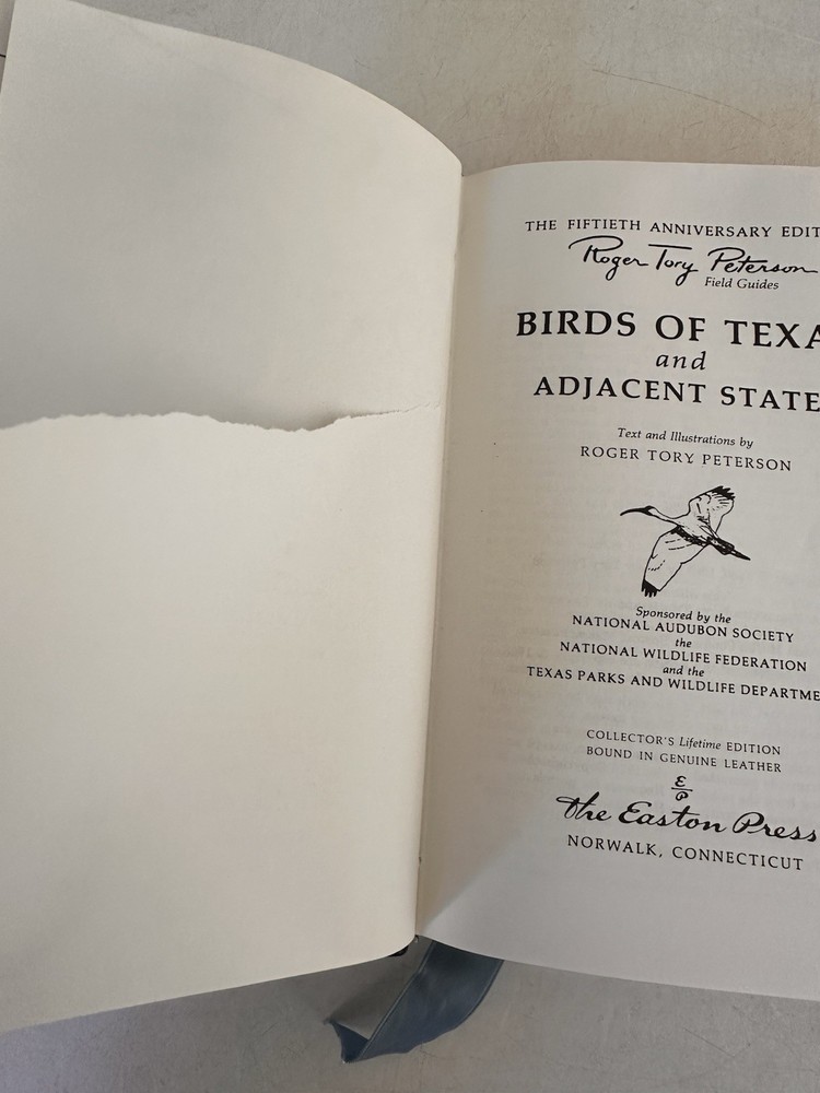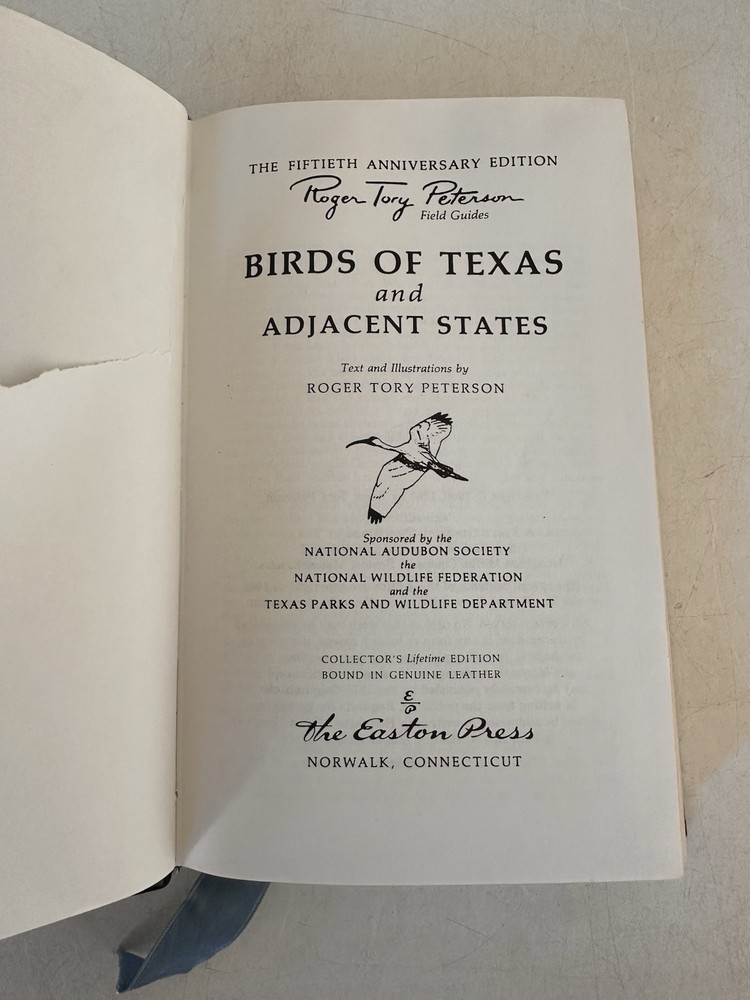 Explore the avian wonders of Texas with the Roger Tory Peterson 50th Anniversary Edition Field Guides - Birds of Texas. This leather-bound collector's edition is a must-have for bird enthusiasts and nature lovers alike. Published by Easton Press, it boasts a rich compilation of information on the diverse bird species found in the region, making it an invaluable resource for both beginners and seasoned ornithologists. Crafted with the highest quality materials, the book is presented in English and is an original print from the renowned author Rogers. It's a celebration of the art of bird watching and a tribute to the timeless fascination with North America's feathered inhabitants. Delve into the field of outdoor and nature studies with this exquisite addition to your library.