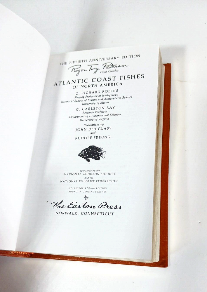 1984 Roger Tory Peterson Atlantic Coast Fishes 0f North America. Easton Press. 50th Anniversary edition. Leather cover. Bookplate included. Gilt edge. Satin ribbon bookmark. 5" x 7 5/8"