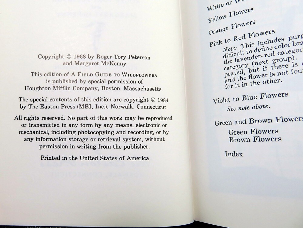 Title: NORTHEASTERN WILDFLOWERS Author: Peterson and McKenny Illustrations: photos, drawings, color and B&W Published: 1984 Easton Press, Norwalk CT About: Wildflower identification Physical Description: Dark green leather over boards, gilt titles and spine, bound in ribbon marker Condition Notes: As new Pages: 420 Dimensions (inches): 7.5 x 5.0 Shipping weight (pounds): 2 SKU: 6910 Powered by SixBit's eCommerce Solution
