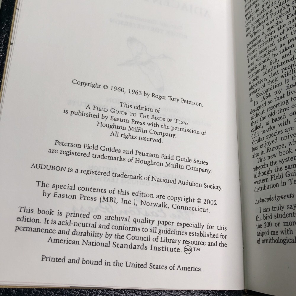 Roger Tory Peterson's expertise in ornithology shines in "Birds Of Texas," a treasured addition to any birdwatcher's library. Published by The Easton Press, this hardcover guide from the renowned Roger Tory Peterson Field Guides series is as much a collector's item as it is a resource for identifying the avian species of Texas. The 2002 Collector’s Lifetime Edition, bound in leather and embellished with an illustrated bookplate, represents the fusion of beauty and utility for enthusiasts of the natural world. With illustrations by Roger Tory Peterson himself, the book is not only informative but also visually stimulating, making it a perfect homage to the art of birdwatching. The detailed entries and clear photographs are designed to assist both novices and seasoned ornithologists in their explorations of Texas's rich birdlife. A must-have for anyone intrigued by the diverse bird populations of the Lone Star State.