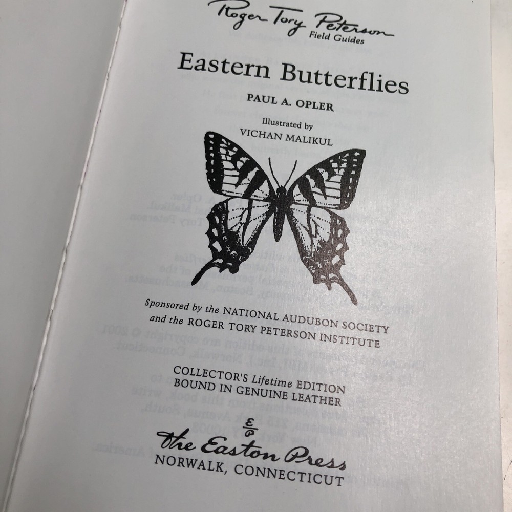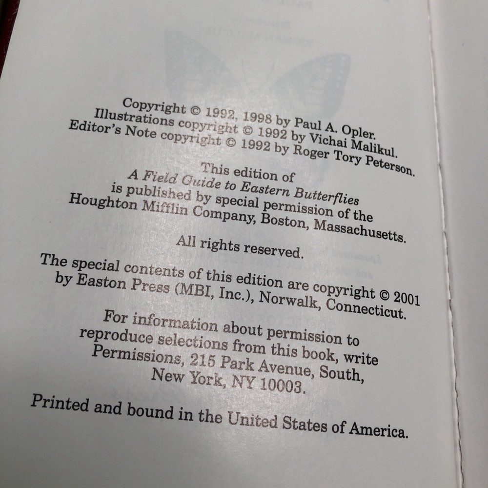 Discover the captivating world of Eastern butterflies with Paul A. Opler's Roger Tory Peterson Field Guides: Eastern Butterflies. This hardcover, collector's lifetime edition published by The Easton Press in 2001, is a treasure for both vintage book collectors and nature enthusiasts. The book is beautifully leather-bound and features exquisite illustrations by Vichan Malikul, enhancing your journey into the diverse world of wildlife. Immerse yourself in the richness of nature with this well-crafted guide, perfect for those interested in the genre of nature and wildlife topics. Explore the intricate beauty of butterflies through detailed accounts and vivid illustrations, all presented in the original English language. This vintage piece, manufactured in the United States, is a stunning addition to any library.