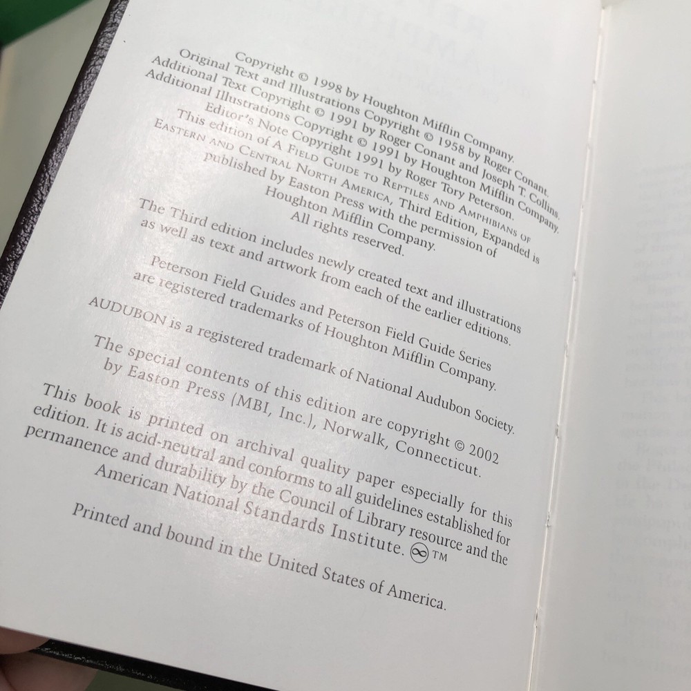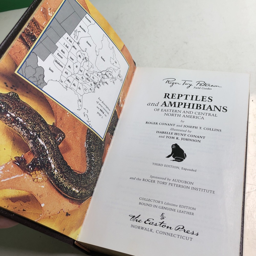 Delve into the fascinating world of Eastern reptiles and amphibians with this Roger Tory Peterson Field Guide. Authored by Conant & Collins, and featuring the distinguished leather-bound hardcover edition, this guide is a treasure for both enthusiasts and scholars. The expert illustrations by Conant & Johnson provide a vivid visual reference, making identification a breeze. Published in 2002 by The Easton Press, this book is a part of the esteemed Roger Tory Peterson Field Guides series. It's a collector's gem, offering comprehensive information on a variety of reptiles and amphibians in the Eastern region. Rich in content and adorned with illustrations, it's an essential addition to any naturalist's library.