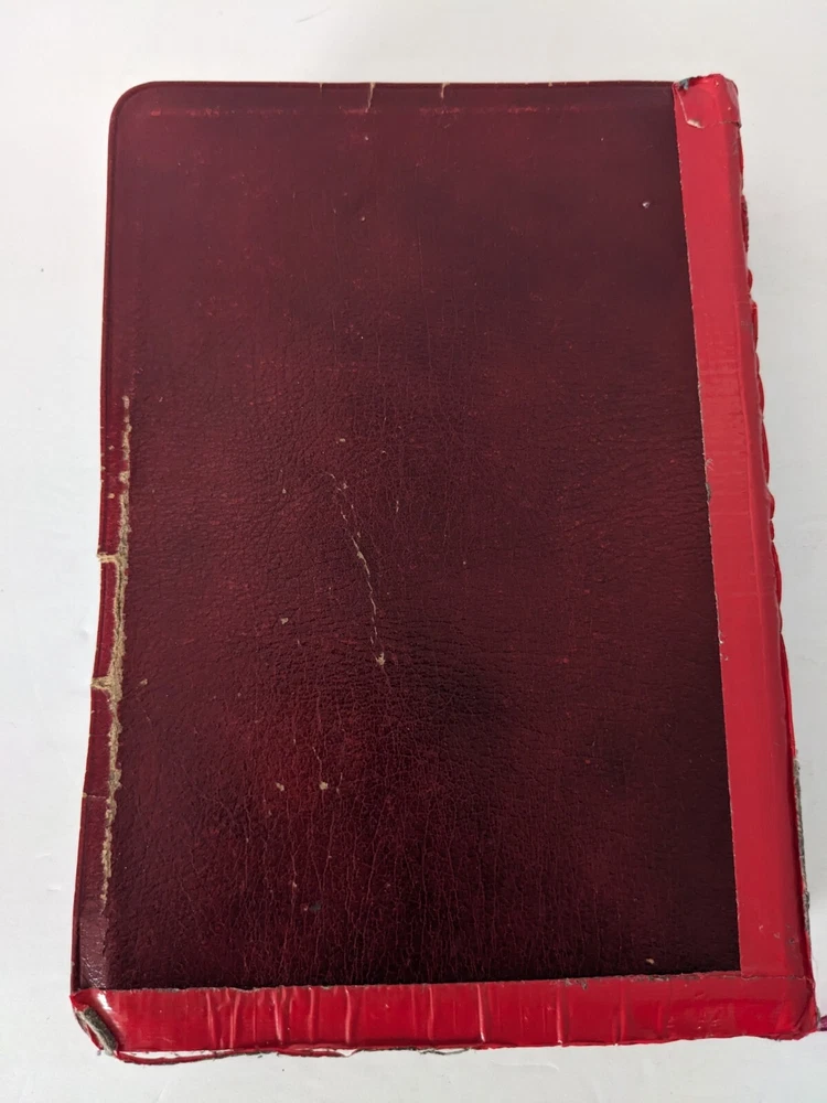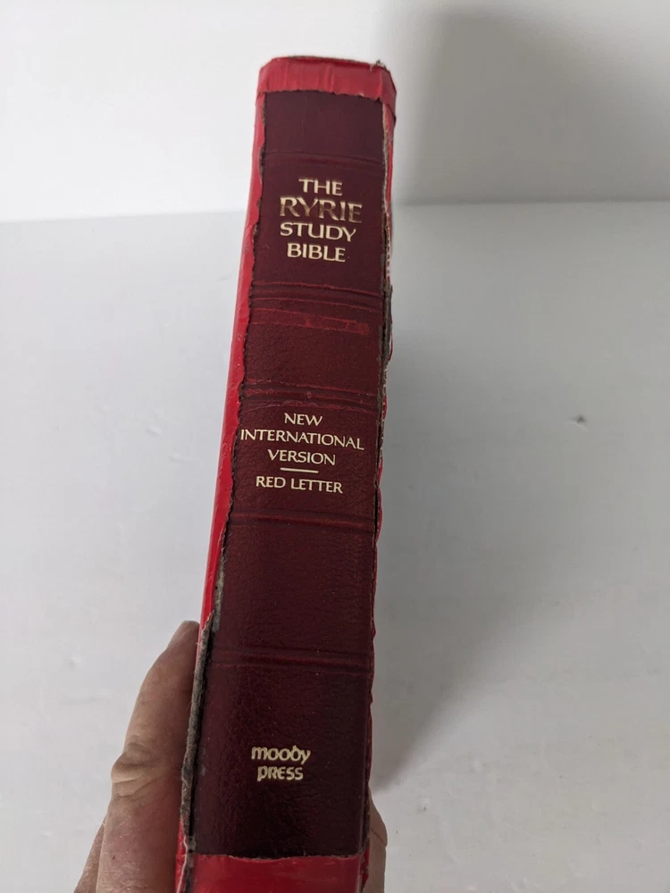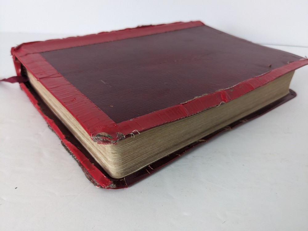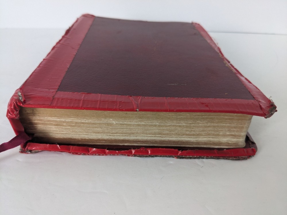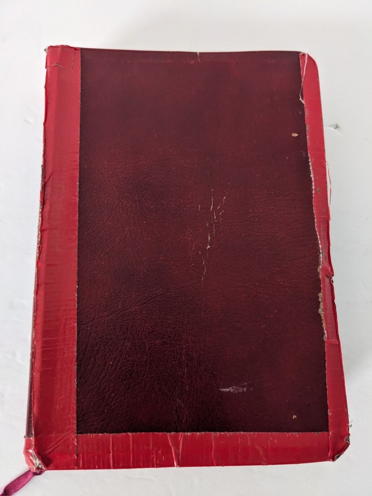 This Bible measures 7 in by 10 in. Burgundy covers. The Bible has strong binding and hinges. Previous owner's name in front. Flipping through the Bible not many marks inside maybe 20 or 30 pages contains marks. Cosmetically the covers do not look good with red duct tape along edges.