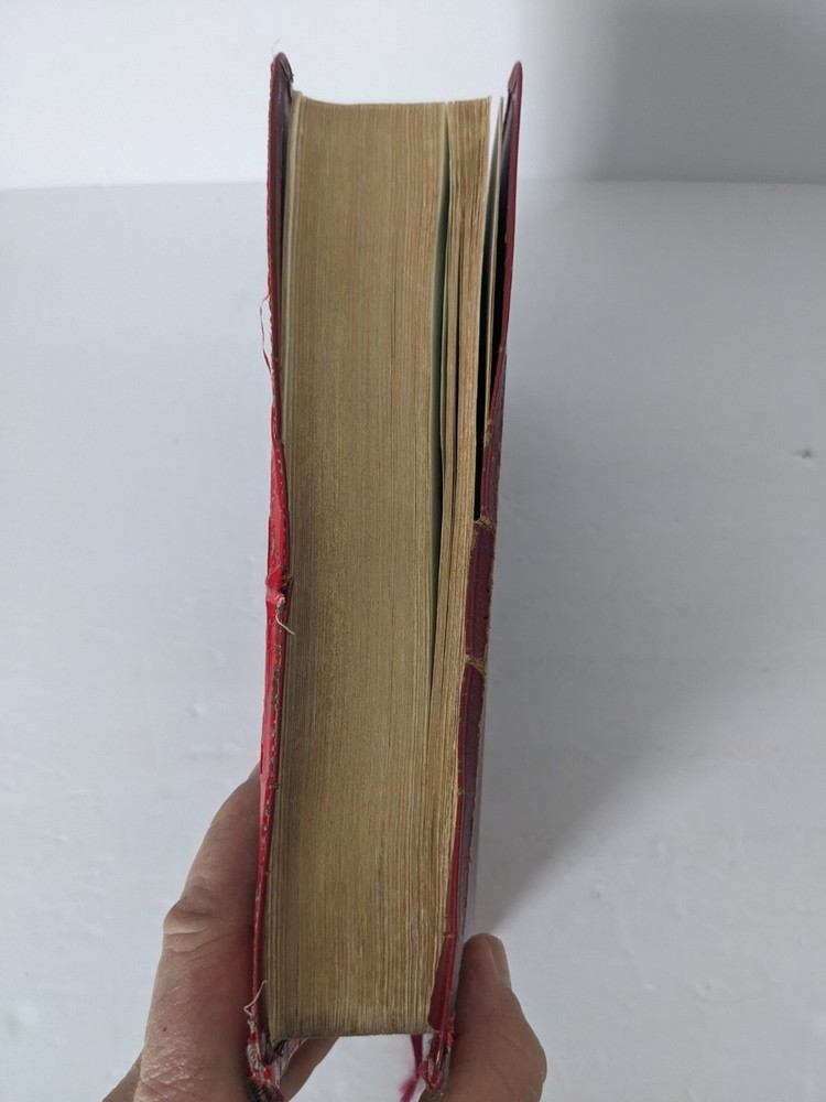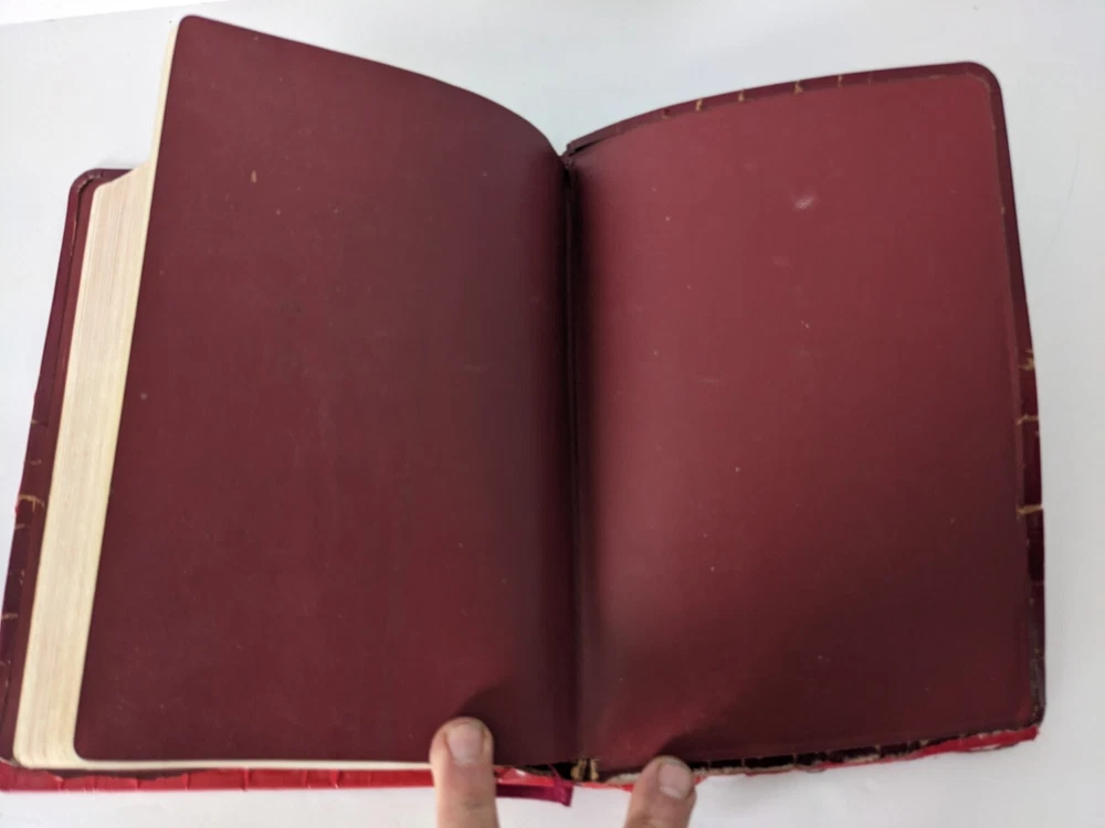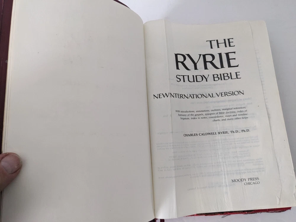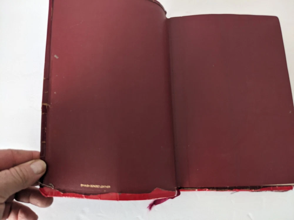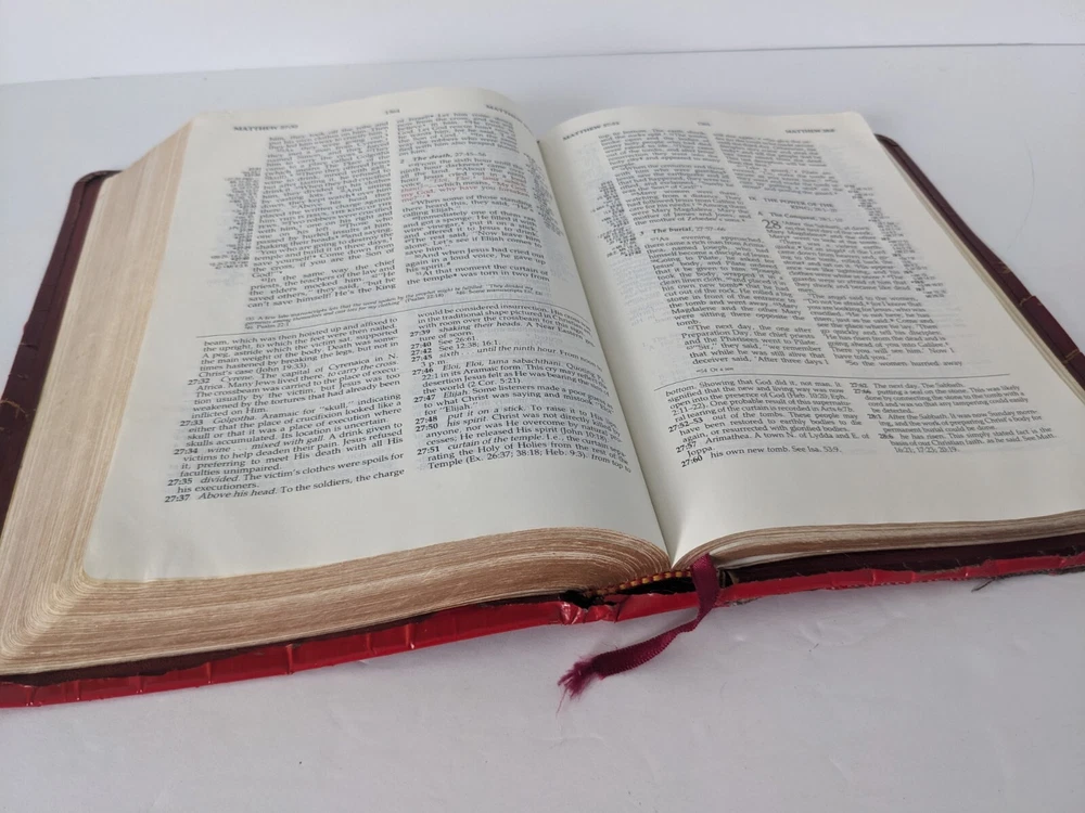 This Bible measures 7 in by 10 in. Burgundy covers. The Bible has strong binding and hinges. Previous owner's name in front. Flipping through the Bible not many marks inside maybe 20 or 30 pages contains marks. Cosmetically the covers do not look good with red duct tape along edges.