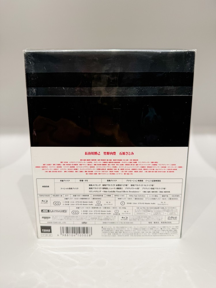 Condition: New (plastic wrap is cut on the front from storage but has never been opened - see image) New Shin Godzilla Special Edition 4K Ultra HD 4 Blu-ray TBR-27002D Japan New F/S Box-office revenue exceeds 8 billion yen! The total audience for the series has exceeded 100 million! The confrontation with the giant unknown creature is depicted with overwhelming reality and unpredictable high-speed development! An innovation in Japanese cinema that should be seen now! Main DISC 4K Ultra HD Blu-ray: 119 min / Dual-layer 66G / CinemaScope size Audio: (1)Japanese 3.1ch dts-HD Master Audio (2)Japanese 2.0ch dts-HD Master Audio Subtitle:(1) Japanese Main DISC Blu-ray: 119min / Dual-layer BD50G / CinemaScope Audio: (1) Japanese 3.1ch dts-HD Master Audio (2 ) Japanese 2.0ch dts-HD Master Audio Subtitle: (1) Japanese Special DISC Blu-ray: BD25G/minutes undecided Promotional videos Campaign footage Special bonus DISC Blu-ray: BD25G/unspecified number of minutes Making of the film ・Outtakes Pre-visualization reel ・Pre-visualization outtakes CG making of the film Special 3-disc set + 1 4K Ultra HD Blu-ray included