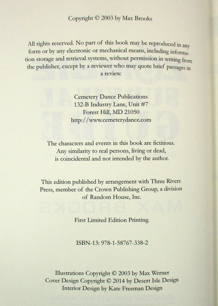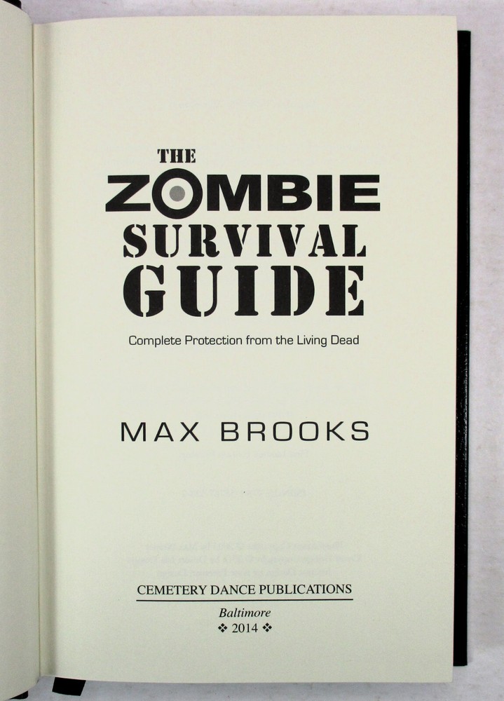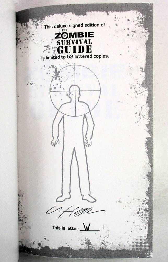 Very Good+ condition leather hardcover copy of The Zombie Survival Guide by Max Brooks. SIGNED by Brooks on limitation page! Limited Deluxe Edition, "W" of 52 lettered copies made! Stated 1st THUS Edition, 1st Printing! Published 2014 by Cemetery Dance Publications in Forest Hill, MD. Binding is sound and pages are unmarked, with the exception of previous owner's bookplate affixed to first pastedown endpaper ans small scratch to silvered exterior head of textblock. Boards are clean and square with small scuff to front fore edge and minimal other shelf wear. Please see photos for condition detail. L-1727