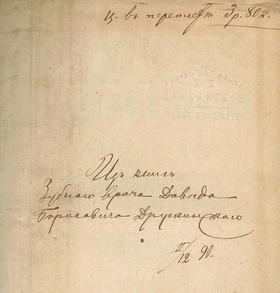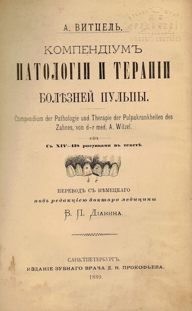Kompendium Patologii i Terapii Boleznei Pulpy [Compendium der Pathologie und Therapie der Pulpakrankheiten des Zahnes, von d-r med. A. Witzel] Author: Witzel, Adolph [Витцель, А.] Title: Kompendium Patologii i Terapii Boleznei Pulpy [Compendium der Pathologie und Therapie der Pulpakrankheiten des Zahnes, von d-r med. A. Witzel] Publication: St. Petersburg: Izdanie zubnogo vracha D. N. Prokofeva, 1889 Edition: Russian translation edited by Dianin, V. P. Description: Contemporary half-leather binding with gilt-tooled leather spine; original wrappers not preserved. Fair. Octavo (23.5 × 16.5 cm). 198 pages. 128 illustrations in text. Private embossed stamp (exlibris) of the Russian dentist, Druzhynsky, David Borisovich on the flyleaf and his (?) handwritten notation "Iz knig zubnogo vracha Davida Borisovicha Druzhynskogo II/12 90" [From the books of a Russian dentist, Druzhynsky, David Borisovich]. Some wear to spine. First 15-20 pages slightly rubbed along edges, stained and spotted. A first Russian translation of the important medical book, Compendium der Pathologie und Therapie der Pulpakrankheiten des Zahnes by Adolph Witzel. OCLC shows NO copies of the book. We could find the only copy in the Russian State Library. Seller ID: 54 Subject: Autographs, Russia Rare Paper is an independent bookseller based in New York, exclusively selling on the Internet. We offer a broad selection of rare and out-of-print East European materials focusing on Russian and Ukrainian émigré books. All items are guaranteed to be as described. Terms Each book will be professionally packed to ensure it reaches you without damage. Shipping services will vary based on the size and value of the items purchased. Default shipping is generally USPS Priority Mail. Please let us know if you prefer an alternative shipping method or have questions about a shipment. All orders ship within five business days. We always offer combined shipping on multiple orders. This listing was created by Bibliopolis.