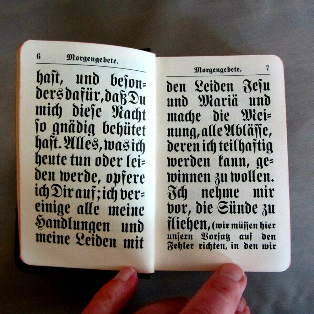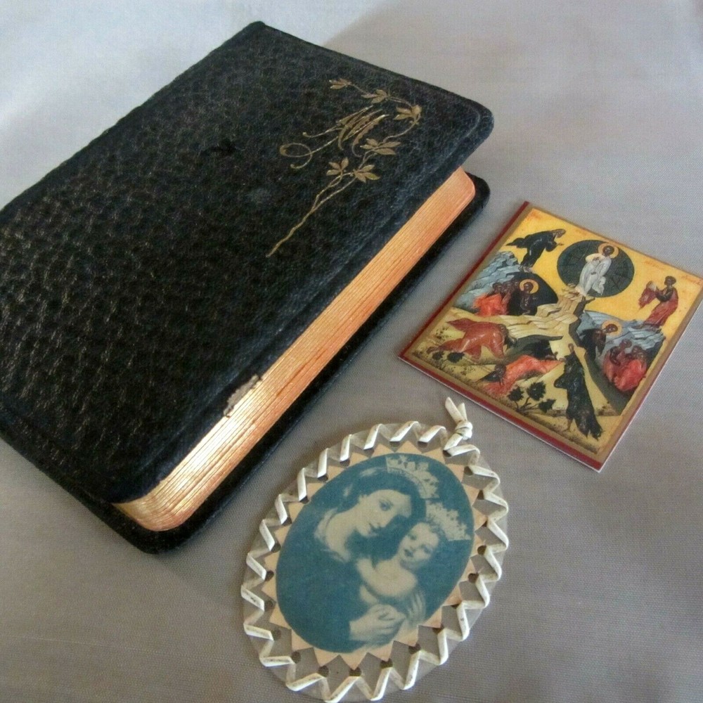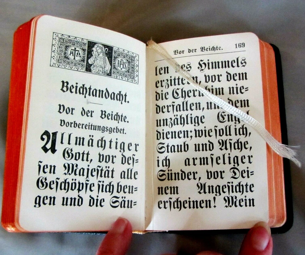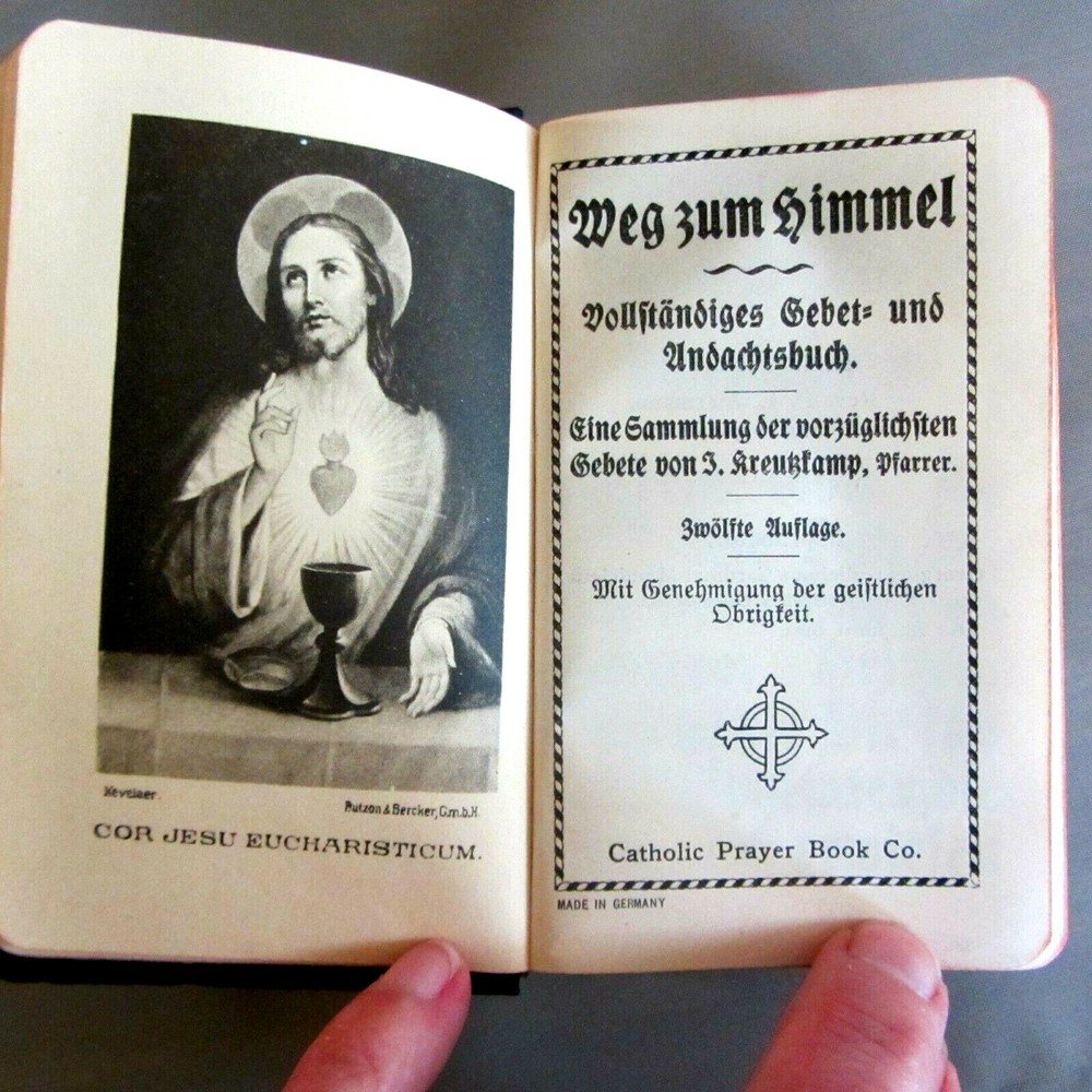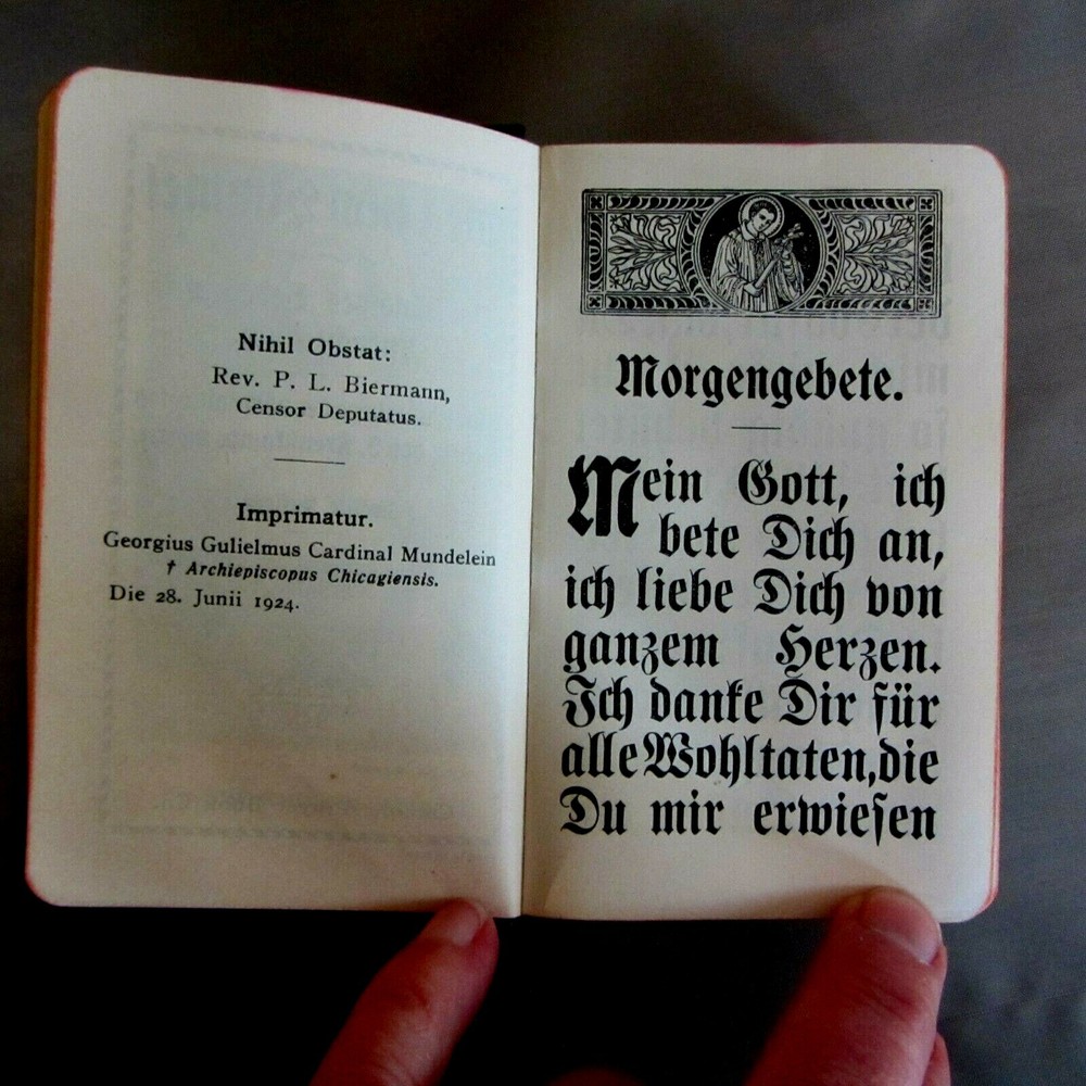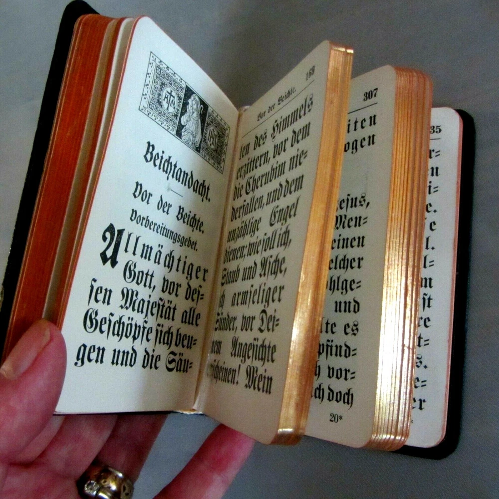 This is truly a one of a kind, absolutely beautiful little prayer book. All in GERMAN, with GIANT text, it is in incredible condition. Looks like it was never used. The leather is lovely, the gilt is almost unbelievably bright and shiny. The binding is tight and new marking ribbons have been installed. Imprimatur is 1924. The language is German and the text is larger than I have ever seen in such a tiny prayer book. There are 448 pages of prayers, litanies, and other services of the Catholic Church. Truly an exceptional example of traditional Catholic, pre-Vatican II piety. Comes with a small holy card and a plastic covered medallion of the Virgin. I have many other traditional Catholic, Orthodox, and other Christian items in my Ebay store. See them under the "Religious Items" section to the left of this description. From a smoke-free home. Payment via Paypal within three days of winning auction. Check out my other items...I'd be happy to combine shipping to save you money...I also shop on Ebay and LOVE a bargain!!!