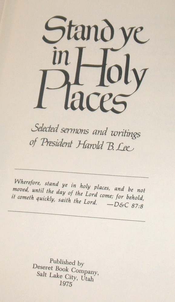 STAND YE IN HOLY PLACES- Selected sermons and writings of President Harlold B. Lee Published by Deseret Book Company (1975) Bound in beautiful top grain Blue/Gray Leather, hubbed spine, silver gilt page edges / text and decoration, blue/gray end pages and a sewn in silk ribbon marker. Condition: Excellent condition leather Hardcover Book! The binding is tight and all 398 pages within are bright white with no writing, underlining, high-lighting, rips, tears, bends, or folds. The covers are perfect! Please check out the photos! An unread book in as-new condition. Though he served as President of The Church of Jesus Christ of Latter-day Saints for only eighteen months, Harold B. Lee left a great legacy to the Church through the wisdom and inspiration of his writings and sermons. In this volume are gathered some of the most powerful of these gospel themes. President Lee was called to be a special witness of the Lord in April 1941, when he was sustained as a member of the Council of the Twelve Apostles. But even before that, through a rich pioneer heritage, a loving and spiritual childhood home, and unusual leadership ability and callings in his young manhood, he had proved to be a man of great wisdom, vision, and understanding. During the years of the Great Depression, he had pioneered, as a stake president, a program that was to become one of the most profound concepts ever known for self-help and sustenance-the great Welfare Program of the Church, which today extends to Latter-day Saints everywhere throughout the world. His wisdom, vision, and understanding of a priesthood-directed kingdom of God on the earth were instrumental in the founding and forming of today's great correlation program of the Church. And many, many other programs today are successful because of the guidance and direction he gave them through more than three decades of service as a greatly beloved and respected General Authority. In this book are found some of the outstanding expositions of President Lee on pertinent gospel themes: the importance of knowing and obeying God, his Son Jesus Christ, and the Holy Ghost; the efficacy of prayer, truth, and revelation; the calling of the prophet, seer, and revelator to direct God's kingdom on earth; the Lord's magnificent plan for the government of that kingdom through the priesthood; and the basic principles and ordinances of the Church. Please view the photos. Terms and conditions: Please note that by placing a bid on this auction you agree to all of the published terms, conditions and payment options. Please review the listing completely and carefully and ask any questions you may have before placing your bid. Your bid is a binding contract. THANKS AND GOOD LUCK!!!