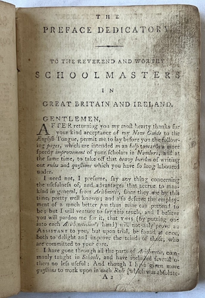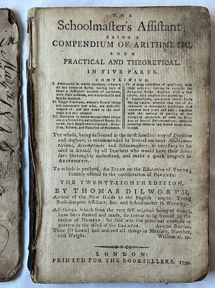 📜 1799 – The Schoolmaster’s Assistant by Thomas Dilworth (28th Edition) – A Rare Piece of Educational History! 📜 🔹 Author: Thomas Dilworth 🔹 Title: The Schoolmaster’s Assistant: Being a Compendium of Arithmetic, Both Practical and Theoretical, in Five Parts. To which is prefixed, An Essay on the Education of Youth. 🔹 Edition: 28th 🔹 Publisher & Year: "Printed for the Booksellers, London 1799" 🕰 Own a Remarkable Piece of 18th-Century Education! This rare and historically significant arithmetic textbook by Thomas Dilworth was one of the most widely used mathematics primers in early American and British schools. As a cornerstone of early education , it shaped the arithmetic skills of countless students—including those who would go on to build the foundations of the newly independent United States. this copy, printed in London in 1799, made the ocean passage over to the New World. 🔎 Condition & Features: 📖 A True Survivor: Over 225 years old , this copy has endured the passage of time with expected wear. ❌ Back cover missing, front cover detached – A testament to its long history of use in early education. 📜 Some loose pages at the rear, but still holding together – The structure remains intact for careful handling. 🖊 Pencil writing inside – Possibly from a student of the era, adding a personal historical connection! 📑 Moderate foxing throughout – Consistent with books of this age, adding to its authentic antiquarian appeal. ✨ Why This Book is Special: 🔹 An Authentic Glimpse into 18th-Century Education – This was the go-to arithmetic guide for students of the Revolutionary War era and beyond. This was used by students at the time! 🔹 Historical Value – A fantastic example of early printed textbooks, showcasing how mathematics was taught over two centuries ago . 🔹 Perfect for Collectors & Historians – Whether you’re an antiquarian book collector , a math history enthusiast , or someone fascinated by early American education , this volume is a rare opportunity to own a piece of the past . 🎯 A Must-Have for: 📚 Antiquarian Book Collectors – A desirable addition to any 18th-century book collection . 📜 Historians of Early Education – A first-hand look at how arithmetic was taught in the late 1700s. 🖋 Rare Book Restoration Enthusiasts – A candidate for professional restoration or display as a historic relic. 💥 Don’t Miss Out! 💥 Despite its wear, this book remains a tangible link to the past —a surviving artifact from an era where education was a privilege, and books were treasures. 📸 Please examine the photos carefully, and feel free to message me for additional details or pictures. 🚀 Fast & Secure Shipping – Ready to be Preserved in Your Collection!
