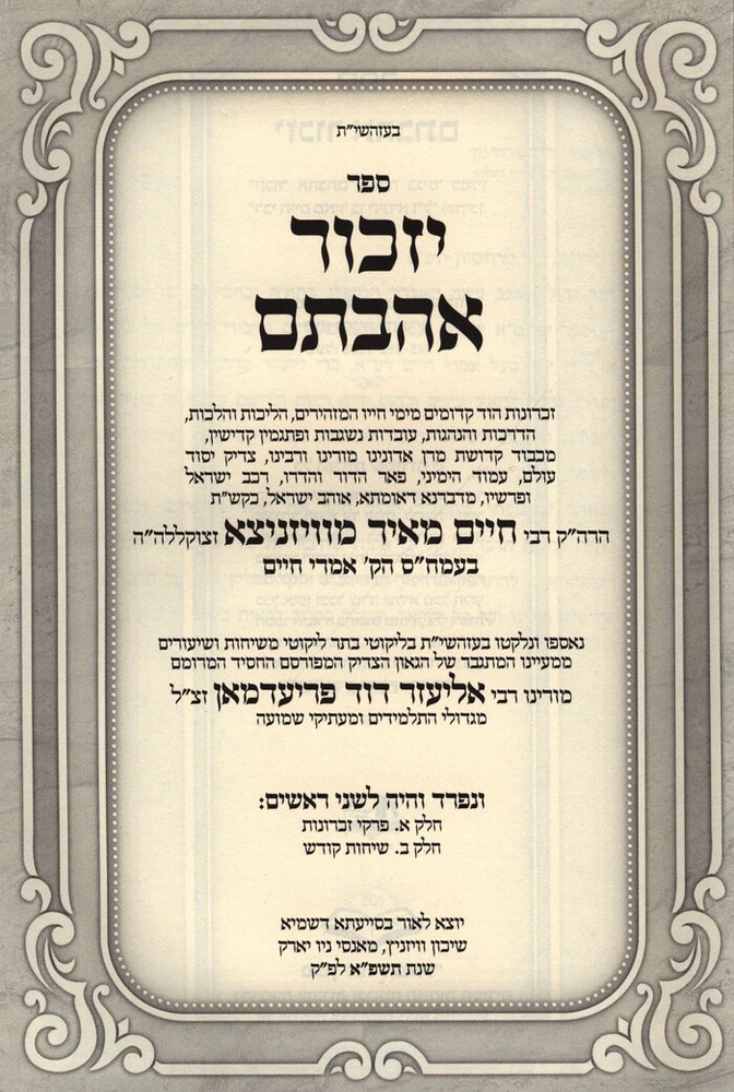 Sefer Yizchor Ahavosem - Vizhnitz - ספר יזכור אהבתם - וויזניץ זכרונות הוד קדומים מימי חייו המזהירים של> כ"ק אדמו"ר הרה"ק בעל אמרי חיים מוויזניץ זי"ע שנמסרו ע"י תלמידו הנאמן כ"ק הרה"צ המפורסם מורינו רבי אליעזר דוד פריעדמאן זצ"ל מגדולי מרביצי תורה בדורינו, ומבחירי תלמידיו הנאמנים מה שעיניו חזה בקודש פנימה ומה ששאב מותיקי החסידים בדייקנות מדיוקת