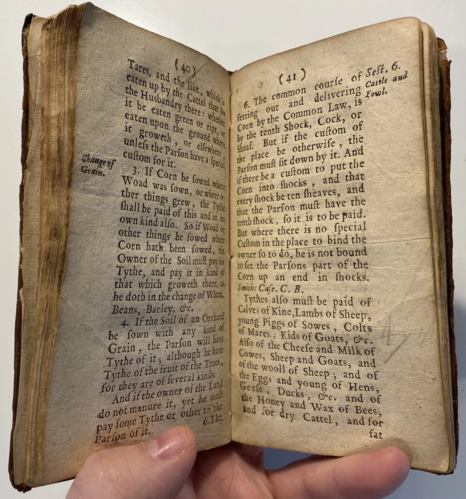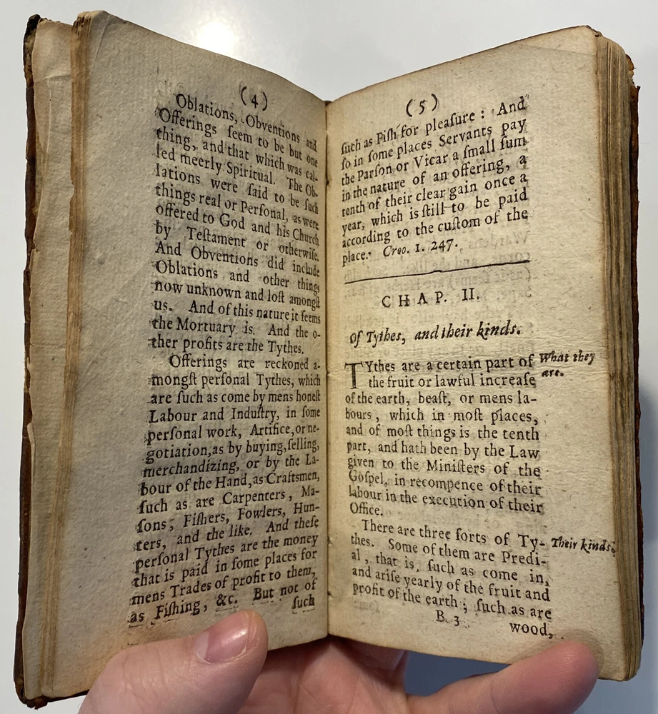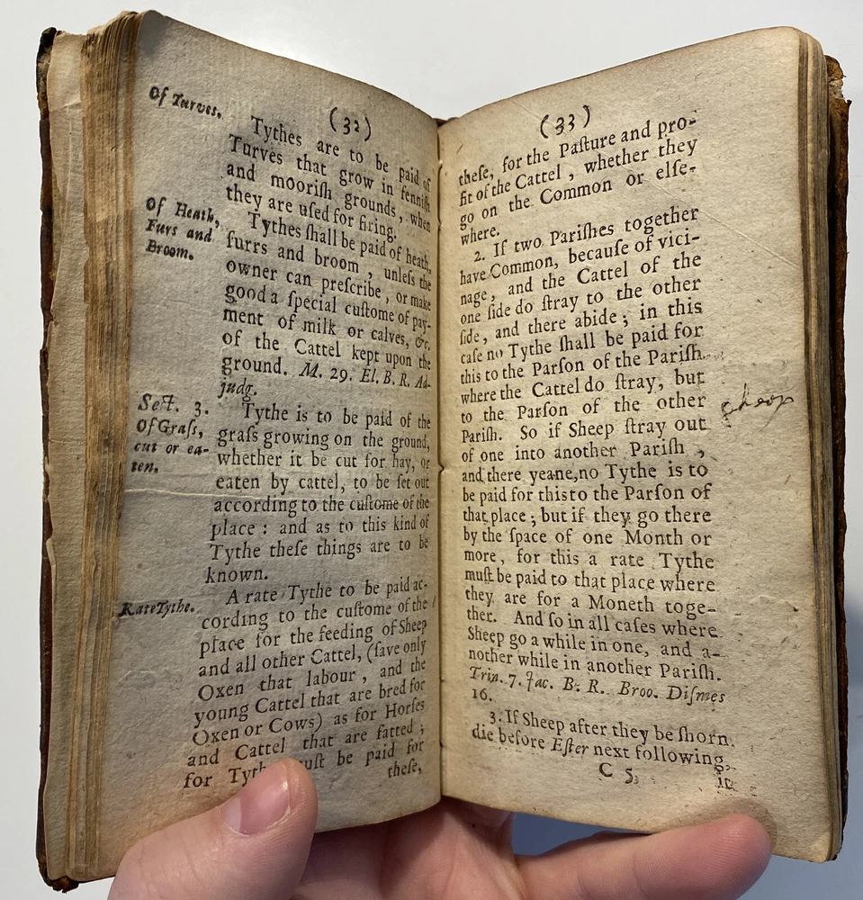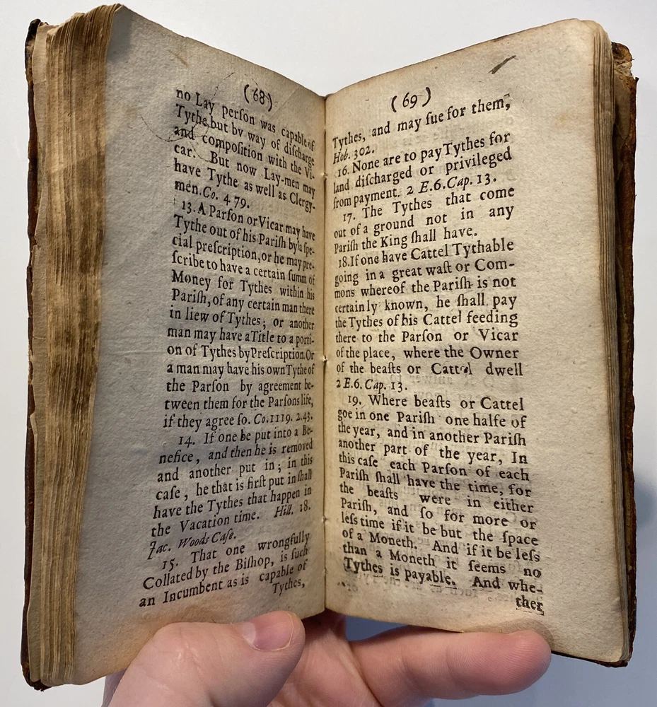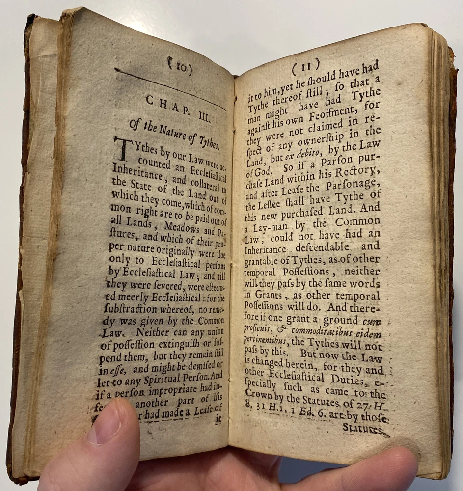 Title: THE PARSONS GUIDE OR THE LAW OF THE TYTHES Wherein is Shewed, Who must pay Tythes, and to whom, and of what things, When, and How they must be paid, and how they may be recovered at this day, and how a man may be discharged of payment thereof. The Second Edition much inlarged throughout the whole Book. Author: W. Sheppard, Esq. Publisher: W. Lee, etc.; London Year: 1670 Details: Second edition. [16], 99pp.; 5.75 x 3.25 in. Context: "William Sheppard was one of the most prolific legal authors of the seventeenth century and certainly the most original. His diversified publications filled more space on booksellers' shelves than those of any other legal writer apart from Coke. [...] [In April 1654,] Sheppard was called upon [by Cromwell and his government] to compile a manual of laws on tithe payments [...] His handbook, The parson's guide : or, the law of tithes, was ready for distribution by 15 June and before the year was out, the pamphlet was twice reprinted. Sheppard collected information which filled only thirty-one pages of a small pamphlet. [...] The tithe system had been under attack since the early part of the century and, although Cromwell's decision to continue their collection until another source of funding for the ministry had been found touched off criticism from tithe abolitionists, it won the support of lay impropriators among the gentry class with its re- assurance concerning Cromwell's intention to protect property rights. Sheppard reminded the reader in his introduction that while a substitute source of funds was being sought by the government, tithe collections must continue for the time being to supply the revenues needed to support a preaching clergy. He explained that 'the strife there is everywhere about the payment of tithes' and 'the ignorance of the law in this matter' had led him to prepare this informational tract, 'hoping that when men know what the law is herein, the one will not demand more nor the other offer less than what the law sets down to be due [and] much of this trouble may be prevented and some peace procured'. Assuring his readers that his guide 'doth neither justify nor condemn tithes', he could not resist adding, 'I wish they were taken away, so that first of all a more convenient way of maintenance instead thereof be provided for the minister; but this I suppose will ask time.'" [Nancy L. Matthews, William Sheppard: Cromwell's Law Reformer, 1984]