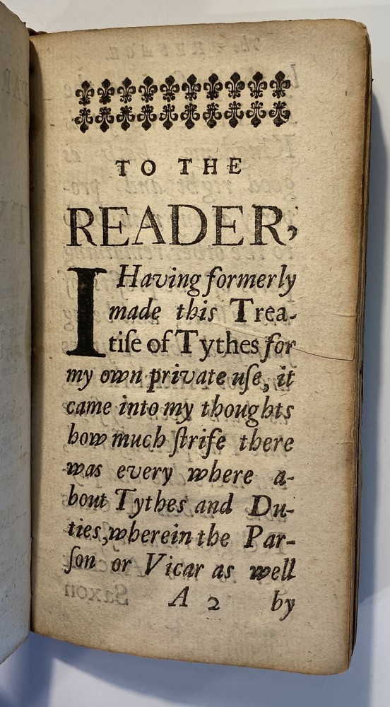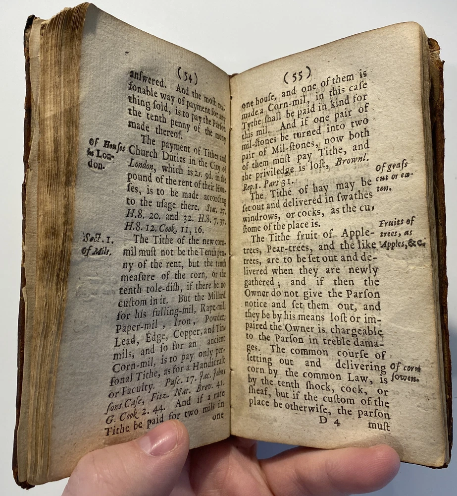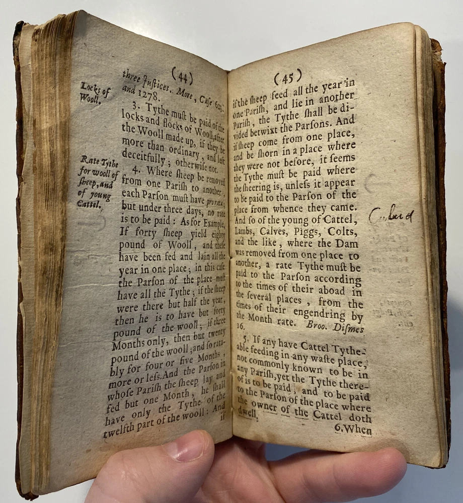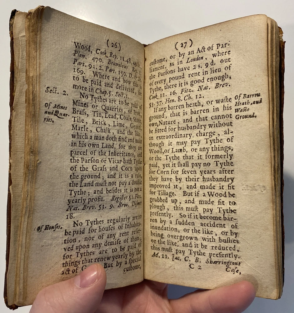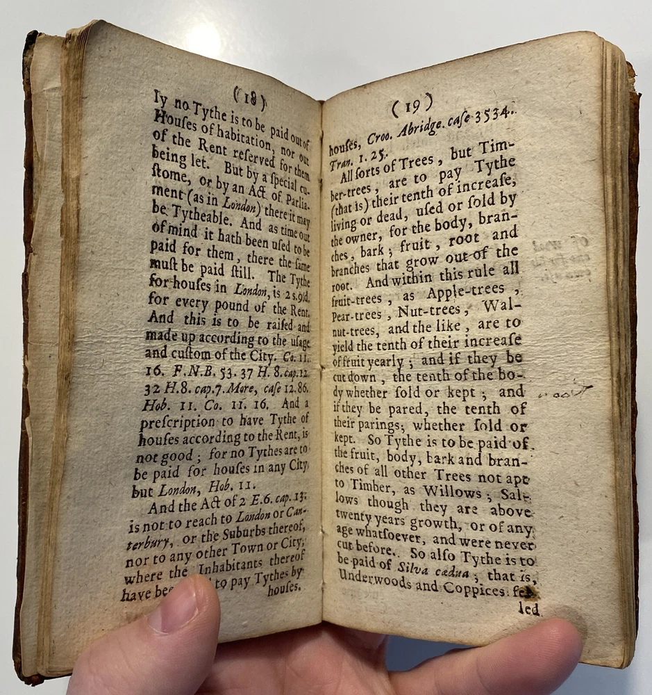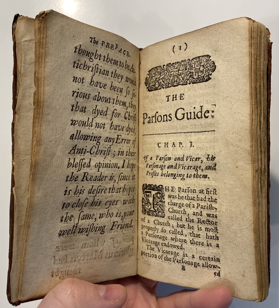 Title: THE PARSONS GUIDE OR THE LAW OF THE TYTHES Wherein is Shewed, Who must pay Tythes, and to whom, and of what things, When, and How they must be paid, and how they may be recovered at this day, and how a man may be discharged of payment thereof. The Second Edition much inlarged throughout the whole Book. Author: W. Sheppard, Esq. Publisher: W. Lee, etc.; London Year: 1670 Details: Second edition. [16], 99pp.; 5.75 x 3.25 in. Context: "William Sheppard was one of the most prolific legal authors of the seventeenth century and certainly the most original. His diversified publications filled more space on booksellers' shelves than those of any other legal writer apart from Coke. [...] [In April 1654,] Sheppard was called upon [by Cromwell and his government] to compile a manual of laws on tithe payments [...] His handbook, The parson's guide : or, the law of tithes, was ready for distribution by 15 June and before the year was out, the pamphlet was twice reprinted. Sheppard collected information which filled only thirty-one pages of a small pamphlet. [...] The tithe system had been under attack since the early part of the century and, although Cromwell's decision to continue their collection until another source of funding for the ministry had been found touched off criticism from tithe abolitionists, it won the support of lay impropriators among the gentry class with its re- assurance concerning Cromwell's intention to protect property rights. Sheppard reminded the reader in his introduction that while a substitute source of funds was being sought by the government, tithe collections must continue for the time being to supply the revenues needed to support a preaching clergy. He explained that 'the strife there is everywhere about the payment of tithes' and 'the ignorance of the law in this matter' had led him to prepare this informational tract, 'hoping that when men know what the law is herein, the one will not demand more nor the other offer less than what the law sets down to be due [and] much of this trouble may be prevented and some peace procured'. Assuring his readers that his guide 'doth neither justify nor condemn tithes', he could not resist adding, 'I wish they were taken away, so that first of all a more convenient way of maintenance instead thereof be provided for the minister; but this I suppose will ask time.'" [Nancy L. Matthews, William Sheppard: Cromwell's Law Reformer, 1984]