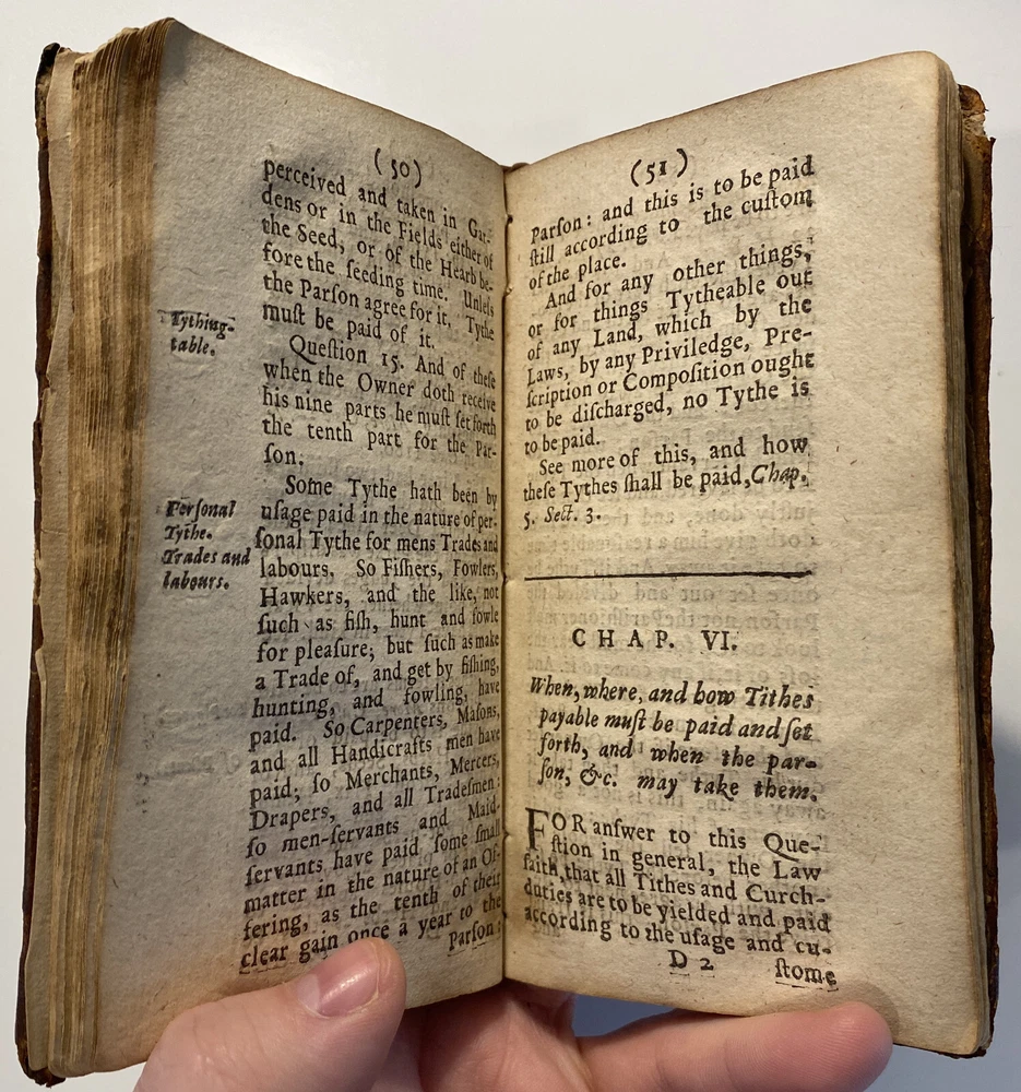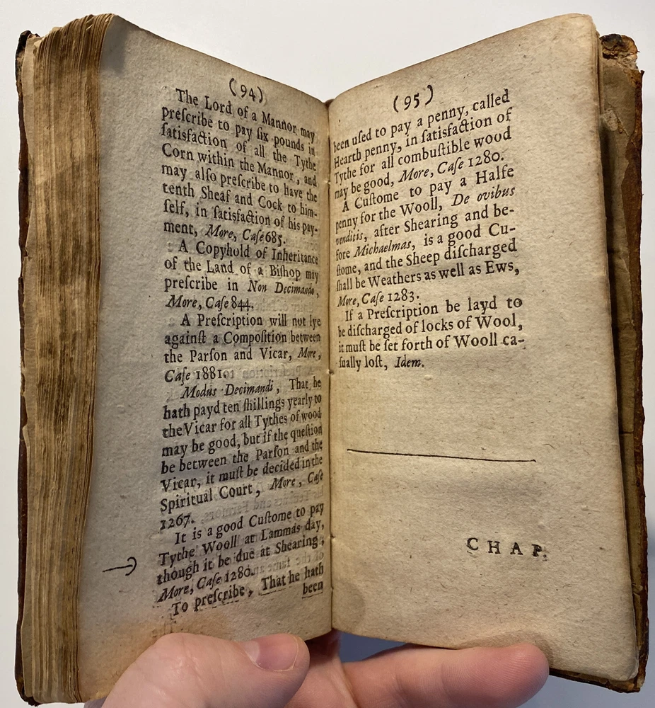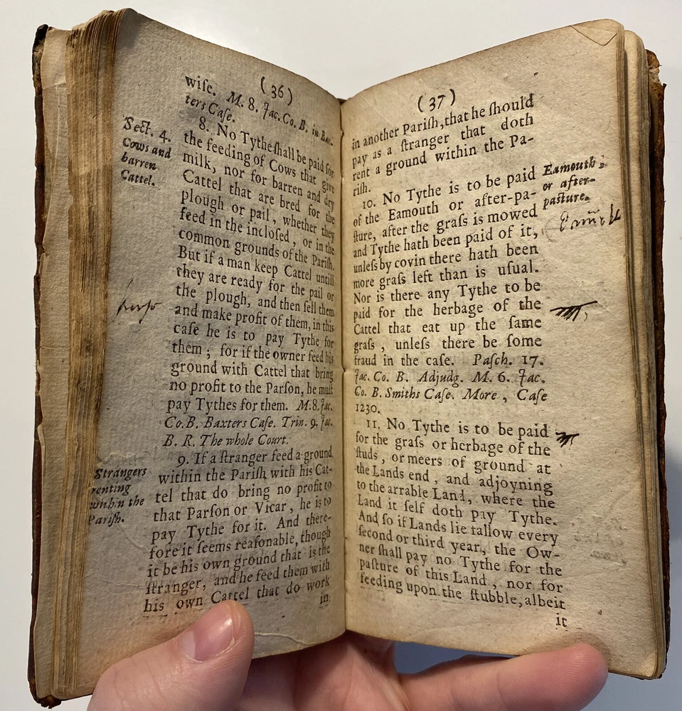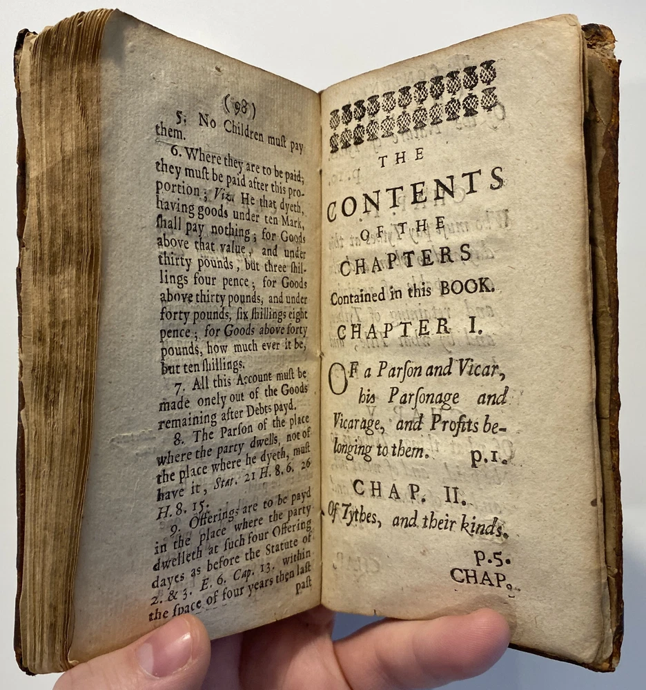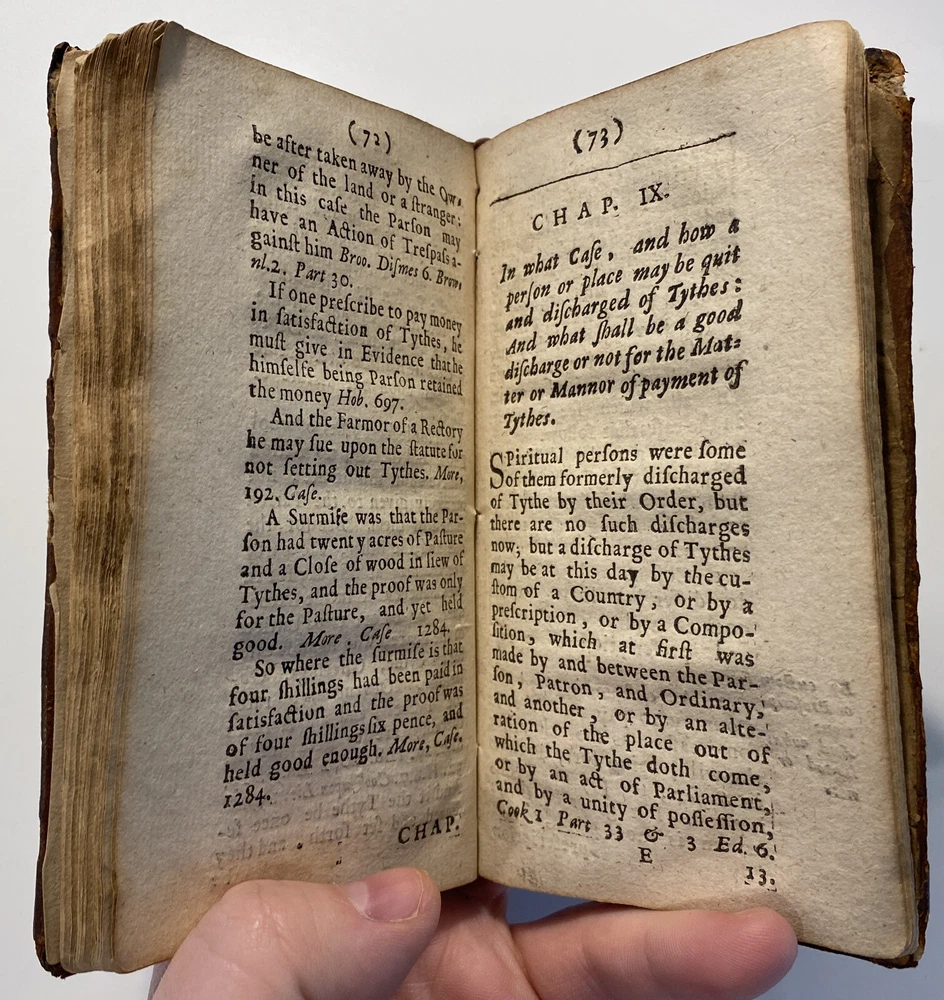 Title: THE PARSONS GUIDE OR THE LAW OF THE TYTHES Wherein is Shewed, Who must pay Tythes, and to whom, and of what things, When, and How they must be paid, and how they may be recovered at this day, and how a man may be discharged of payment thereof. The Second Edition much inlarged throughout the whole Book. Author: W. Sheppard, Esq. Publisher: W. Lee, etc.; London Year: 1670 Details: Second edition. [16], 99pp.; 5.75 x 3.25 in. Context: "William Sheppard was one of the most prolific legal authors of the seventeenth century and certainly the most original. His diversified publications filled more space on booksellers' shelves than those of any other legal writer apart from Coke. [...] [In April 1654,] Sheppard was called upon [by Cromwell and his government] to compile a manual of laws on tithe payments [...] His handbook, The parson's guide : or, the law of tithes, was ready for distribution by 15 June and before the year was out, the pamphlet was twice reprinted. Sheppard collected information which filled only thirty-one pages of a small pamphlet. [...] The tithe system had been under attack since the early part of the century and, although Cromwell's decision to continue their collection until another source of funding for the ministry had been found touched off criticism from tithe abolitionists, it won the support of lay impropriators among the gentry class with its re- assurance concerning Cromwell's intention to protect property rights. Sheppard reminded the reader in his introduction that while a substitute source of funds was being sought by the government, tithe collections must continue for the time being to supply the revenues needed to support a preaching clergy. He explained that 'the strife there is everywhere about the payment of tithes' and 'the ignorance of the law in this matter' had led him to prepare this informational tract, 'hoping that when men know what the law is herein, the one will not demand more nor the other offer less than what the law sets down to be due [and] much of this trouble may be prevented and some peace procured'. Assuring his readers that his guide 'doth neither justify nor condemn tithes', he could not resist adding, 'I wish they were taken away, so that first of all a more convenient way of maintenance instead thereof be provided for the minister; but this I suppose will ask time.'" [Nancy L. Matthews, William Sheppard: Cromwell's Law Reformer, 1984]