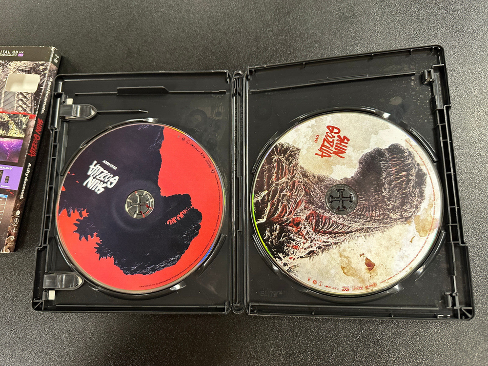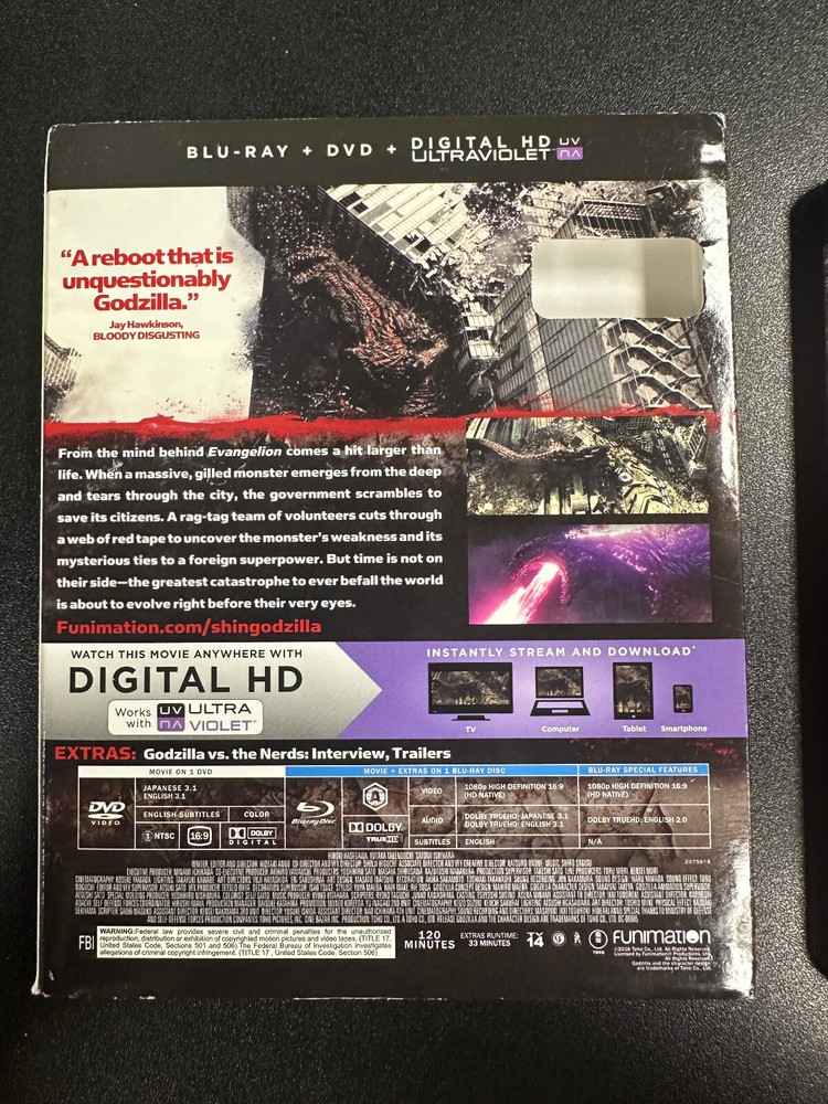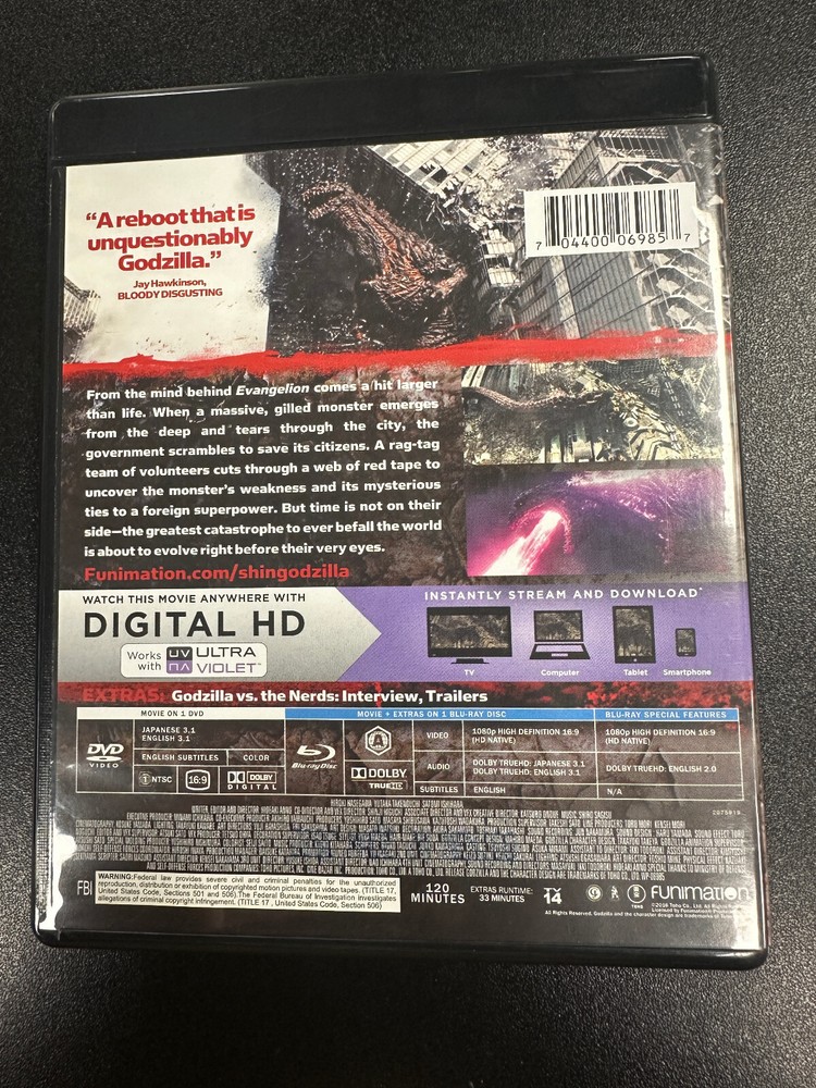 The Shin Godzilla Blu-Ray + DVD set includes the 2016 sci-fi film directed by Hideaki Anno. This edition features high-definition Blu-ray quality and a runtime of 120 minutes. Sub-genre enthusiasts of foreign-Japanese films will appreciate this contemporary sci-fi film presented in both Blu-ray and DVD formats. Produced by Funimation Prod, this set offers fans of the franchise the opportunity to enjoy the iconic monster's story in both formats. The slip cover has some shelf ware. The artwork, case and discs are in great shape. Smoke free