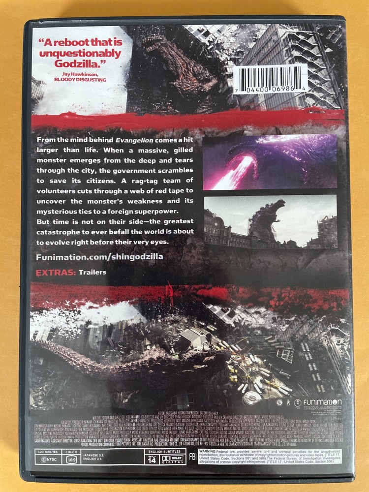 Condition: Mint shape, original item. No scratches, scuffs or marks on on the disk. From a smoke-free home. The actual item is pictured. An unknown accident occurs in Tokyo Bay's Aqua Line, which causes an emergency cabinet to assemble. All of the sudden, a giant creature immediately appears, destroying town after town with its landing reaching the capital. This mysterious giant monster is named "Godzilla". Sales Taxes: Winning Canadian bidders residing in provinces that have HST (ie. ON, NL, NS, PEI and NB) are subject to HST at their provinces applicable rate. For those provinces without an HST (ie. AB, BC, SK, MB, QC, NT, NU, and YT) you are subject to GST at 5%. S&H : All Shipping and handling is shown in Canadian Dollars which cost about 30% less than US Dollars. To the USA: $8.95 Canadian for Tracked Packet service (approximately $6.50 US Dollars). Normally between 1 and 1½ weeks to arrive. Sometimes less than 1 week. To Canada: $8.95 Canadian for Canada Post Tracked Light parcel shipping. Tracked and insured. N ormally between 2 and 10 days to arrive . Sorry, no shipping to ANY country other than USA/Canada. All items are shipped in padded bubble mailing envelopes. Guarantee: All of our items are GUARANTEED to work correctly and be as described or we will refund your purchase price (less shipping and handling). You must send the item back to us (at your expense) to receive a refund. Feedback: Appropriate feedback will be left only when requested and only AFTER feedback has been received.