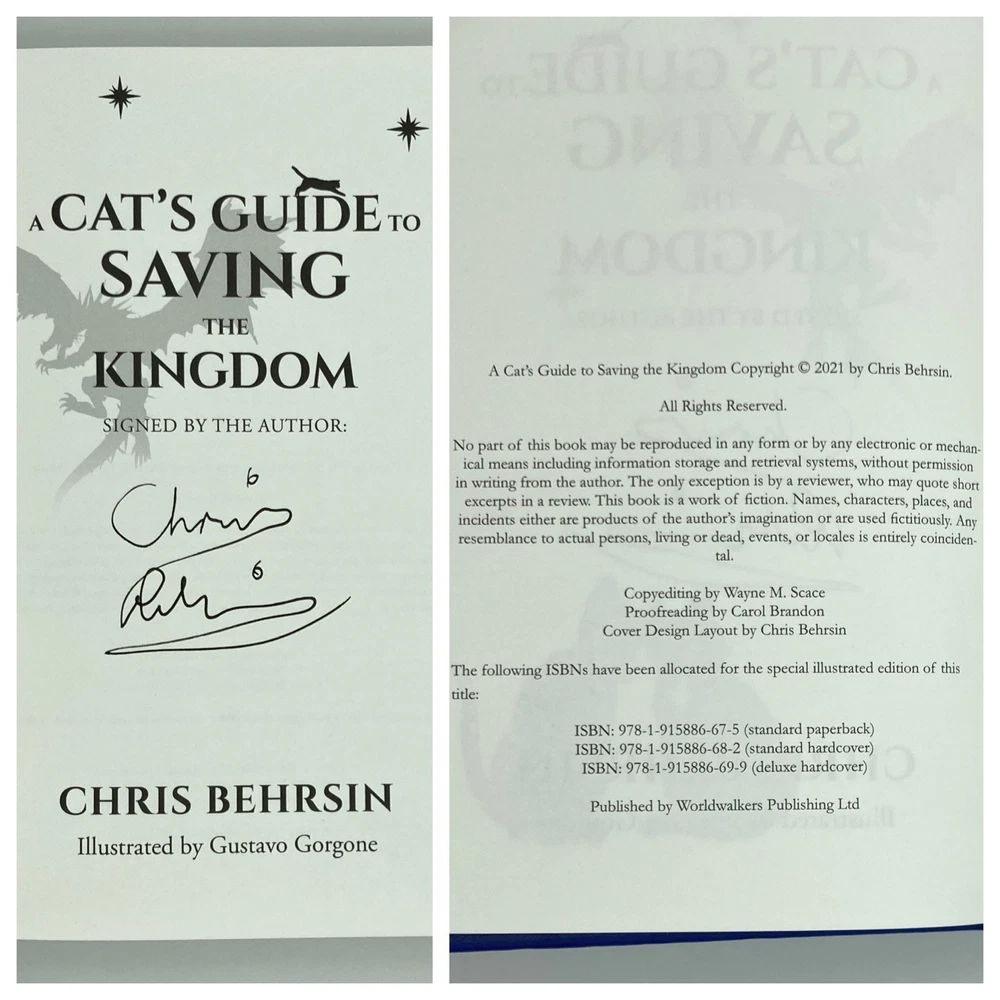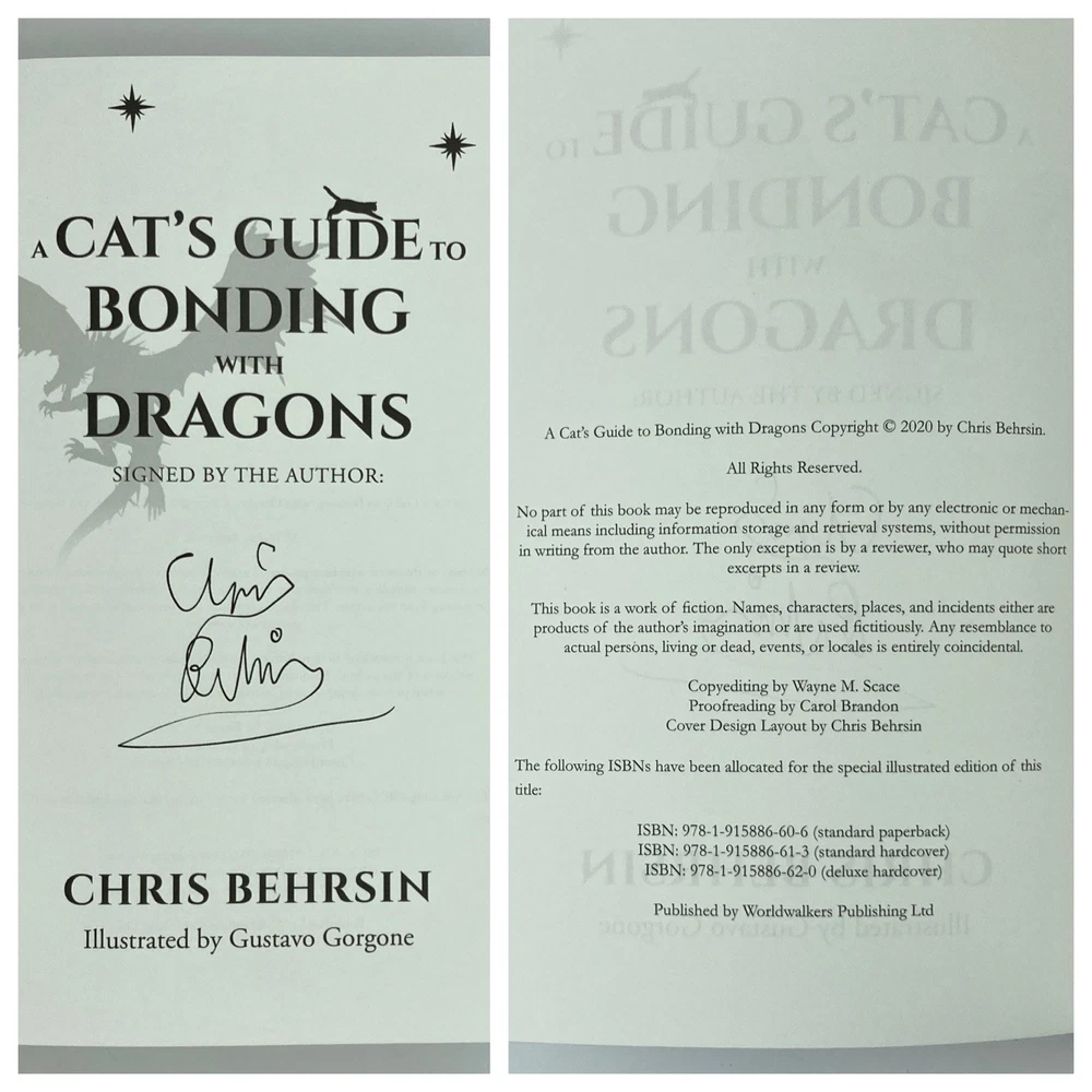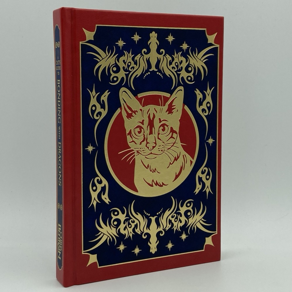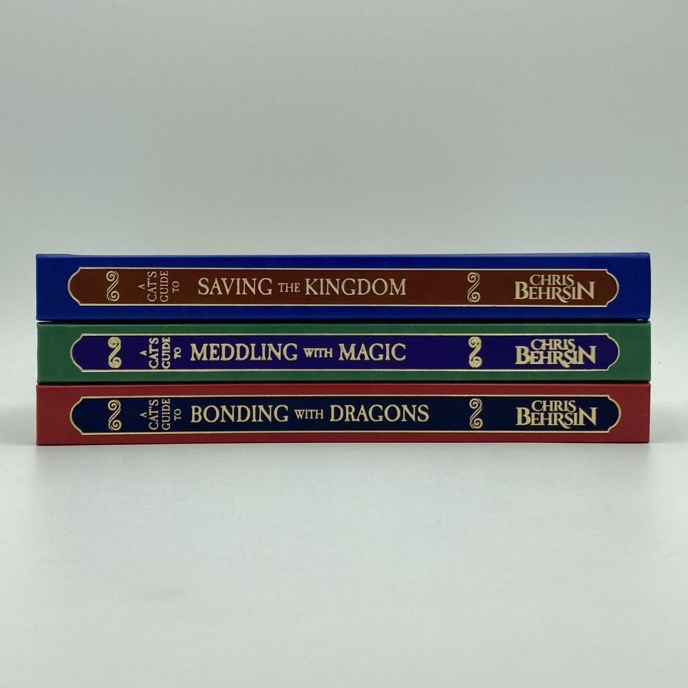 Special signed Kickstarter exclusive edition set of Dragoncat volumes 1-3 by Chris Behrsin (Worldwalkers Publishing, 2021). Contains the young adult / children’s fantasy novels: A Cat’s Guide to Bonding with Dragons / A Cat’s Guide to Meddling with Magic / A Cat’s Guide to Saving the Kingdom. Illustrated throughout by Gustavo Gorgone. Stunning pictorial leatherbound hardcover editions with gilt lettering and accents, gilded page edges, decorative endpapers and attached tassel ribbon bookmarks. Flat signed by Behrsin on all three title pages. Books two and three are brand new and unread (I removed them from shrinkwrap to take these photos). Some mild shelf wear to book one and with worn/faded area to top right corner of back cover. Bindings are firm and spines are straight. All pages are clean and unmarked. See photos for condition. Packaged with care and shipped via USPS Media Mail