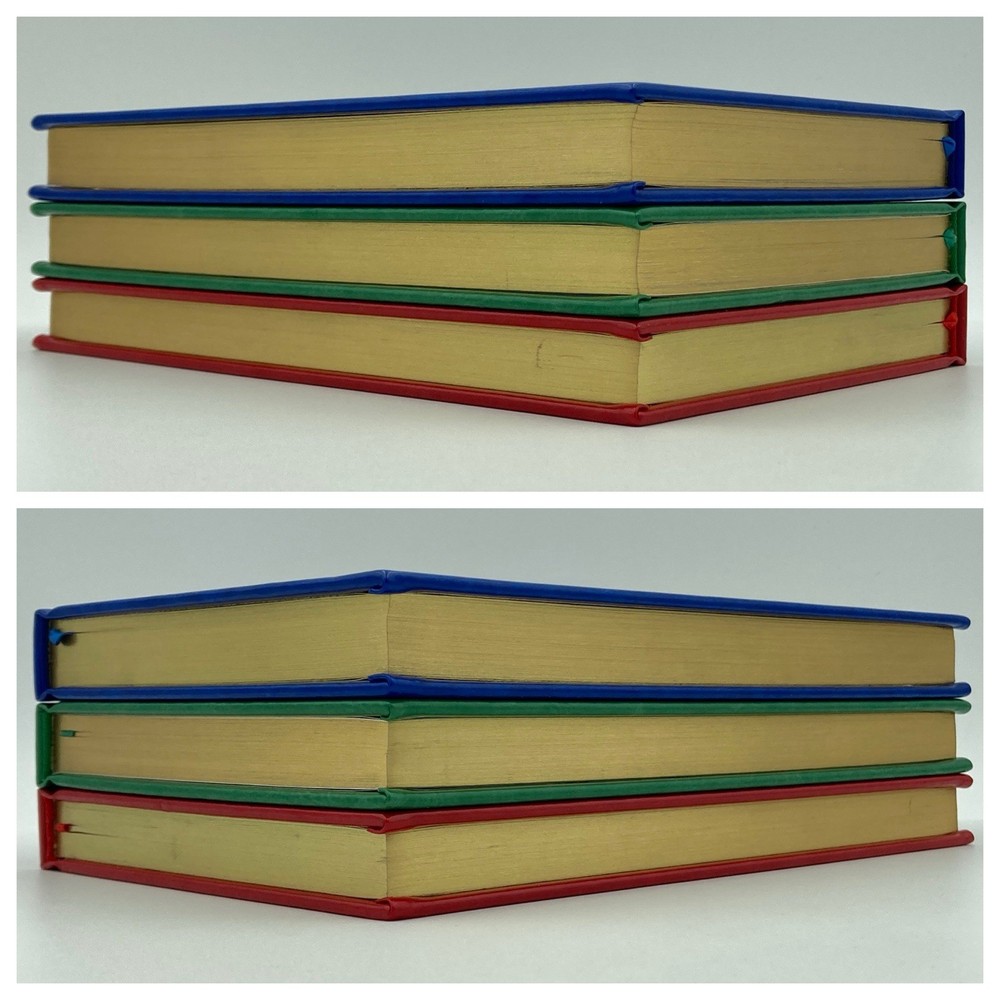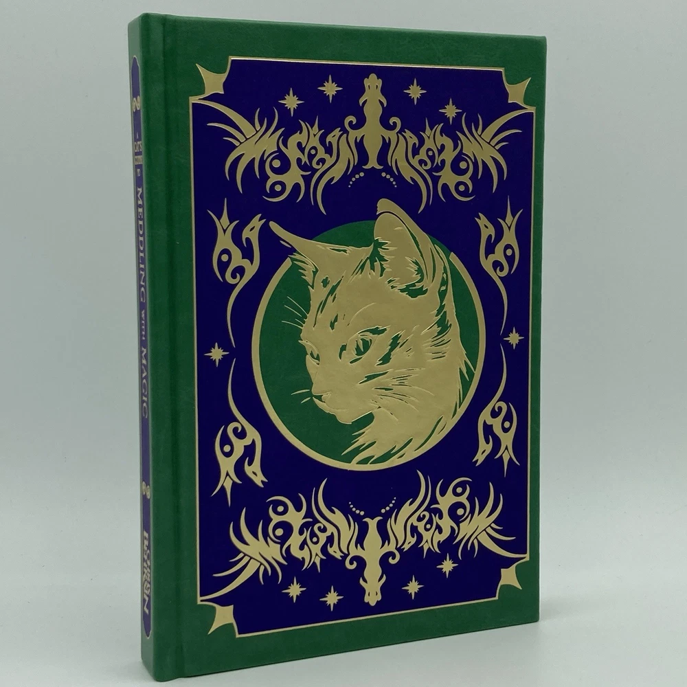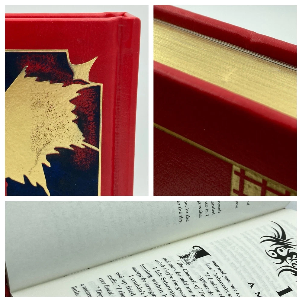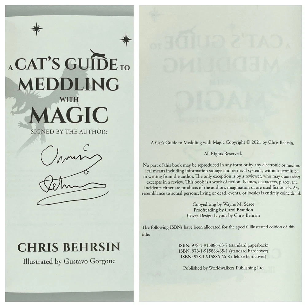 Special signed Kickstarter exclusive edition set of Dragoncat volumes 1-3 by Chris Behrsin (Worldwalkers Publishing, 2021). Contains the young adult / children’s fantasy novels: A Cat’s Guide to Bonding with Dragons / A Cat’s Guide to Meddling with Magic / A Cat’s Guide to Saving the Kingdom. Illustrated throughout by Gustavo Gorgone. Stunning pictorial leatherbound hardcover editions with gilt lettering and accents, gilded page edges, decorative endpapers and attached tassel ribbon bookmarks. Flat signed by Behrsin on all three title pages. Books two and three are brand new and unread (I removed them from shrinkwrap to take these photos). Some mild shelf wear to book one and with worn/faded area to top right corner of back cover. Bindings are firm and spines are straight. All pages are clean and unmarked. See photos for condition. Packaged with care and shipped via USPS Media Mail
