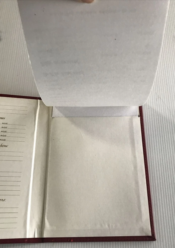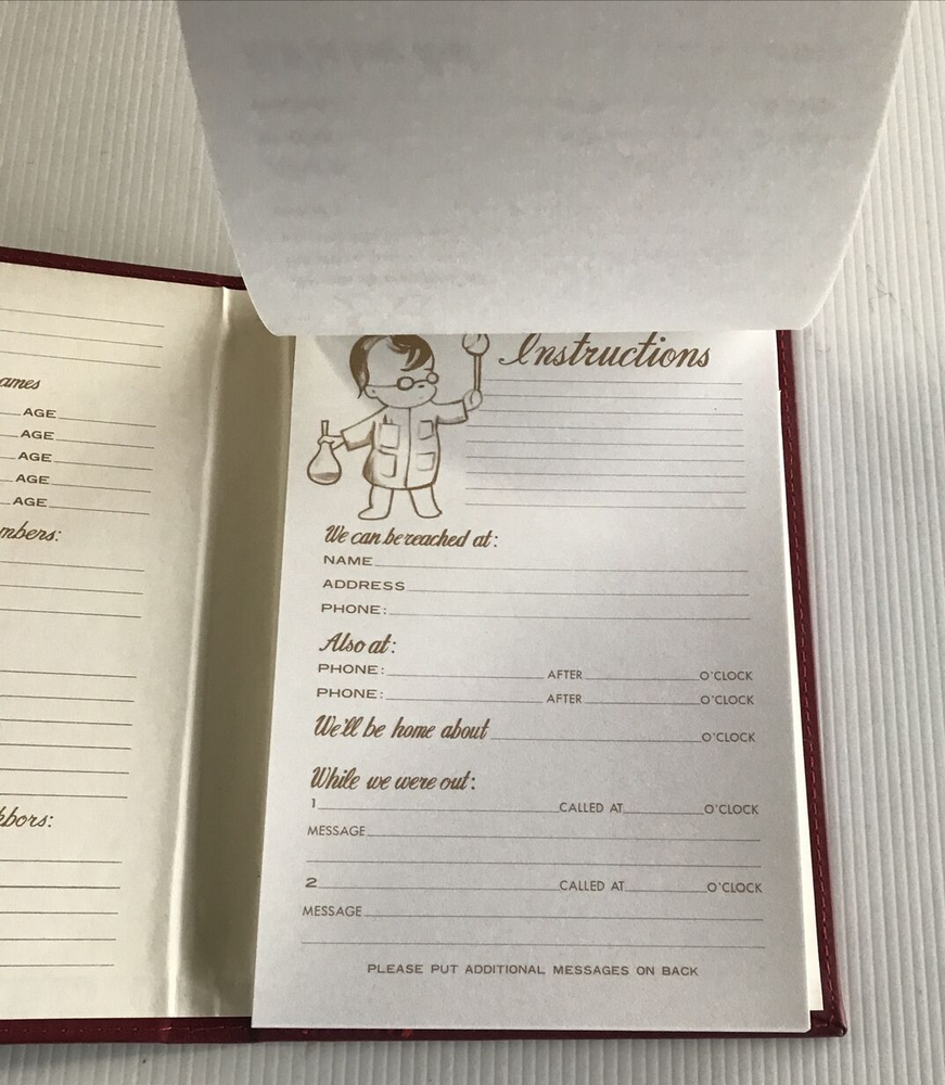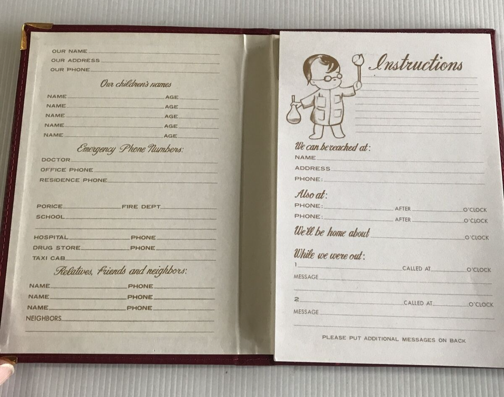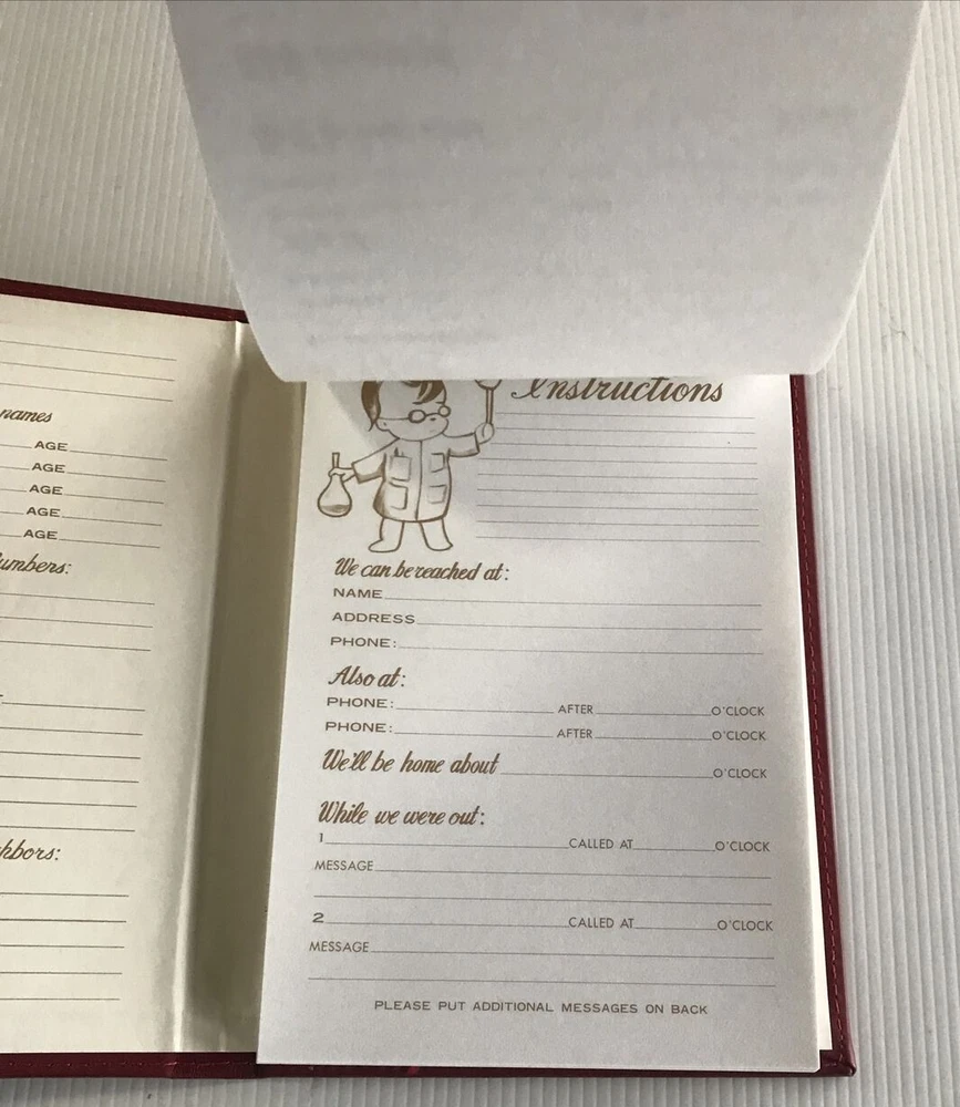 Sitter's Guide Bound Book with Instruction Pages and Details Red Faux Leather Bound Gold Metal Edges Vintage In Very Good Condition This sitter's guide book has tear off instruction sheets and general information details. It has not been used. It does have some scratches on one of the gold metal corners. Please see pictures.