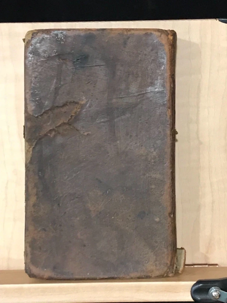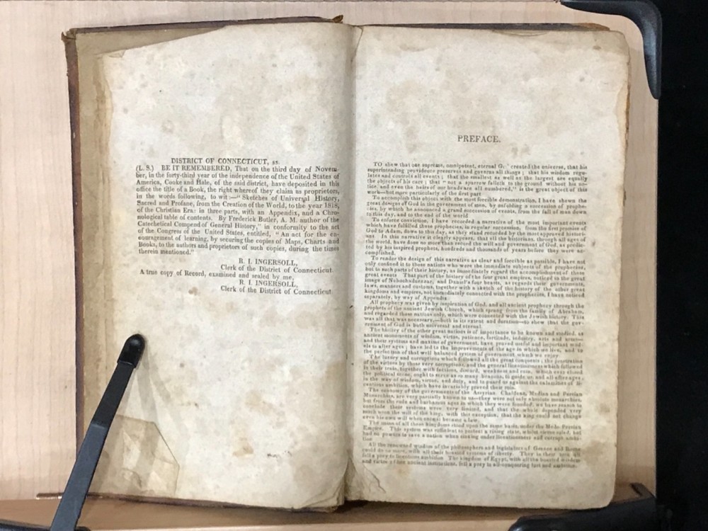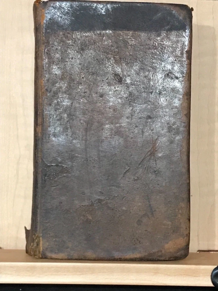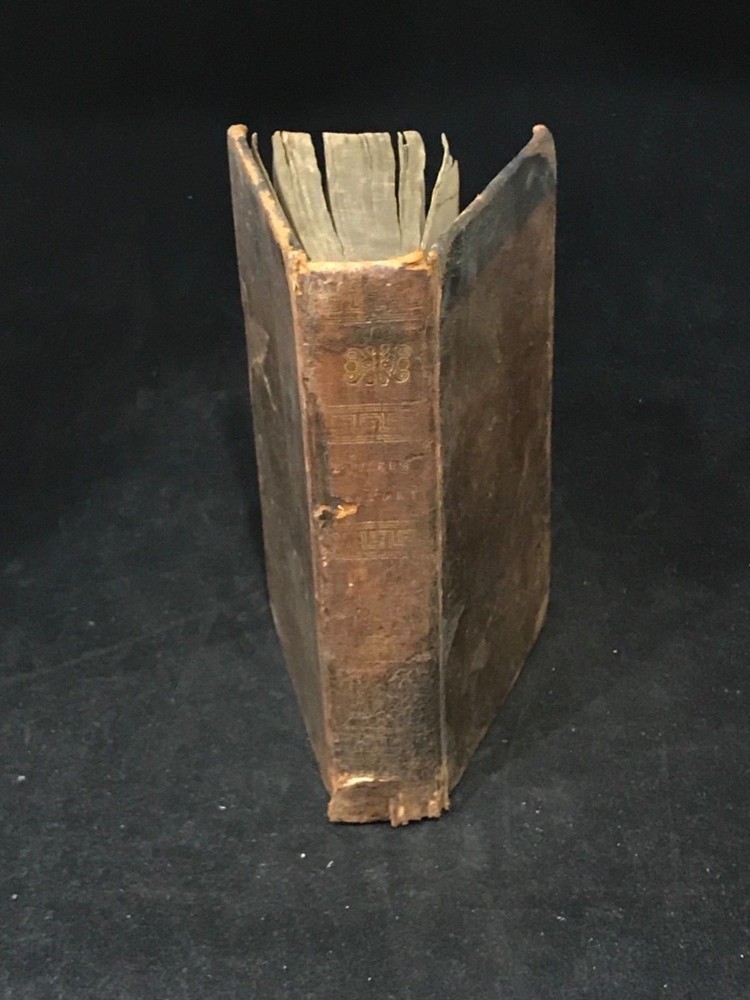 Butler’s Sketches of Universal History gives an overview of the world’s history from the creation of the world to the “Year 1818 of the Christian Era”. Lots of information packed into 412 pages including the actual material, an appendix, and a chronological table of contents. In good condition, the binding has chips and scuffs with bends at the corners. There is a layer removed from the binding at the back outside edge near the top; the spine is chipped and cracked with lifted material at the tail of the spine, and some scuffing. Foxing throughout and the illustrations each have missing corners or bits of paper. The name of a previous owner is written inside front: “Darius Waterman Book” and it looks like a penciled copy of the same name in the same hand is on the opposite. Good Condition: 8vo: Leather with chips, scuffs and missing bits; dark streak across top front: spine has faded gilt decorations with a Greek key design and “Butler’s History” in gilt: name inside front and on free endpaper: foxing throughout: tears and missing paper to the illustrations: dog-earring; soft paper: “Sketches of Universal HIstory, Sacred and Profane, from the Creation of the World, to the Year 1818 of the Christian Era: in Three Parts with An Appendix and a chronological Table of Contents” by Frederick Butler A.M.: 4th edition, corrected by the author and continued down to the years 1822: Hartford: Oliver D. Cooke: 1822 RAREA1822ABCA