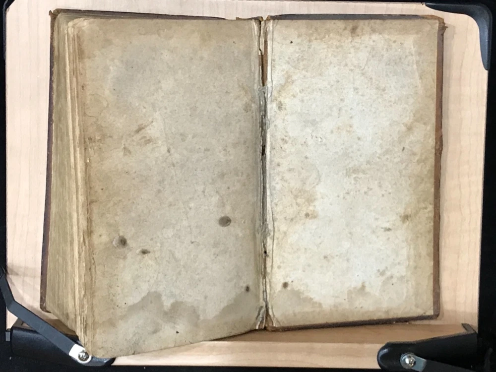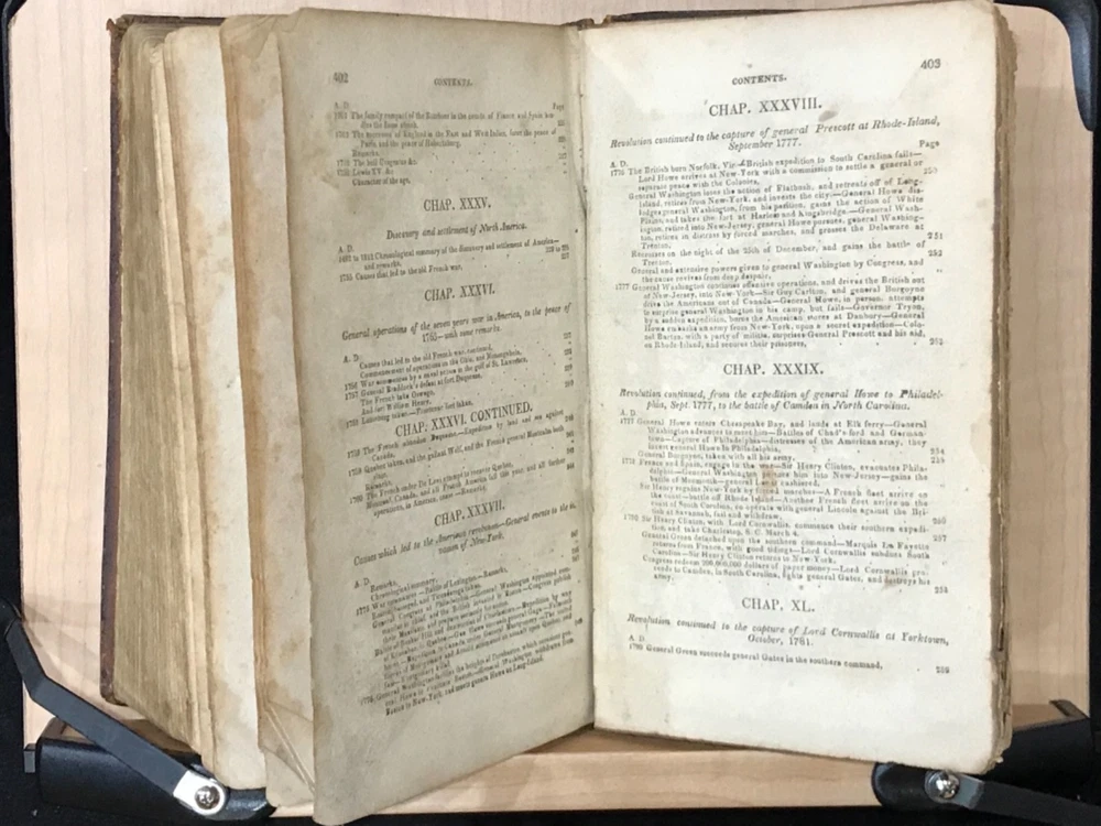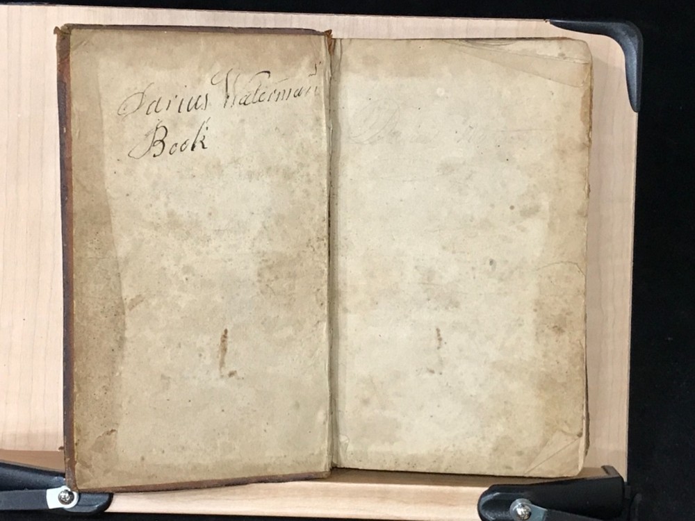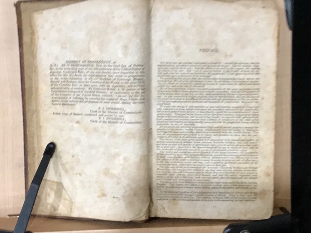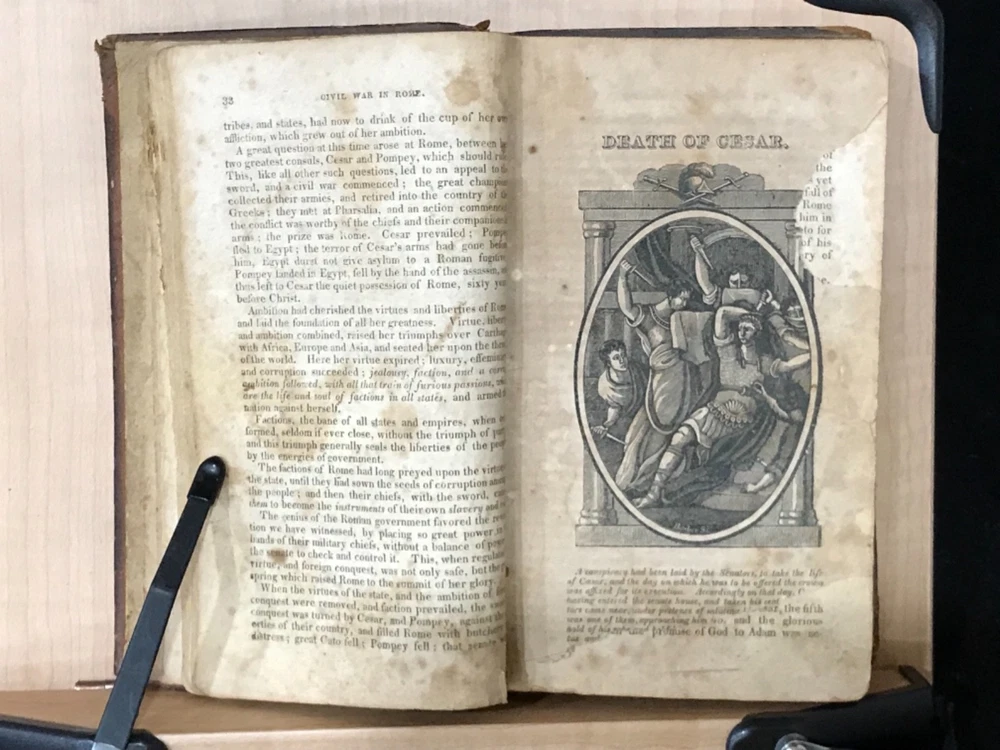 Butler’s Sketches of Universal History gives an overview of the world’s history from the creation of the world to the “Year 1818 of the Christian Era”. Lots of information packed into 412 pages including the actual material, an appendix, and a chronological table of contents. In good condition, the binding has chips and scuffs with bends at the corners. There is a layer removed from the binding at the back outside edge near the top; the spine is chipped and cracked with lifted material at the tail of the spine, and some scuffing. Foxing throughout and the illustrations each have missing corners or bits of paper. The name of a previous owner is written inside front: “Darius Waterman Book” and it looks like a penciled copy of the same name in the same hand is on the opposite. Good Condition: 8vo: Leather with chips, scuffs and missing bits; dark streak across top front: spine has faded gilt decorations with a Greek key design and “Butler’s History” in gilt: name inside front and on free endpaper: foxing throughout: tears and missing paper to the illustrations: dog-earring; soft paper: “Sketches of Universal HIstory, Sacred and Profane, from the Creation of the World, to the Year 1818 of the Christian Era: in Three Parts with An Appendix and a chronological Table of Contents” by Frederick Butler A.M.: 4th edition, corrected by the author and continued down to the years 1822: Hartford: Oliver D. Cooke: 1822 RAREA1822ABCA