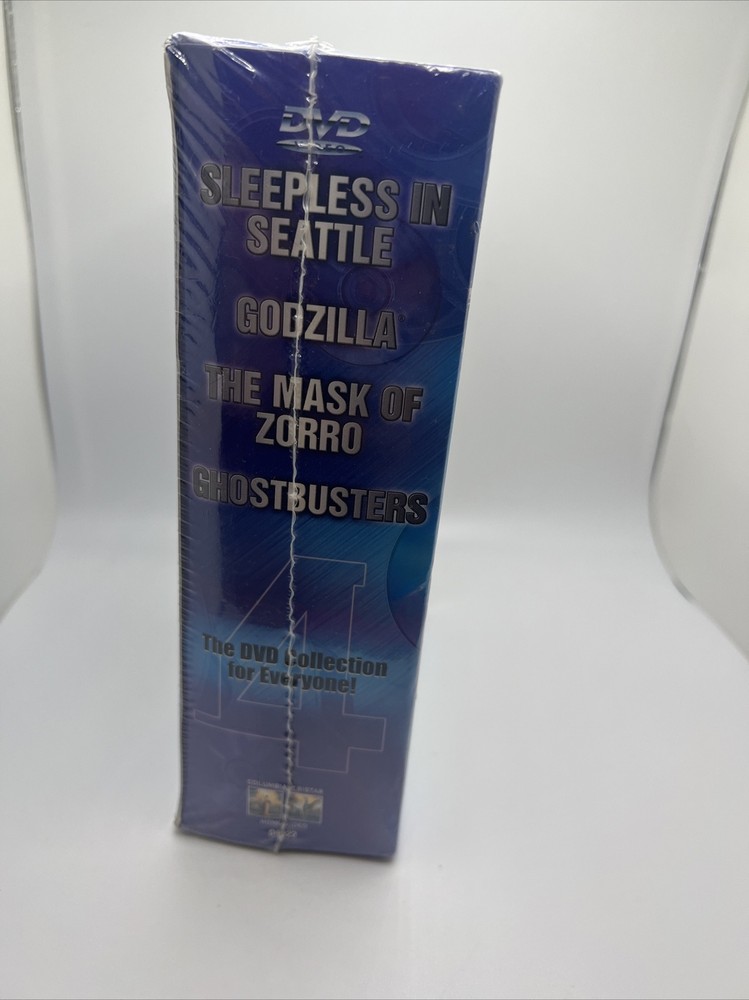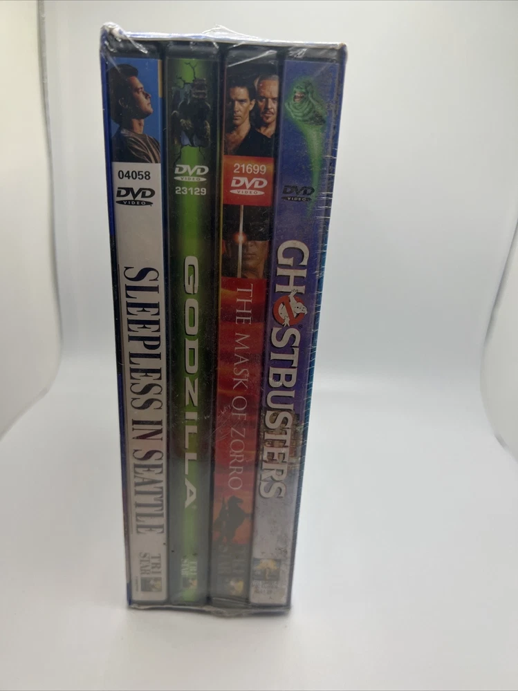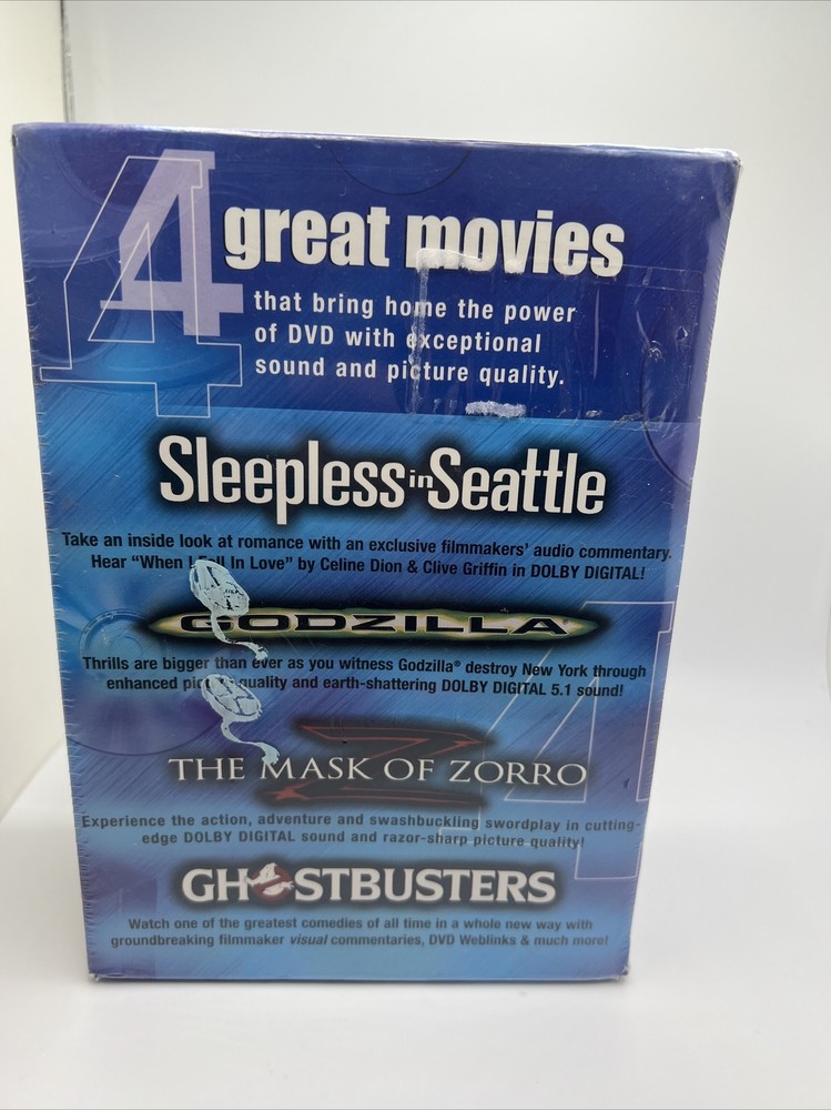 This DVD set features four blockbuster movies for your viewing pleasure. Enjoy the heartwarming romance of Sleepless in Seattle, the thrilling action of Godzilla, the swashbuckling adventure of The Mask of Zorro, and the hilarious ghost-busting antics of Ghostbusters. Each movie is presented in DVD format and rated PG-13 for mature audiences. Released in 2000, this DVD set is a must-have for any movie lover's collection. Whether you're in the mood for drama, action, adventure, or comedy, these four movies have something for everyone. Don't miss out on the chance to own these timeless classics. PAC599