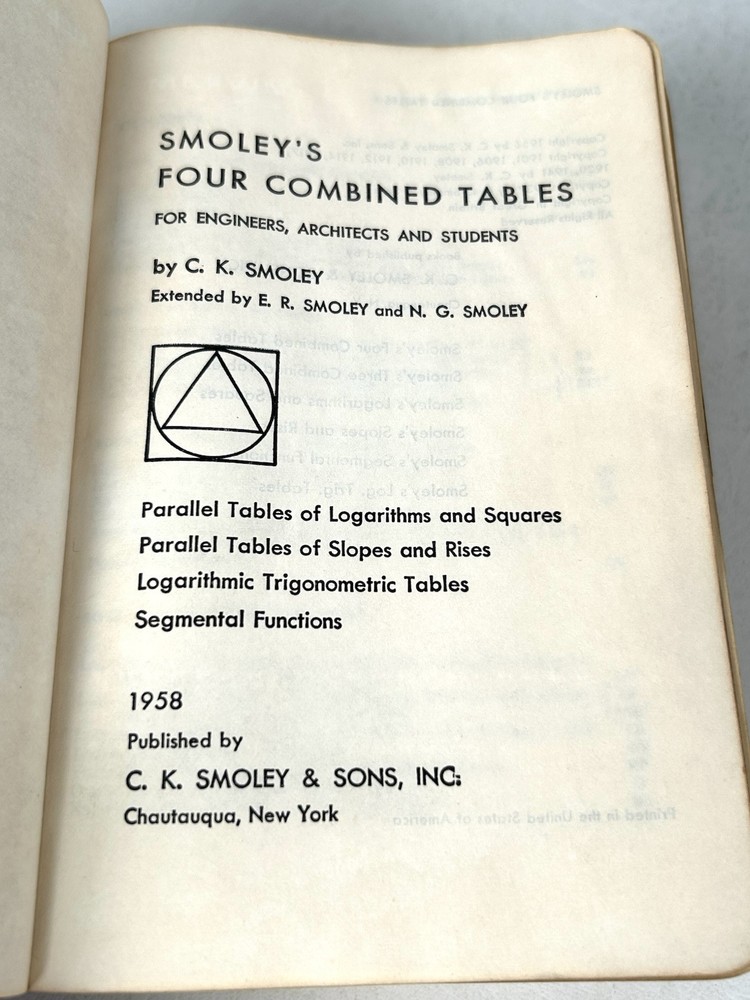This vintage textbook, "Smoley's Four Combined Tables" by C.K. Smoley, is a valuable resource for those studying applied mathematics, engineering, and technology. Published in 1958 by C.K. Smoley & Sons, this hardcover textbook is part of the Smoley's Mathematical Books series. The book is illustrated and contains four combined tables that are essential for those in architecture, mathematics, and engineering. The book is written in English and is intended for adult and further education. This textbook is a must-have for those who want to improve their technical skills and knowledge.