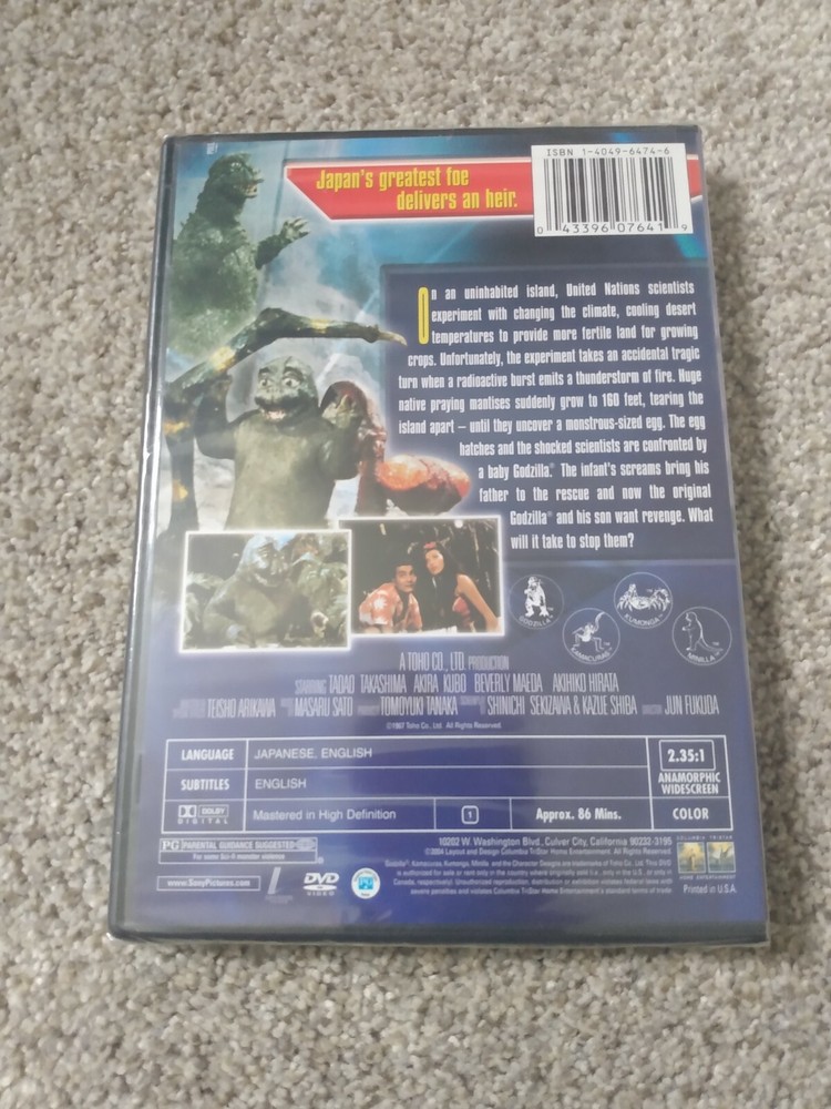 BRAND NEW AND STILL SEALED RARE AND LONG OUT OF PRINT The second in the "island" trilogy, SON OF GODZILLA opens with a group of scientists on a deserted island performing weather experiments; they soon discover that nuclear activity has mutated insects on the island into huge preying mantises. They courageously continue with their experiment until a horrible accident cause a radioactive storm, mutating the insects further, uncovering a giant egg, and summoning Godzilla. The egg hatches into a young monster that Godzilla takes under his wing, training it in the ways of proper monsterhood while battling the giant insects. Akira Kubo stars as an intrepid journalist who comes to the island in search of a story.