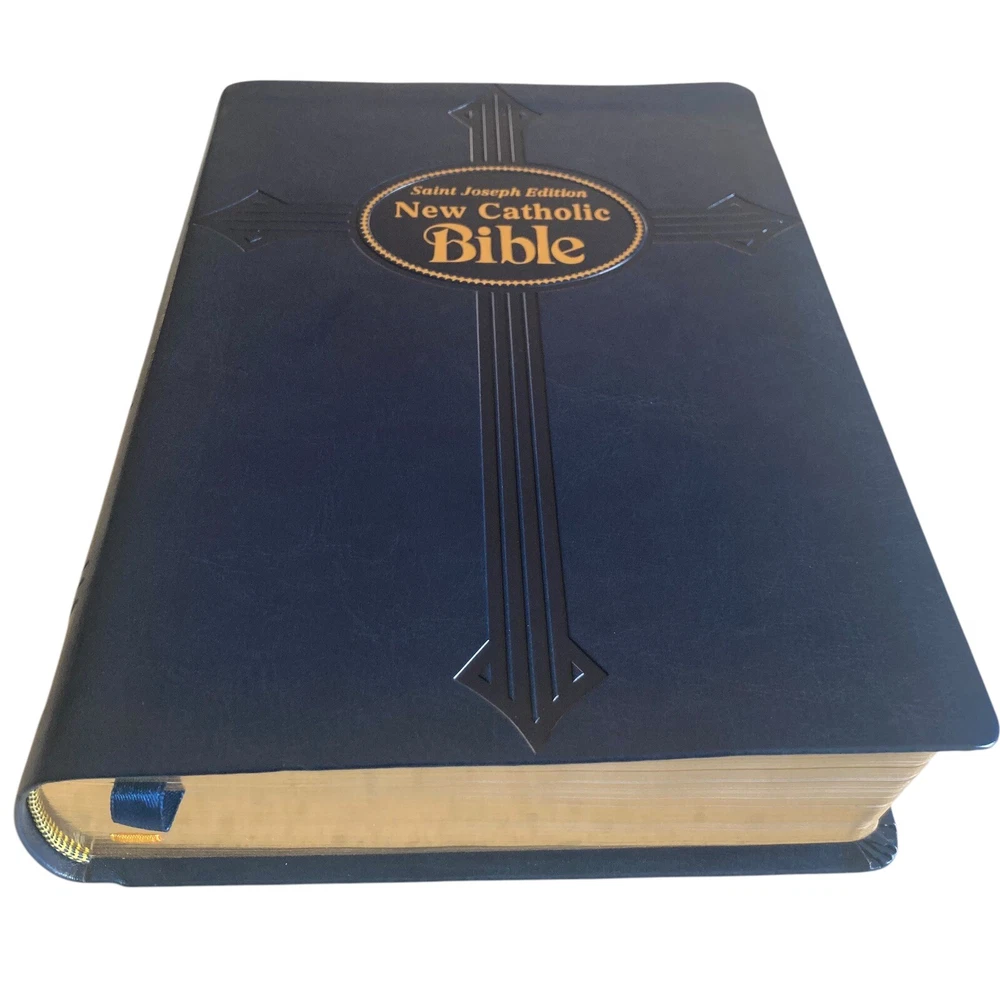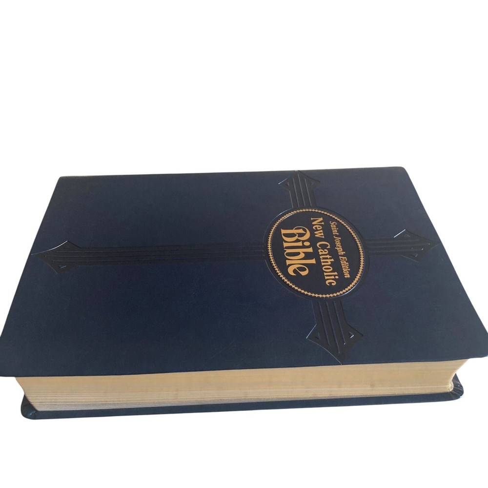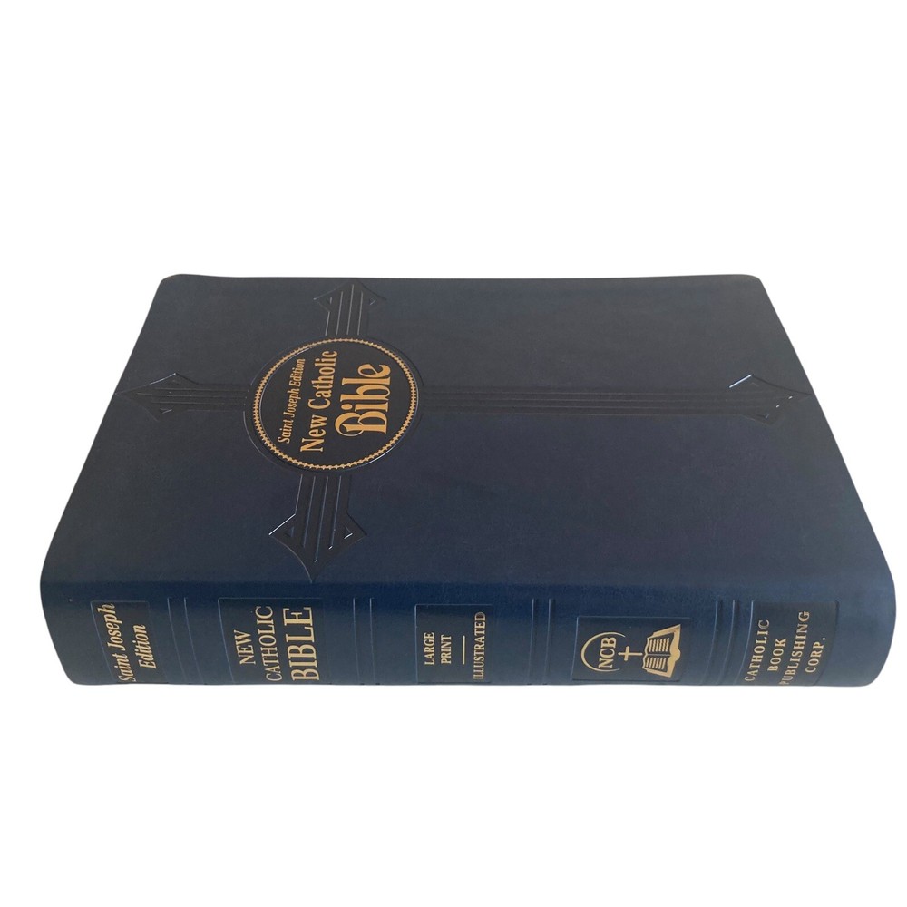 St. Joseph Edition New Catholic Bible Large Print Red Letter Gift Edition Blue Leather In excellent condition. Firm spine and clean pages. Presentation and family record page clean. This Bible appears to be unused.