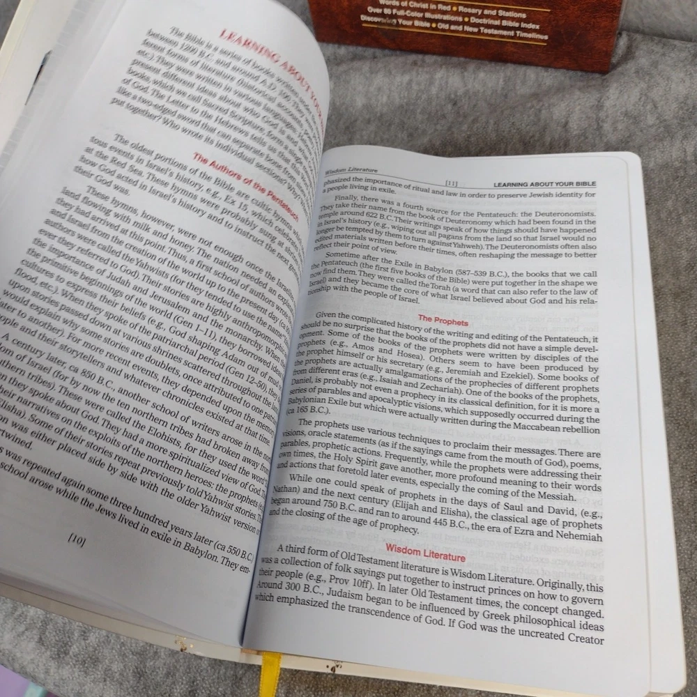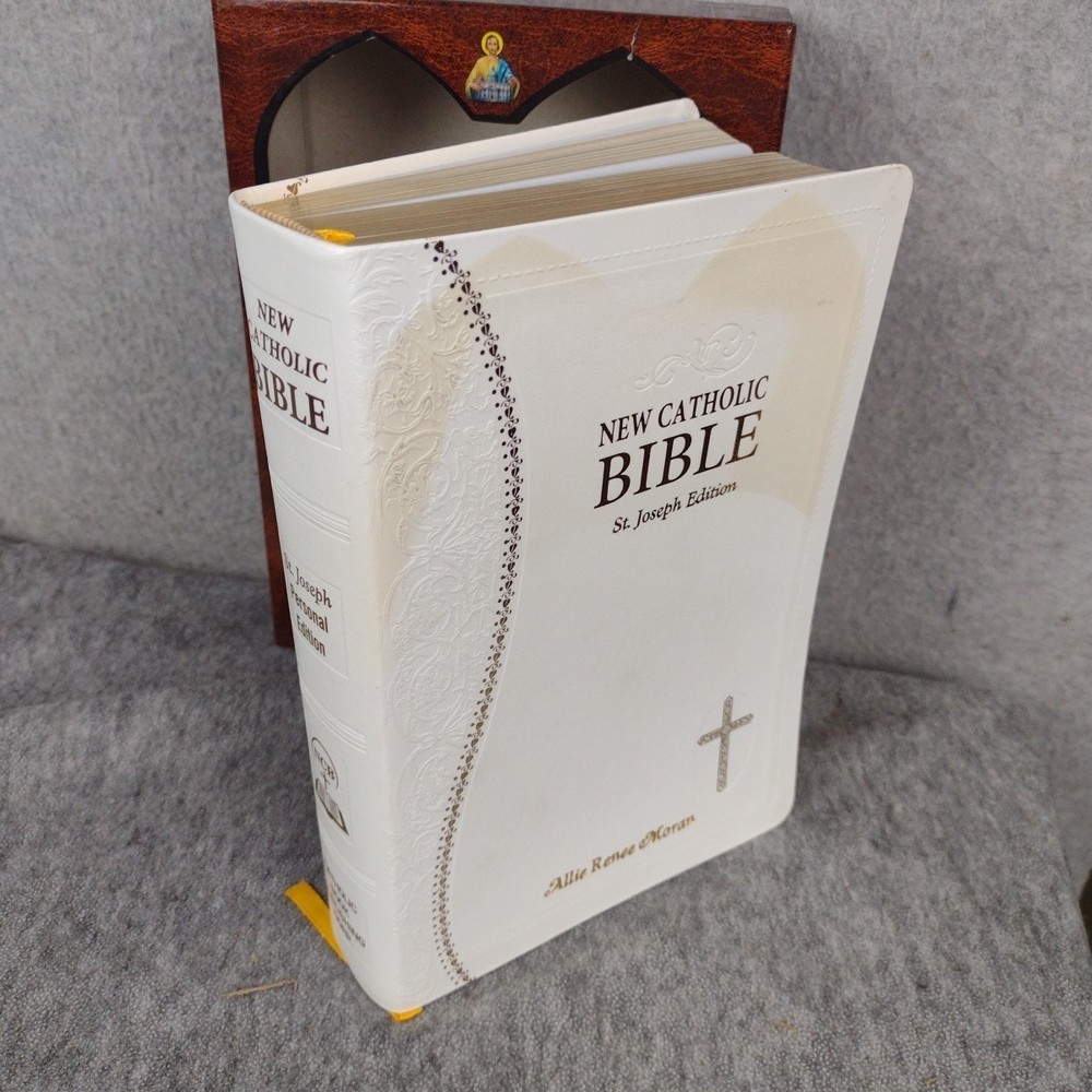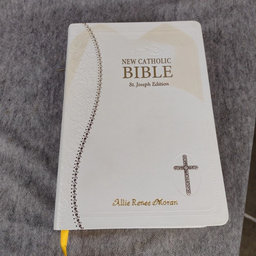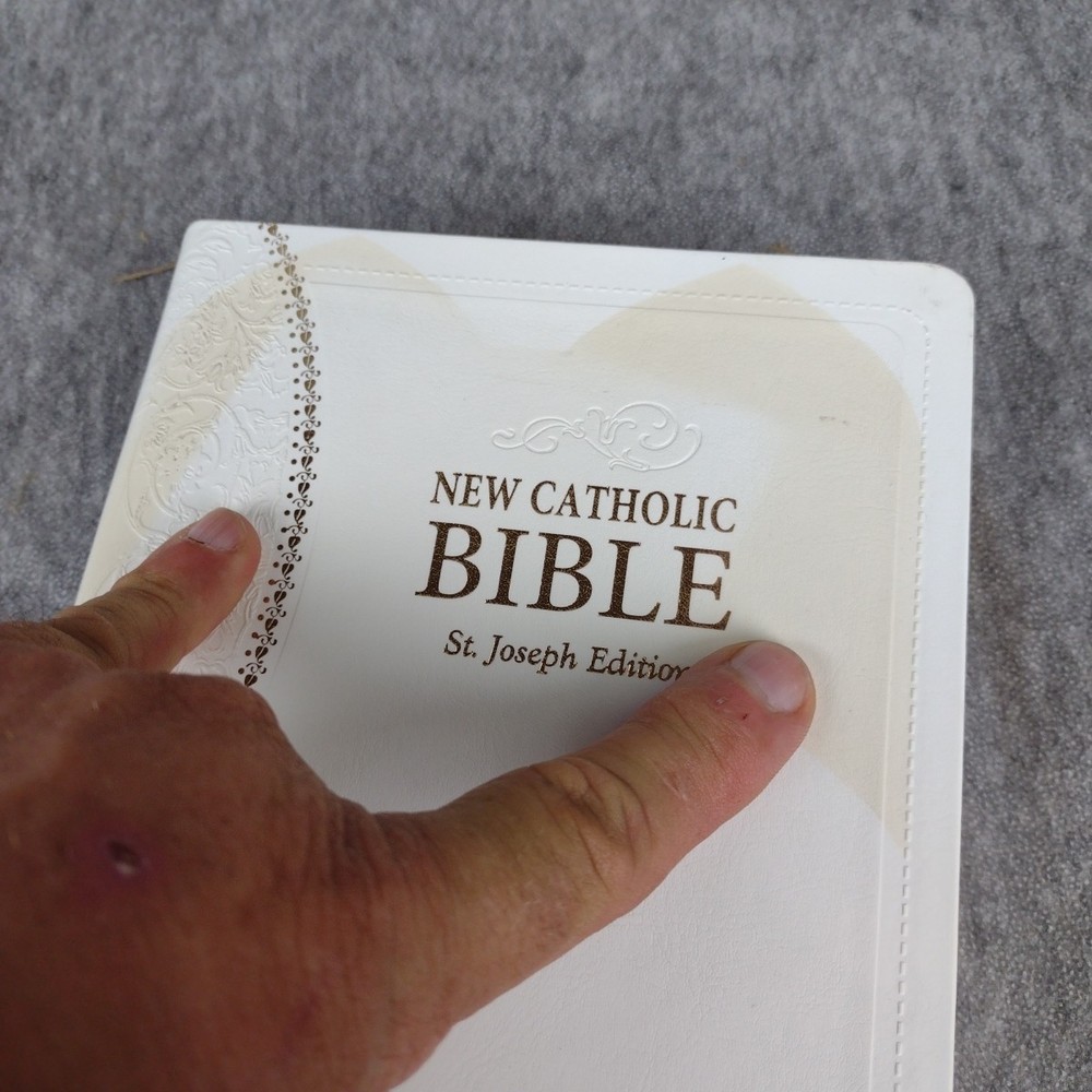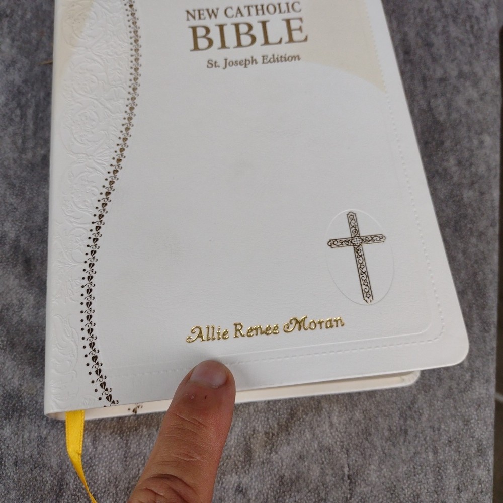 St. Joseph New Catholic Bible (Gift Edition - Personal Size) by Catholic Book Publishing Corp. (2021, Leather) Previous owner name imprinted on front cover, dedication page has writing. Stain/discoloration on top front cover, shown in pics. Content solid, no markings. See all photos and accept any imperfections before purchase. 3lbs media mail shipping Note: All Clothing items have been cleaned per eBay Standards and Policies.