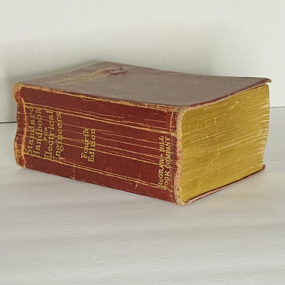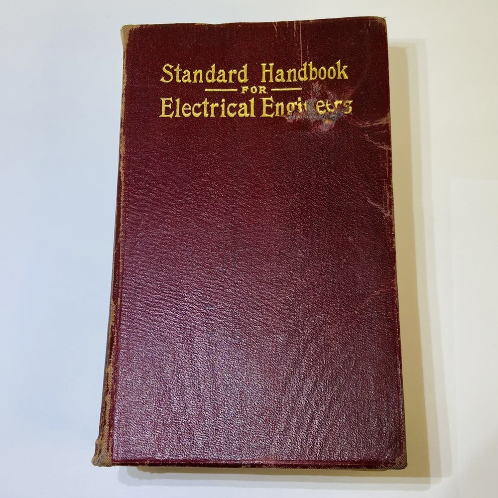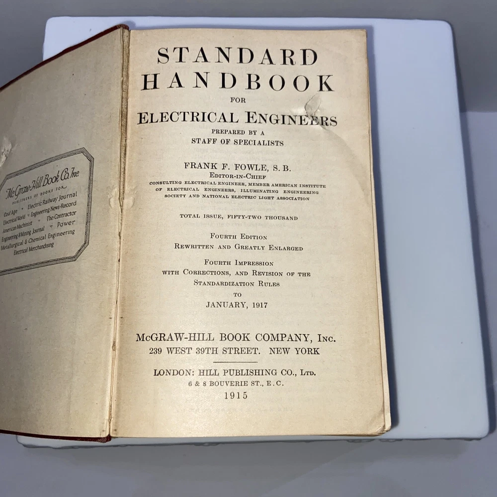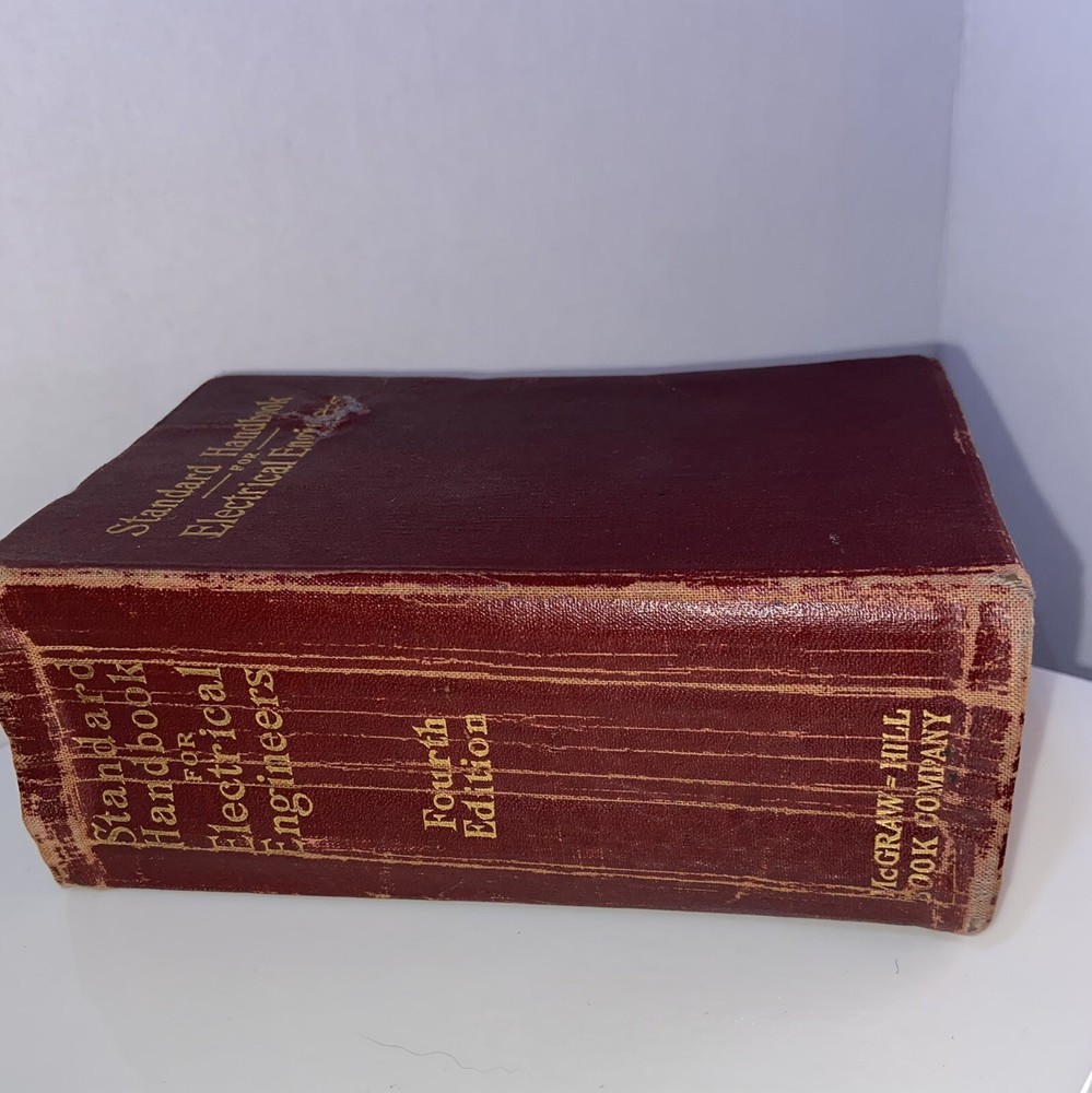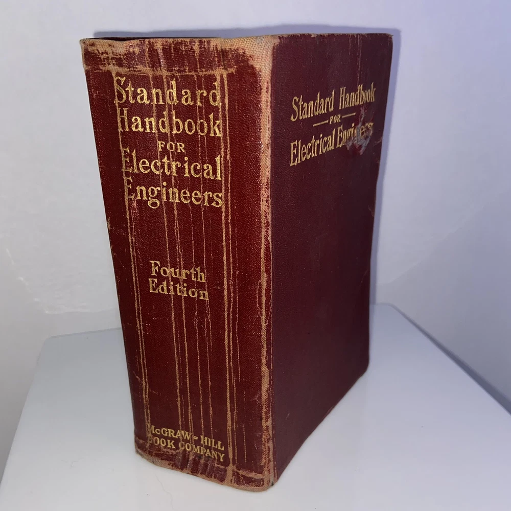 Standard Handbook For Electrical Engineers 4th edition 1917 McGraw Hill. Book cover is made of a painted fabric. Front cover has small piercing causing dents in pages up to 72. Yellowing of pages due to age. Name of owner written on inside front and inside back cover. All pages are intact and in good condition.