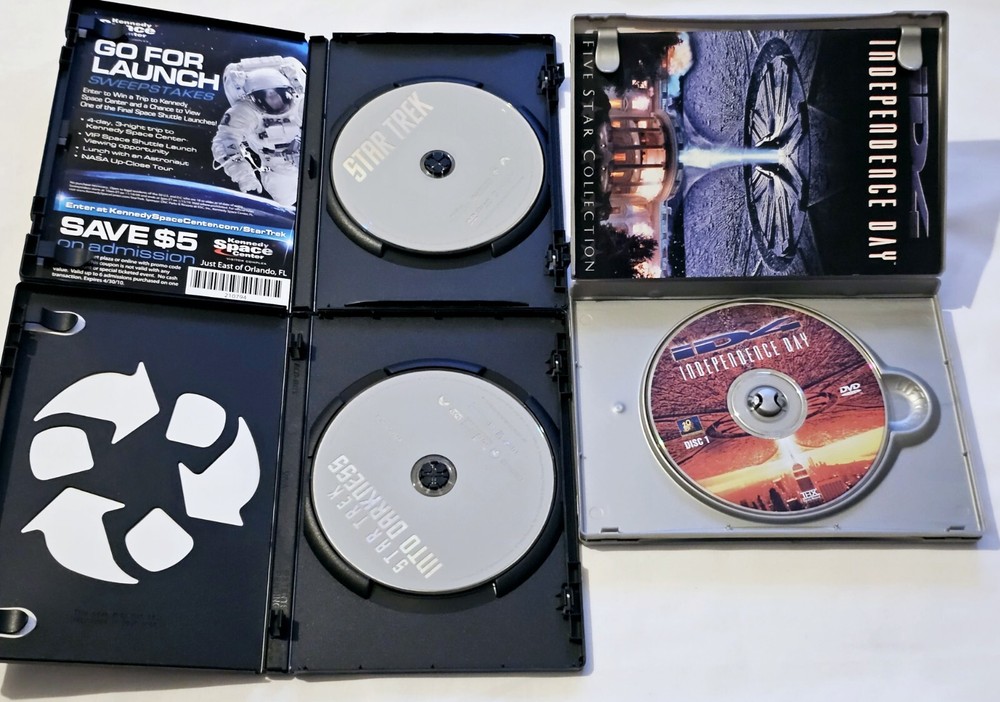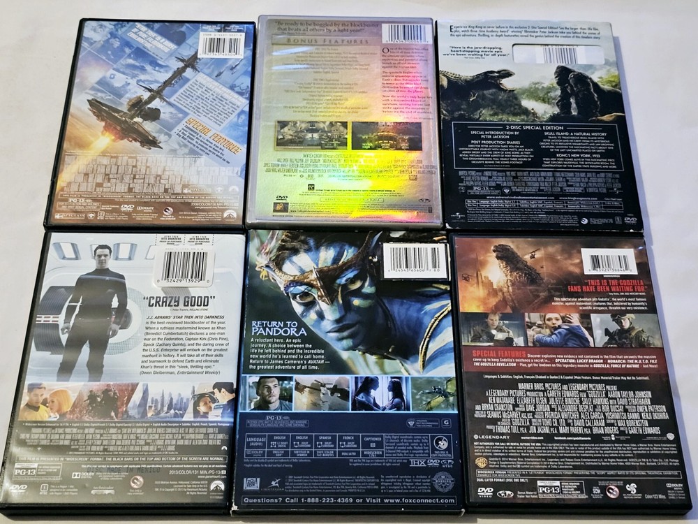 Get ready for an out-of-this-world movie marathon with this DVD lot featuring Star Trek, Star Trek Into Darkness, ID4, Avatar, Godzilla and King Kong. Immerse yourself in the sci-fi world of Star Trek with Chris Pine as the lead actor. Watch the epic battles between the Titans in Godzilla and King Kong, or be captivated by the stunning visuals of Avatar. This DVD lot includes movies in NTSC video format, with English language and DVD Region Code 1 (US, Canada...). The tall/DVD case provides easy storage for your collection. Perfect for fans of horror and sci-fi genres, this lot does not disappoint. All 6 are included, ships USPS Media Mail within one business day. Light wear on some of the cases. Most discs are in Very Good to Near Mint condition. Very minor wear if any. Any included codes are untested. (Bin loc SH1)