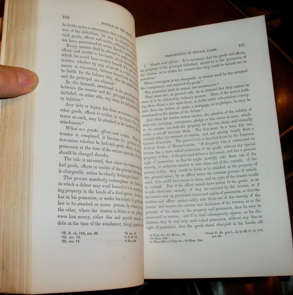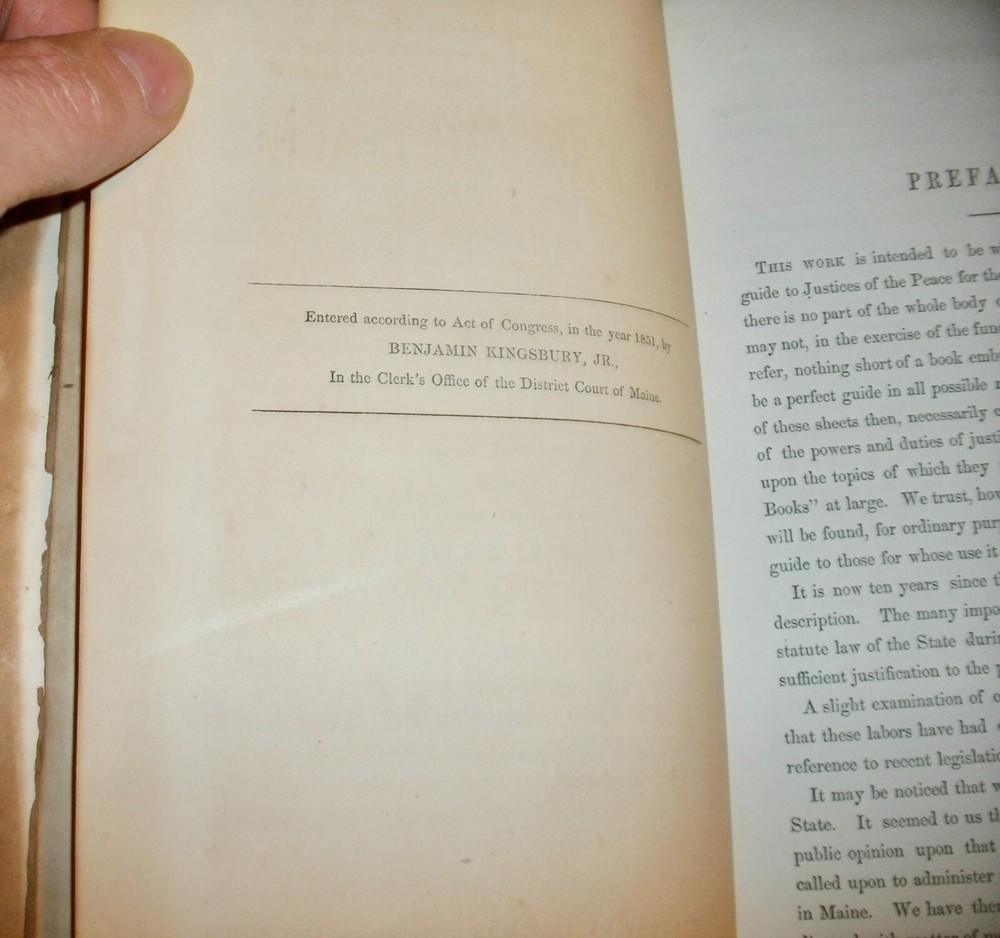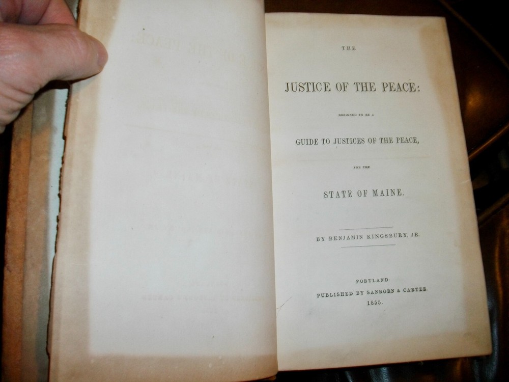 HB book, "The Justice of the Peace: designed to be a guide to justices of the peace, for the State of Maine", by Kingsbury, by Sanborn and Carter, 1855 (not sure of edition), 407 pages. Book is in decent shape, leather cover has wear, binding is cracking at front and back, name stamped in front, yellowing and age spots, clean pages. An interesting book.