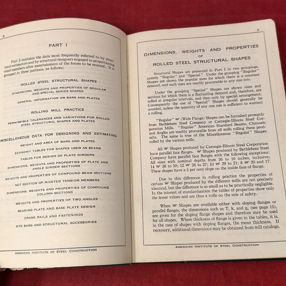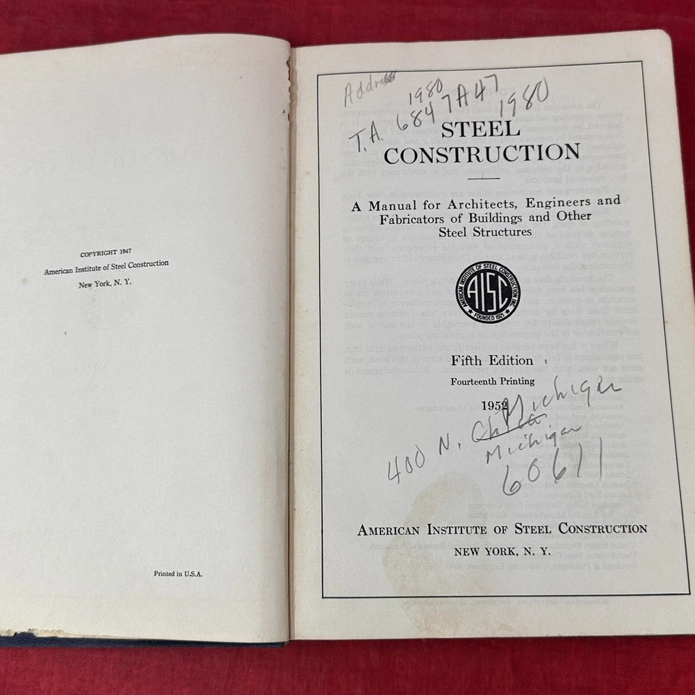 This is a Steel Construction Manual 5th Edition 14th Printing on a Leather Bound AISC Book from 1952