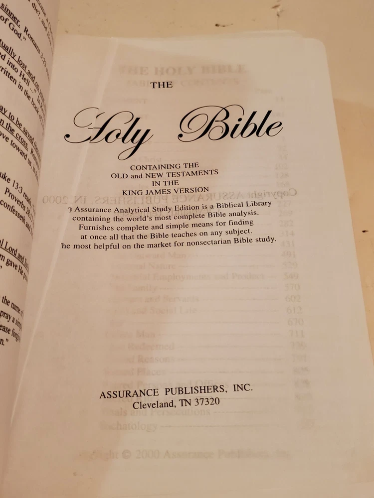This is a pre-owned Subject Bible Complete Topical Study Reference Edition KJV 2000 Assurance Publisher Holy Bible. Please see pics for condition. The shipping price is for the lower 48 States....