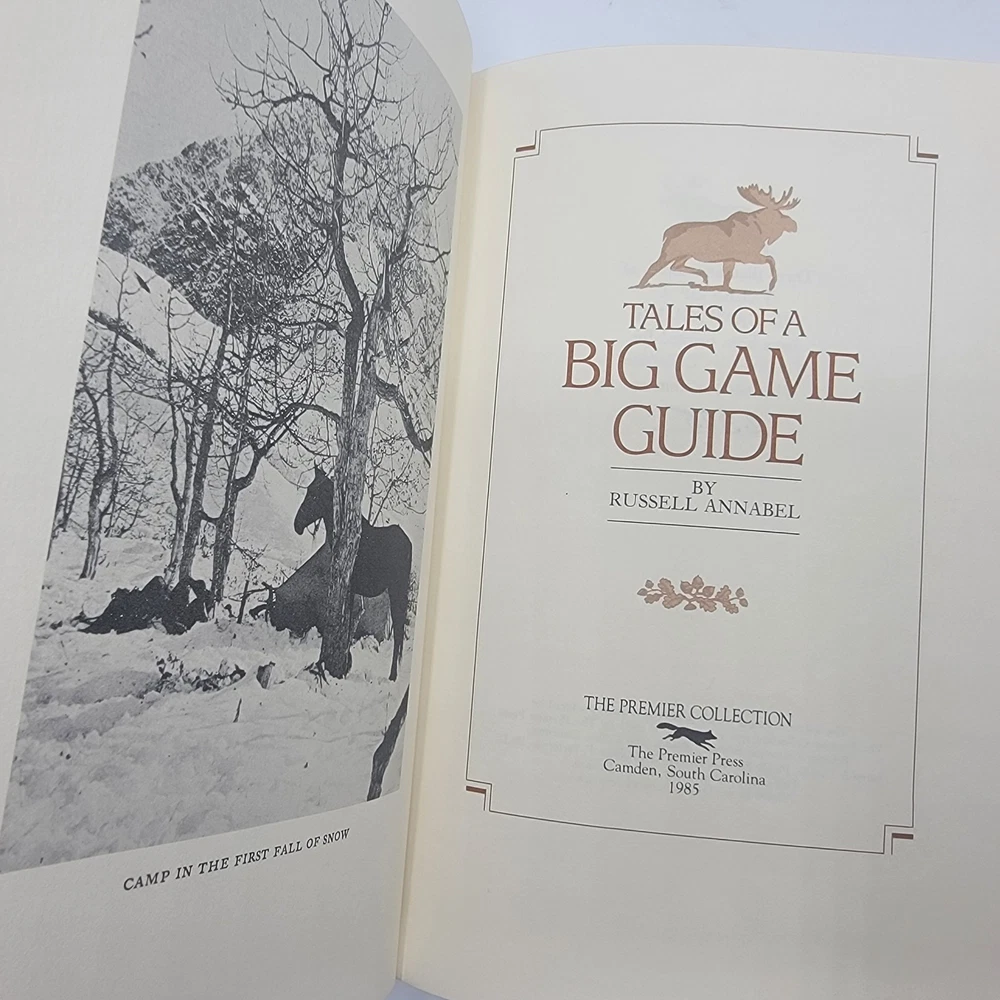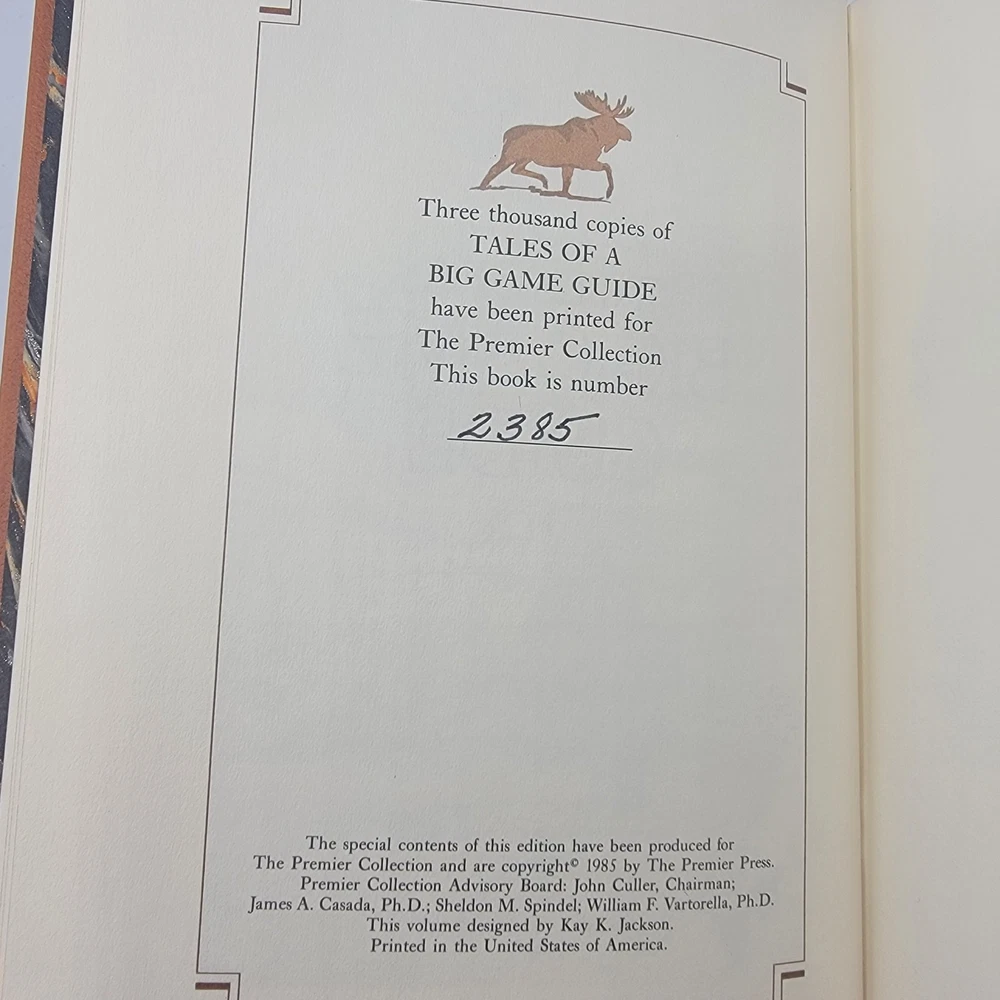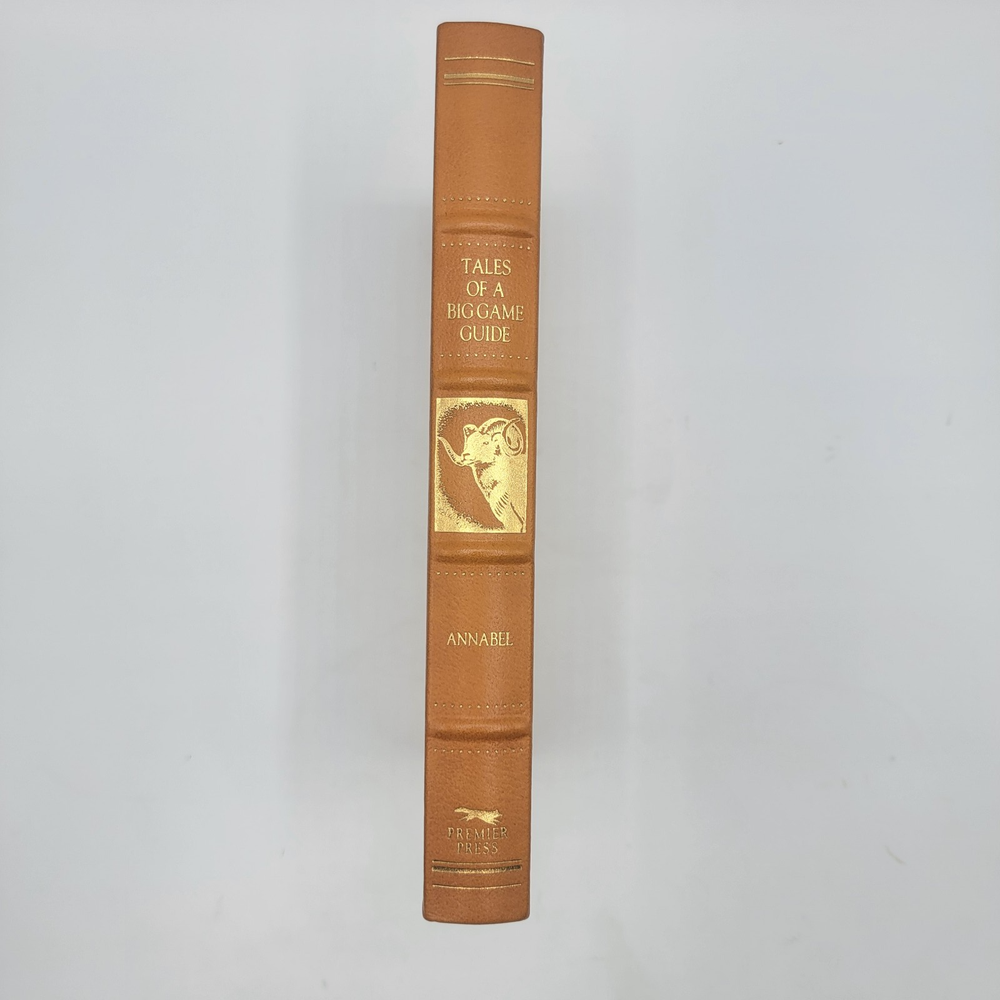 Tales of a Big Game Guide by Russell Annabel Limited Edition - Numbered 2385/3000 1985 Premier Press Premier Press, 1985. Limited Edition. Brown leather boards have 4 raised bands on the spine and gold gilt titling and illustration. Features include gold gilt edges and a satin ribbon. Front cover has rubbing to the leather, so I priced accordingly. Interior pages are clean, bright and tight. Shipped quickly, securely packaged with delivery confirmation. Save money with our combined shipping discounts!