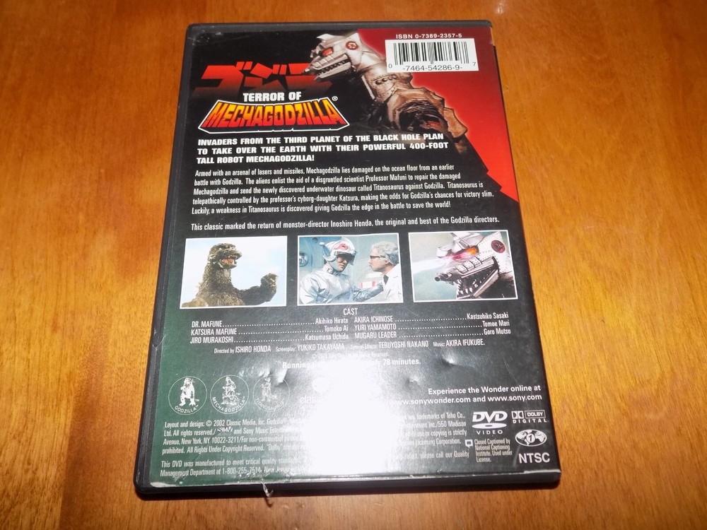 THIS IS AN UPDATE TO ALL MY CURRENT LISTINGS. -UNFORTUNATLEY, I SUFFERED A STROKE AND I AM RELYING ON MY FAMILY TO FIND, PACK AND SHIP THE INVENTORY. I FORMERLY HANDLED THE INVENTORY LOCATION BY MEMORY, AND YET HAVE NOT FOUND A WAY FOR THEM TO READ MY MIND. WE ALL WILL ENDEVOR TO LOCATE AND SHIP OUT AS FAST AS POSSIBLE. PLEASE BE GRACIOUS TO US DURING THIS PERIOD AS THERE IS NO POSITIVE CERTAINTY OF INVENTORY LOCATIONS. IF WE ARE EXPERIENCING DIFFICULTY FINDING YOUR PRODUCT, WE WILL COMMUNICATE VIA EBAY MESSAGES IN A TIMELY MANNER. IF WE CANNOT FIND THE PRODUCT YOU WILL RECEIVE A FULL REFUND. THANK YOU FOR UNDERSTANDING AND PLEASE CONSIDER THIS ISSUE BEFORE MAKING A PURCHASE. This a monster movie classic on DVD - titled "TERROR OF MECHAGODZILLA". The DVD is in VERY GOOD condition - disc has some minor blemish marks, plays perfectly - in the original case as pictured. Shipping and handling via U.S. Postal Media Mail is $4.95 and includes U.S. Postal Tracking. Thanks for looking!