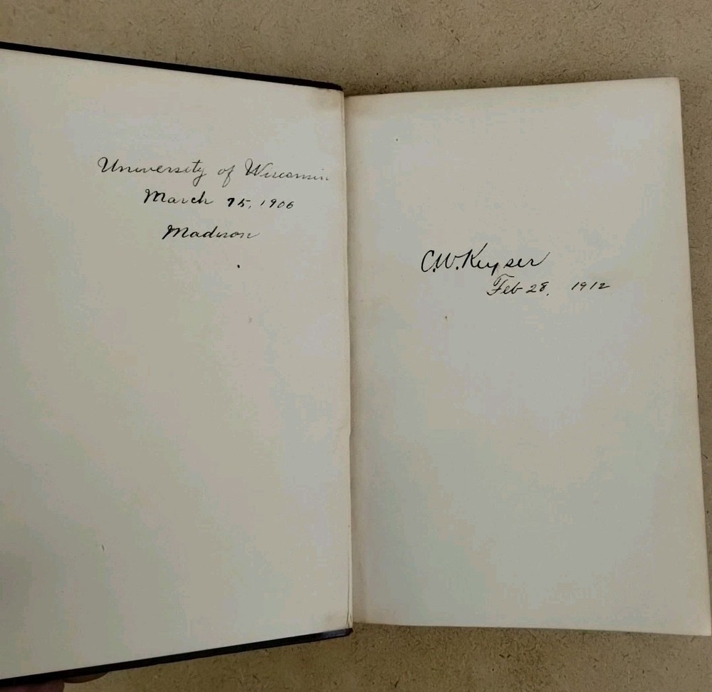 Leather spine very nice clean pages inside it is written and signed on the cover page University of Wisconsin 1906 with a name... No other marks in the book no water damage no bent pages very nice and clean book for your consideration.. solid binding