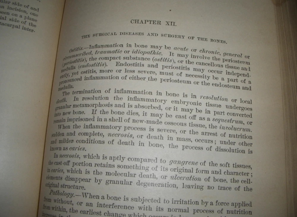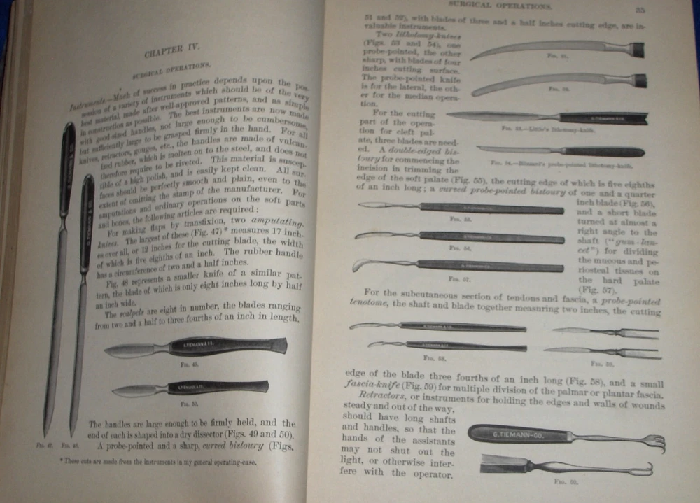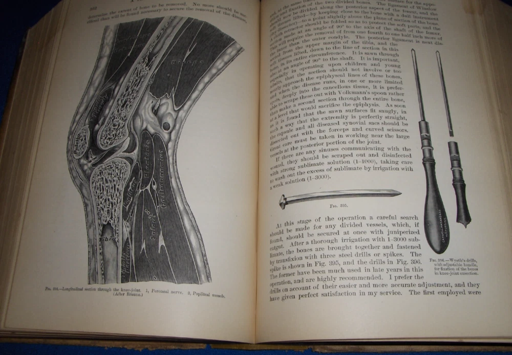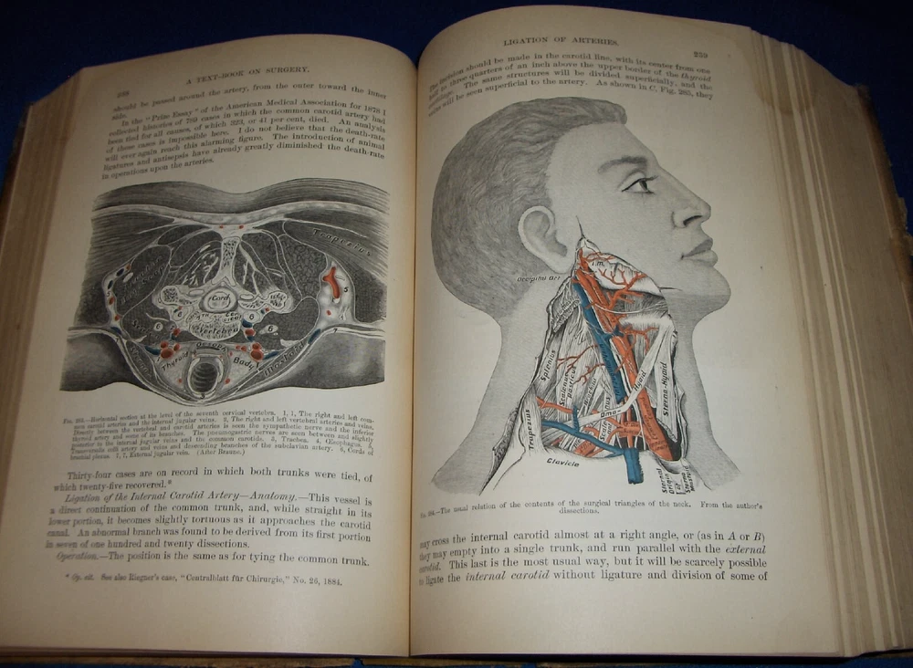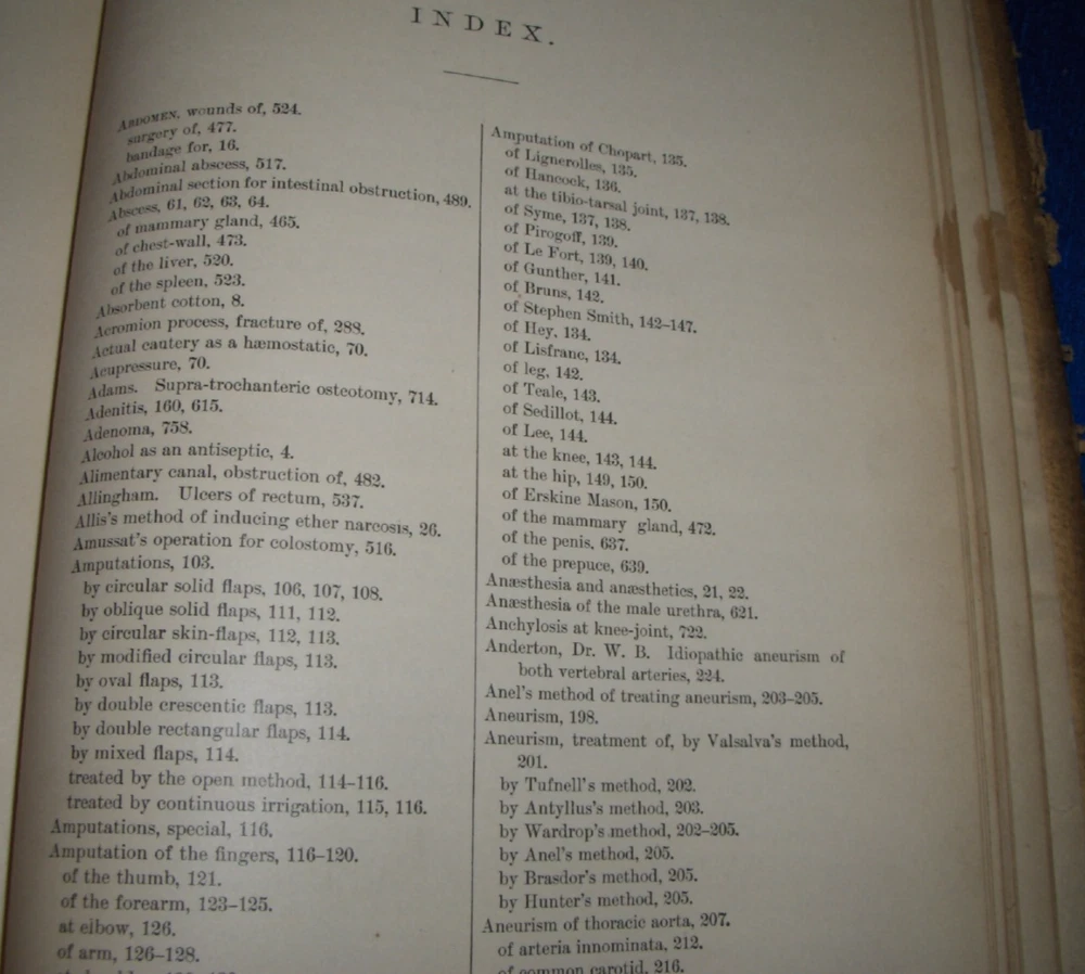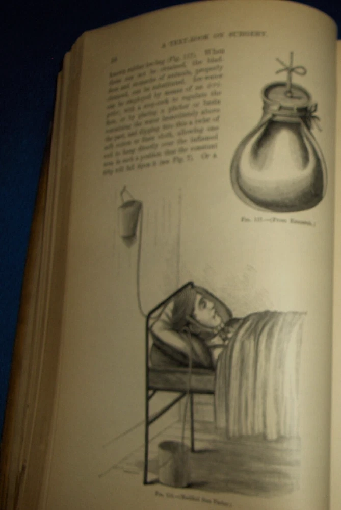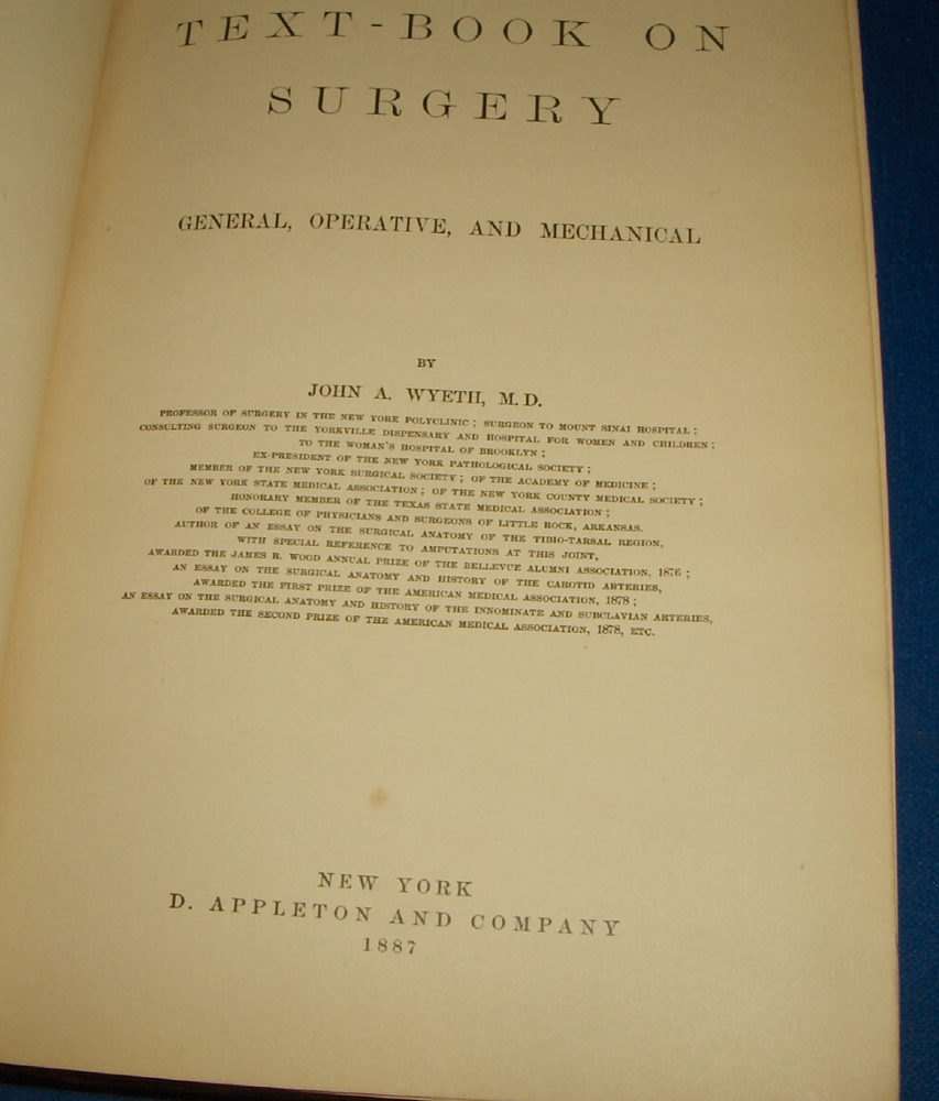 Up for auction is this leather bound Book titled " TEXT-BOOK ON SURGERY-General, Operative and Mechanical ", written by John A. Wyeth, MD, published by D. Appleton and Co., great illustrated Medical Surgery book with lots of detailed information on various types of Surgery, how to perform Surgery, Tools used, and much more with 100's of illustrations, book belonged to Dr. S. P. Wise, copyright 1887, 1st Edition, 777 pages including detailed Index plus a few pages of other Medical books by publisher, book size appx. 7 3/8" x 10 3/8". C ondition: Book leather covers show some edge, spine and corner wear, some soiling, corners bumped with some fraying along edges and at corners, covers have some scuffs/scratches, some of spine cover is missing at top, some fraying along edges of spine, contents are complete and VG with light edge and corner wear, light water stain on some pages mostly in blank boarders, pages have light browning/foxing around edges, will find a few tiny edge/corner creases, light musty/smoky smell due to poor storage. Overall: Book G to near G+ due to leather wear on covers. INTERESTING MEDICAL BOOK ABOUT VARIOUS TYPES OF SURGERY FROM NE OHIO ESTATE CHECK OUR OTHER AUCTIONS FOR PHOTOGRAPHY, LETTERS, MILITARY ITEMS, BOOKS, MAGAZINES, CATALOGS, ADVERTISING, GERMAN LANGUAGE BOOKS AND PAPER ITEMS, PAPER COLLECTABLES, AND OTHER ITEMS FROM 1820'S-2000'S