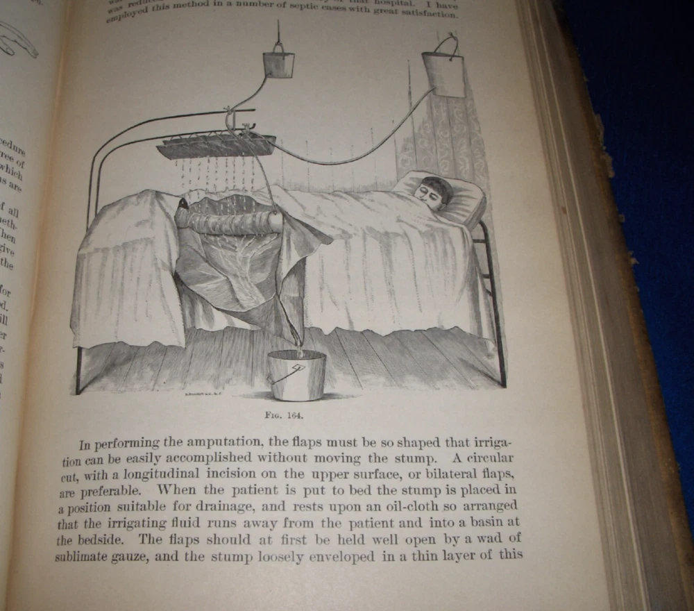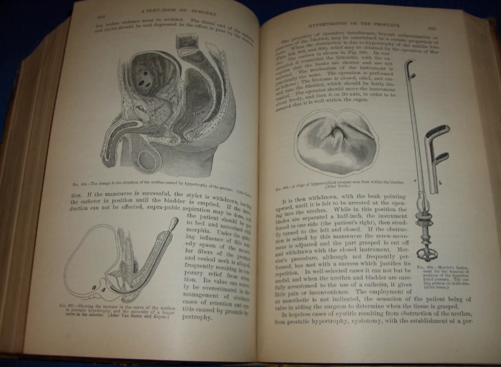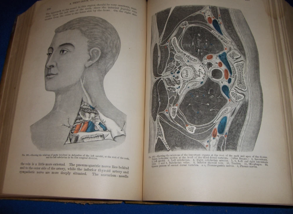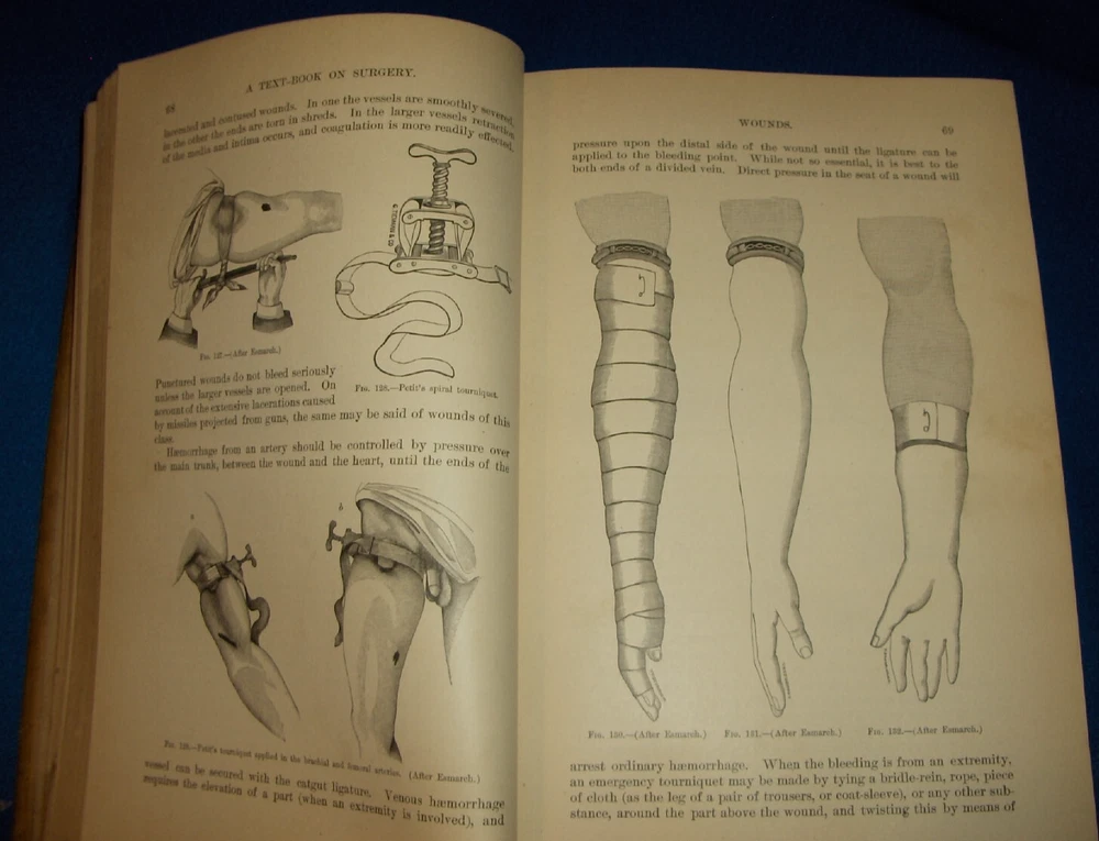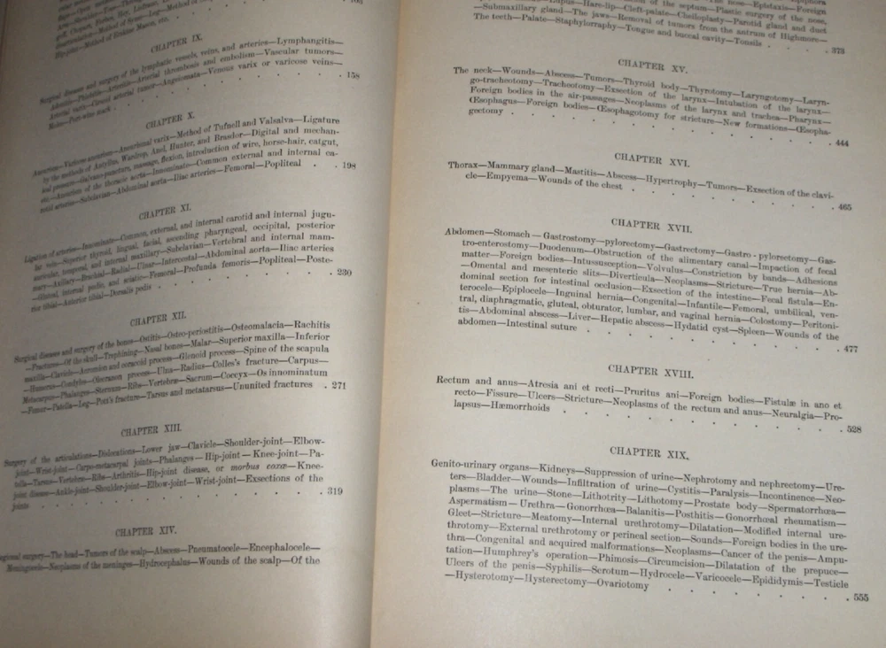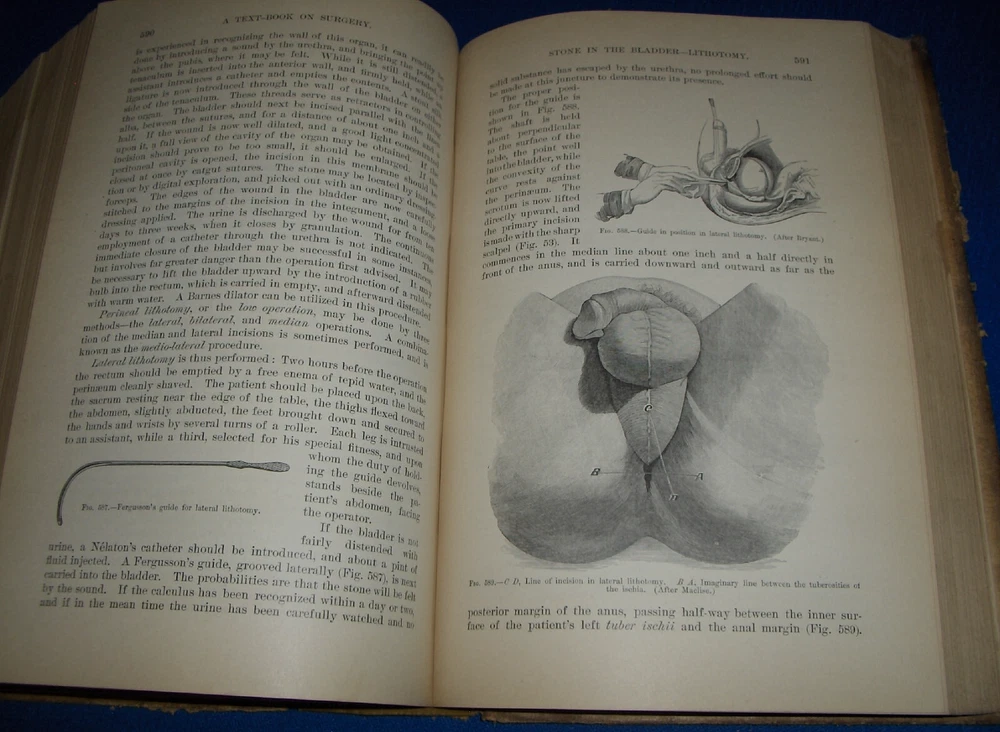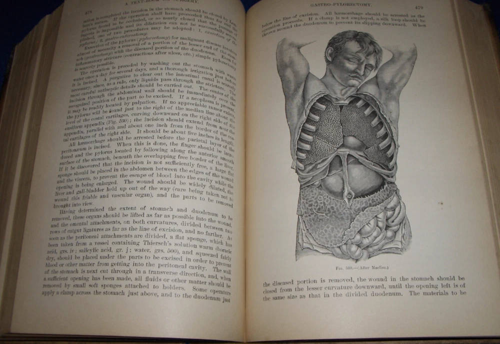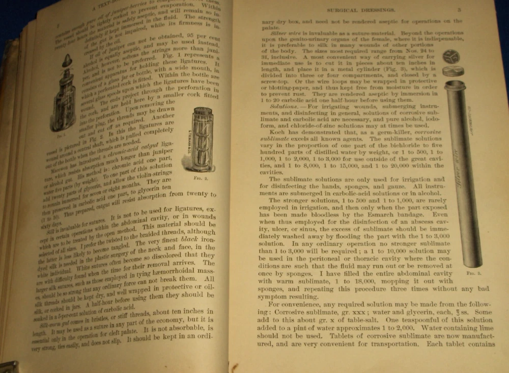 Up for auction is this leather bound Book titled " TEXT-BOOK ON SURGERY-General, Operative and Mechanical ", written by John A. Wyeth, MD, published by D. Appleton and Co., great illustrated Medical Surgery book with lots of detailed information on various types of Surgery, how to perform Surgery, Tools used, and much more with 100's of illustrations, book belonged to Dr. S. P. Wise, copyright 1887, 1st Edition, 777 pages including detailed Index plus a few pages of other Medical books by publisher, book size appx. 7 3/8" x 10 3/8". C ondition: Book leather covers show some edge, spine and corner wear, some soiling, corners bumped with some fraying along edges and at corners, covers have some scuffs/scratches, some of spine cover is missing at top, some fraying along edges of spine, contents are complete and VG with light edge and corner wear, light water stain on some pages mostly in blank boarders, pages have light browning/foxing around edges, will find a few tiny edge/corner creases, light musty/smoky smell due to poor storage. Overall: Book G to near G+ due to leather wear on covers. INTERESTING MEDICAL BOOK ABOUT VARIOUS TYPES OF SURGERY FROM NE OHIO ESTATE CHECK OUR OTHER AUCTIONS FOR PHOTOGRAPHY, LETTERS, MILITARY ITEMS, BOOKS, MAGAZINES, CATALOGS, ADVERTISING, GERMAN LANGUAGE BOOKS AND PAPER ITEMS, PAPER COLLECTABLES, AND OTHER ITEMS FROM 1820'S-2000'S