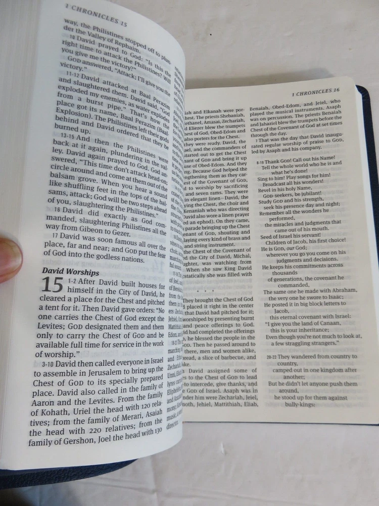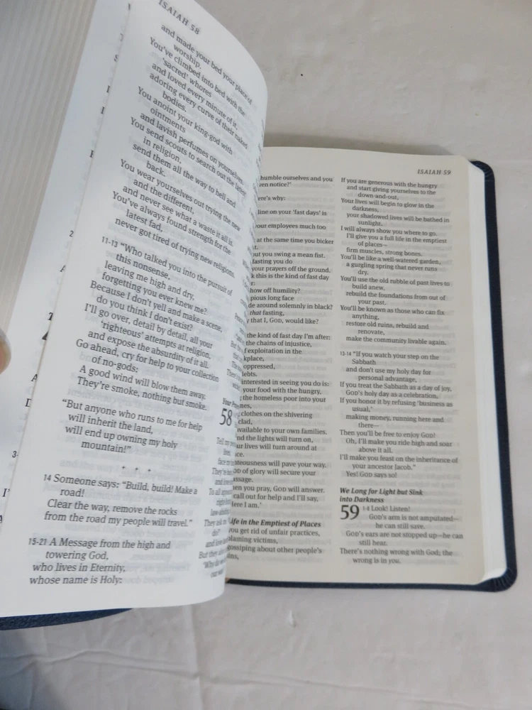 This Bible is absolutely stunning—the blue faux leather cover feels luxurious, and the large print makes reading so comfortable. The Message translation is fresh and easy to understand, perfect for daily devotion or study. It's well-made, lightweight, and a joy to carry. Highly recommend for anyone looking for a beautiful, readable Bible!