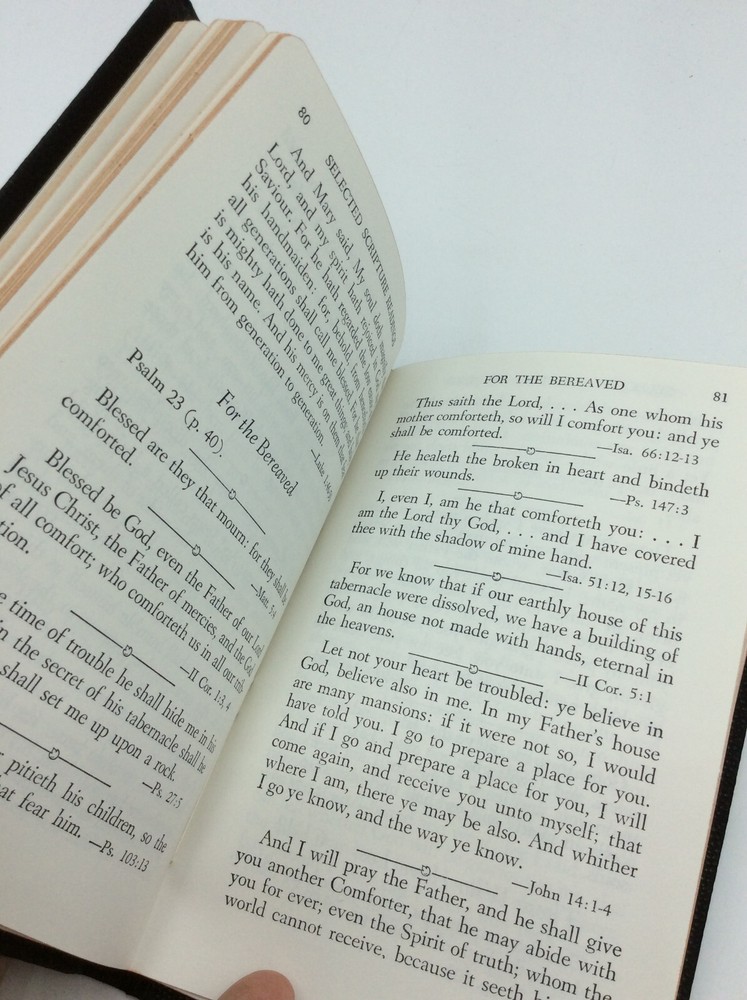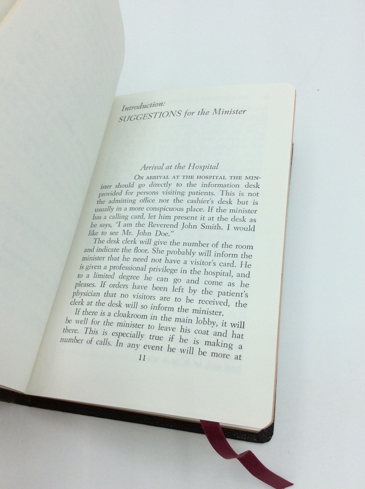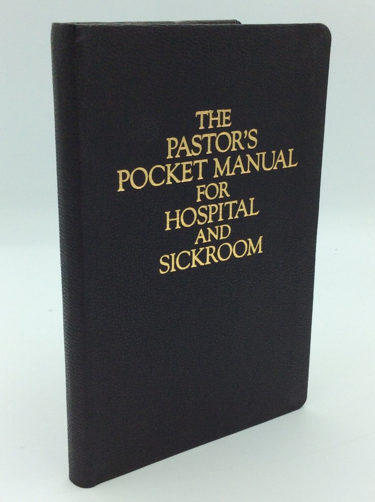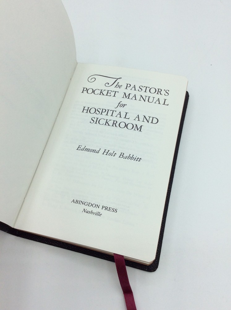 THE PASTOR'S POCKET MANUAL FOR HOSPITAL AND SICKROOM by Edmind Holt Babbitt Nashville: Abingdon Press, 1987. 16th printing. Leather. 160p. A small, flexible hardcover book bound in black leather with an attached ribbon bookmark. Like new except for an owner's stamps on the endpapers and title page. Item #191271 ISBN: 0687302668 Measures approx. 6.25" x 4.25"