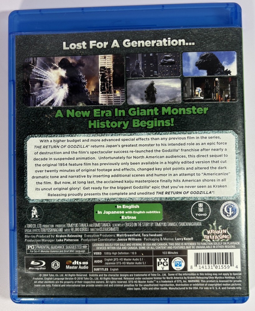This listing is for Godzilla 1984: The Return of Godzilla , directed by Koji Hashimoto for Toho. Released by Kraken Releasing in 2016, this Blu-ray edition features the original Japanese version of the iconic kaiju film, the first film in the Heisei series, fully restored and presented in high definition. The outer case shows some shelf wear, including minor scuffs and scratches (see pictures) Item Grading: VG+ (See Grading Guide below) Please contact us if you need additional details. We're happy to combine shipping for multiple purchases. Thank you for looking! Grading Guide: Brand New (New): An item that has never been opened or removed from the manufacturer's seal. Like New/Mint (M) : A pre-owned item that appears brand new. The disc is in perfect condition with no visible wear, scratches, or scuffs. The case and inserts are in excellent condition with no pressure marks, tears, or damage. While the case may show extremely light shelf wear, such as minor scuffs, it is otherwise flawless. Very Good (VG): This is a used item in excellent working condition with minimal signs of wear. The disc may have very light scuffs that do not affect playback. The case and inserts are free of cracks, tears, or holes but may show light scuffs or wear. All cover art and inserts are included. Good (G): A used item that functions as intended but shows moderate wear. The disc may have noticeable scuffs or light scratches but remains fully playable. The case and inserts may show scuffs, minor cracks, or other signs of wear. Some inserts or cover art may be missing, but major elements are present. Acceptable (Worn): This is a heavily used item with visible wear and potential cosmetic or functional issues. The disc may have multiple scuffs or scratches but still plays through without skipping. The case and inserts may show significant wear, including scuffs, cracks, broken hub teeth, or missing parts. Cover art or inserts may be incomplete or absent.