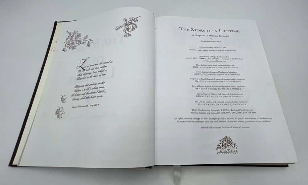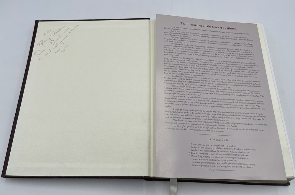 THE STORY OF A LIFETIME by Pamela and Stephen Pavuk LEATHER Bound Guided Memoir. Book is in good condition Does have an inscription from previous owner on the back of the cover. Does show minor shelf wear on the corners but is in overall good condition Please see pictures FREE SHIPPING