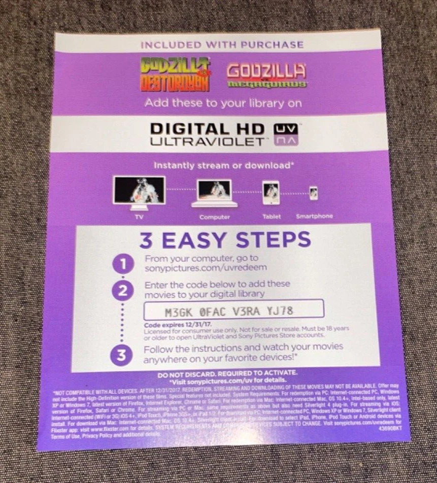 Item: The toho Godzilla Collection: Godzilla Destroyer, Godzilla Megaguirus Label: Sony (2-disc set with insert) UPC: 043396436909 Director: Takao Okawara / Mazaki Tezuka Country of release: USA (2014) Condition: Near mint Postage (tracking number): E verywhere: $15.00 Combined shipping possible, overpaid postage will be refunded. European sales include 21% Dutch VAT.