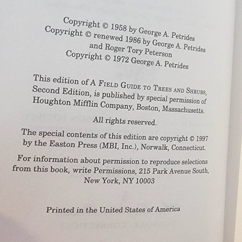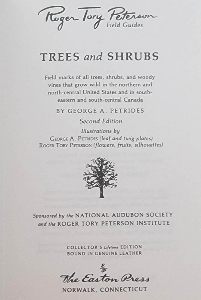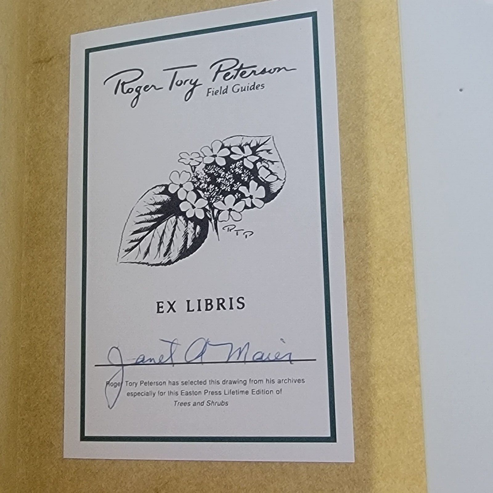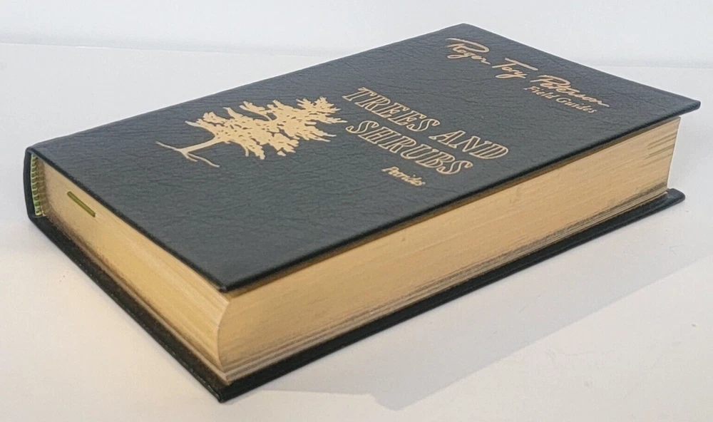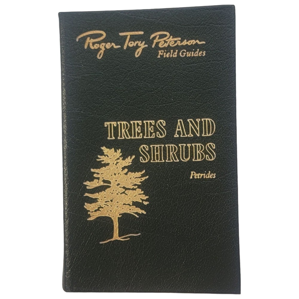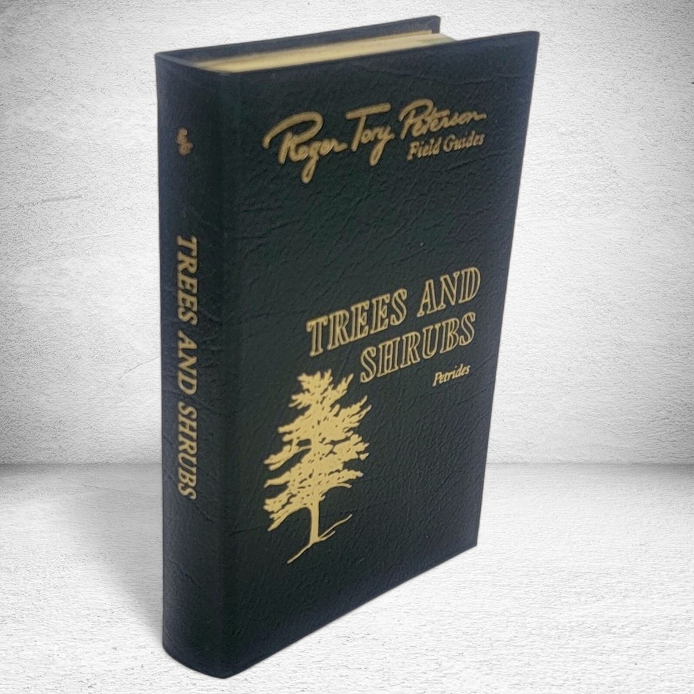 Trees and Shrubs by George A. Petrides Second Edition Illustrations by George A. Petrides (leaf and twig plates) & Roger Tory Peterson (flowers, fruits silhouettes) Roger Tory Peterson Field Guides EASTON PRESS Collector's Lifetime Edition bound in genuine leather Sponsored by the National Audubon Society and the Roger Tory Peterson Institute Easton Press, 1986. Minimal shelf wear and rubbing. Previous owner label on FFEP. Beautifully decorated green leather boards with gold gilt and a satin ribbon. A solid, collectible copy.